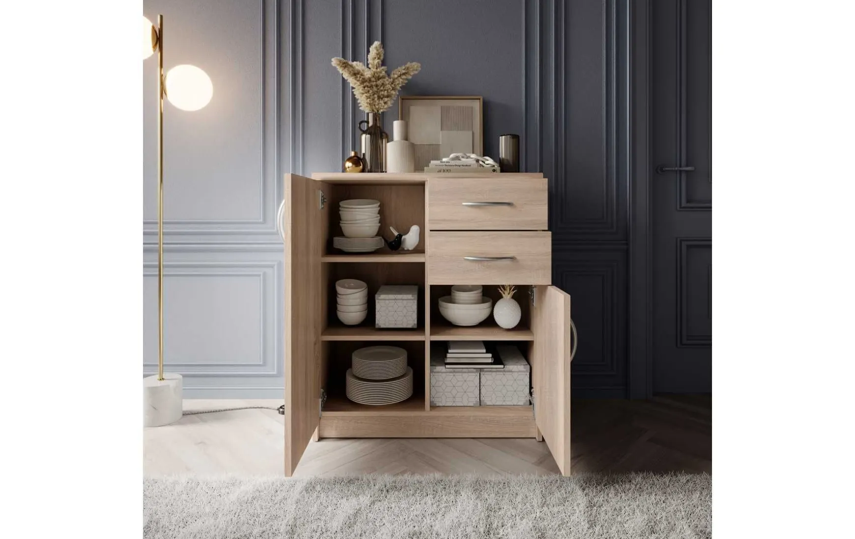 Mit ihrem schlichten aber zeitlos elegantem Design mit Dekor in Eiche Sonoma fügt sich diese Kommode in jeden Wohnraum hervorragend ein. Hinter den beiden Türen verbergen sich insgesamt 3 höhenverstellbare Einlegeböden, die in Kombination mit den beiden Schubladen viel Stauraum bieten.