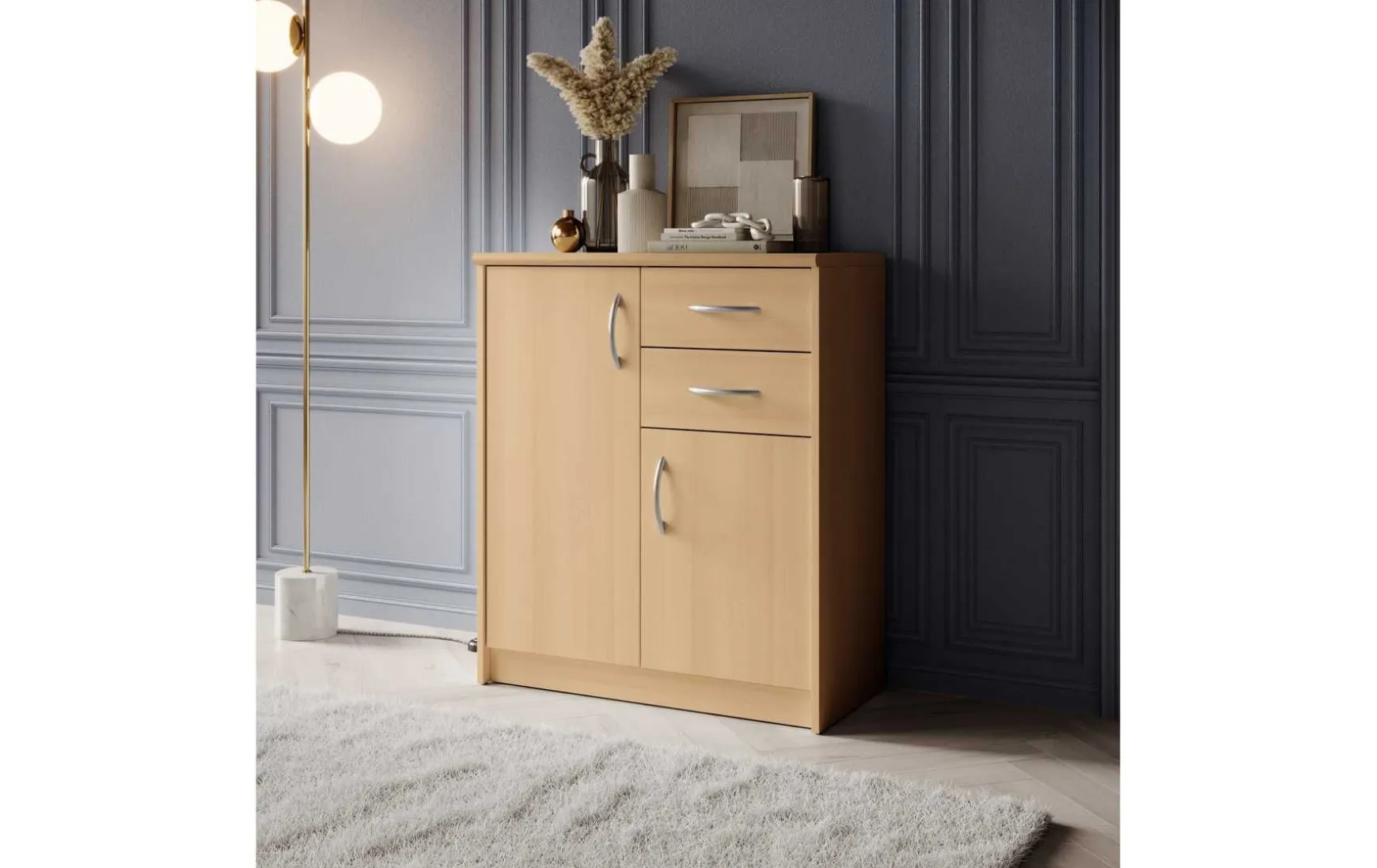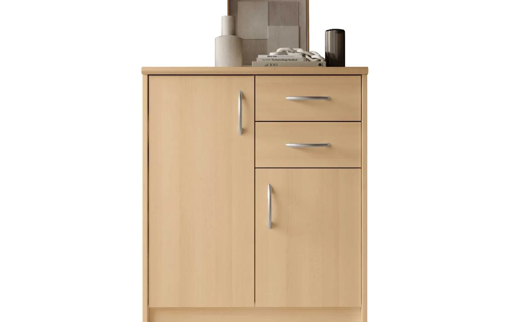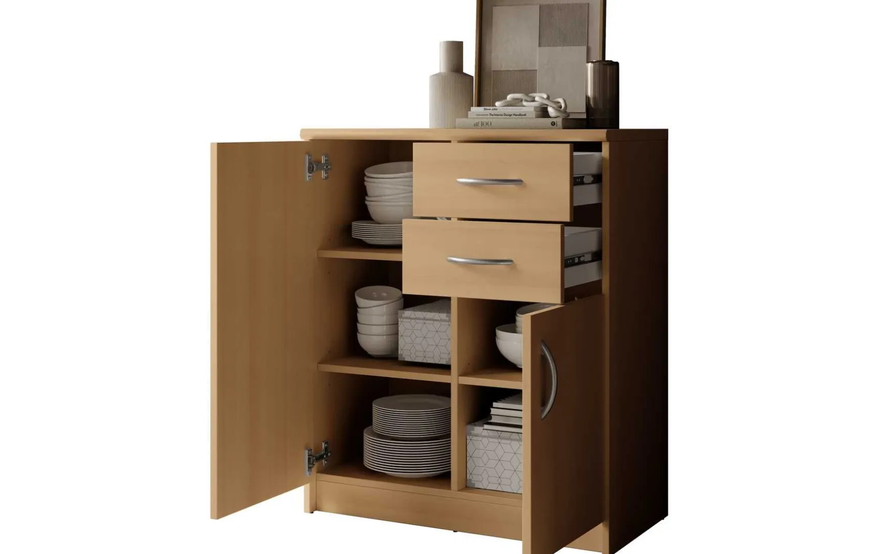 Mit ihrem schlichten aber zeitlos elegantem Design mit Dekor in Buche fügt sich diese Kommode in jeden Wohnraum hervorragend ein. Hinter den beiden Türen verbergen sich insgesamt 3 höhenverstellbare Einlegeböden, die in Kombination mit den beiden Schubladen viel Stauraum bieten.