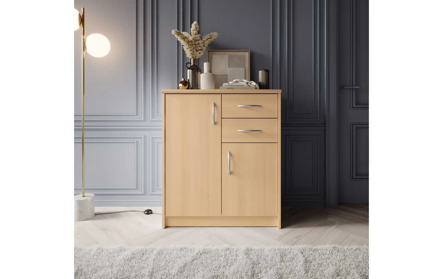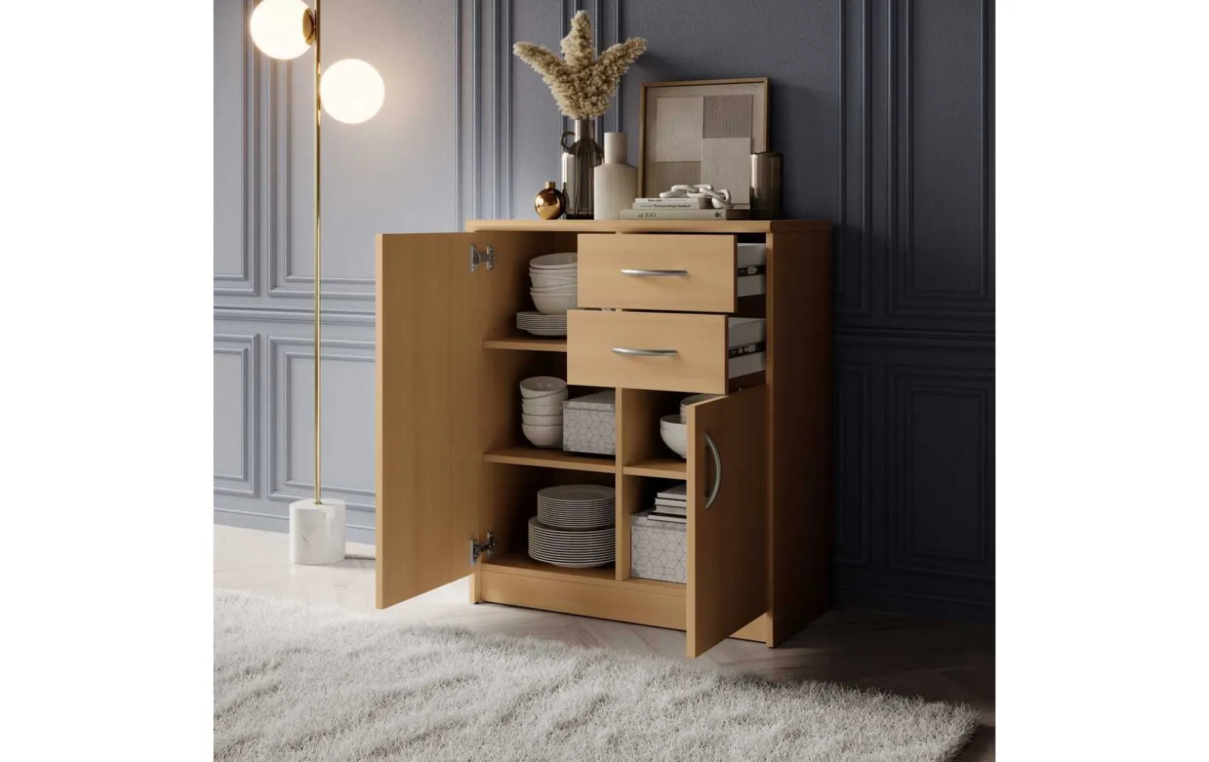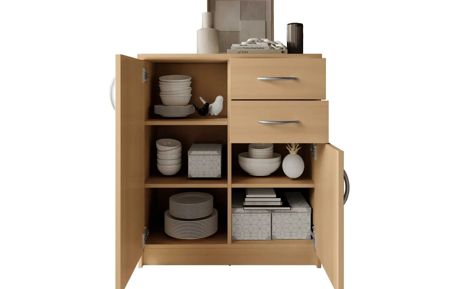 Mit ihrem schlichten aber zeitlos elegantem Design mit Dekor in Buche fügt sich diese Kommode in jeden Wohnraum hervorragend ein. Hinter den beiden Türen verbergen sich insgesamt 3 höhenverstellbare Einlegeböden, die in Kombination mit den beiden Schubladen viel Stauraum bieten.