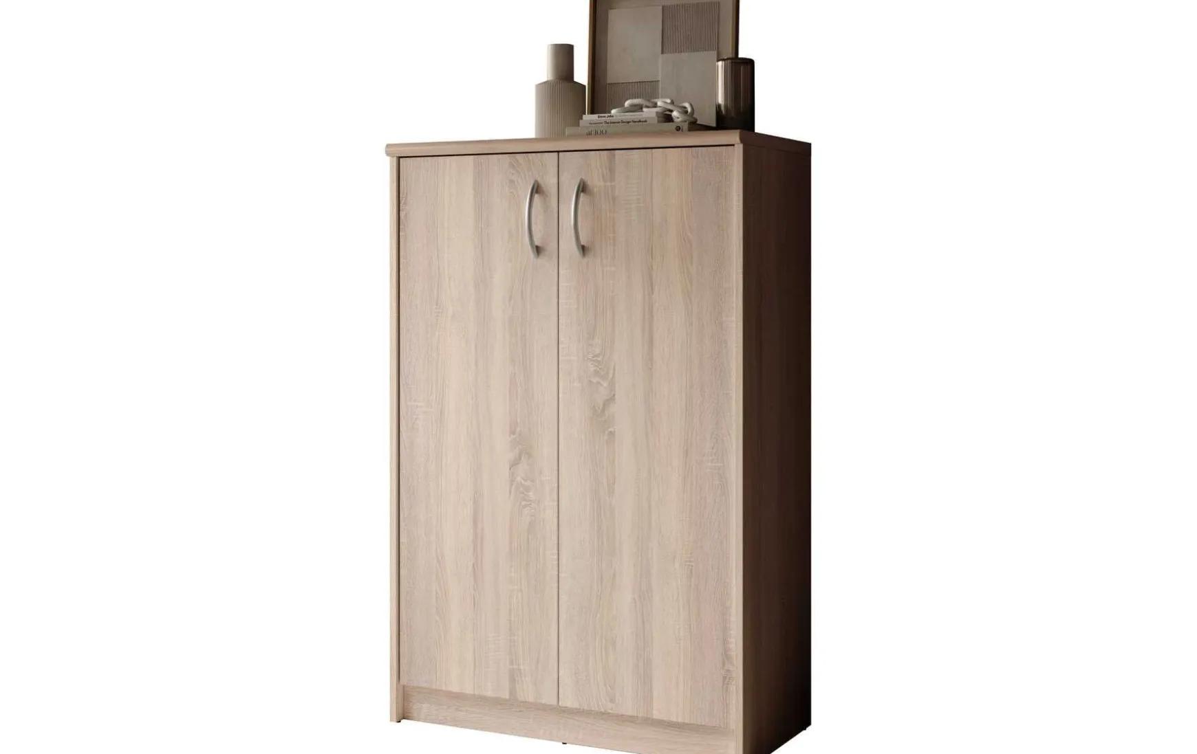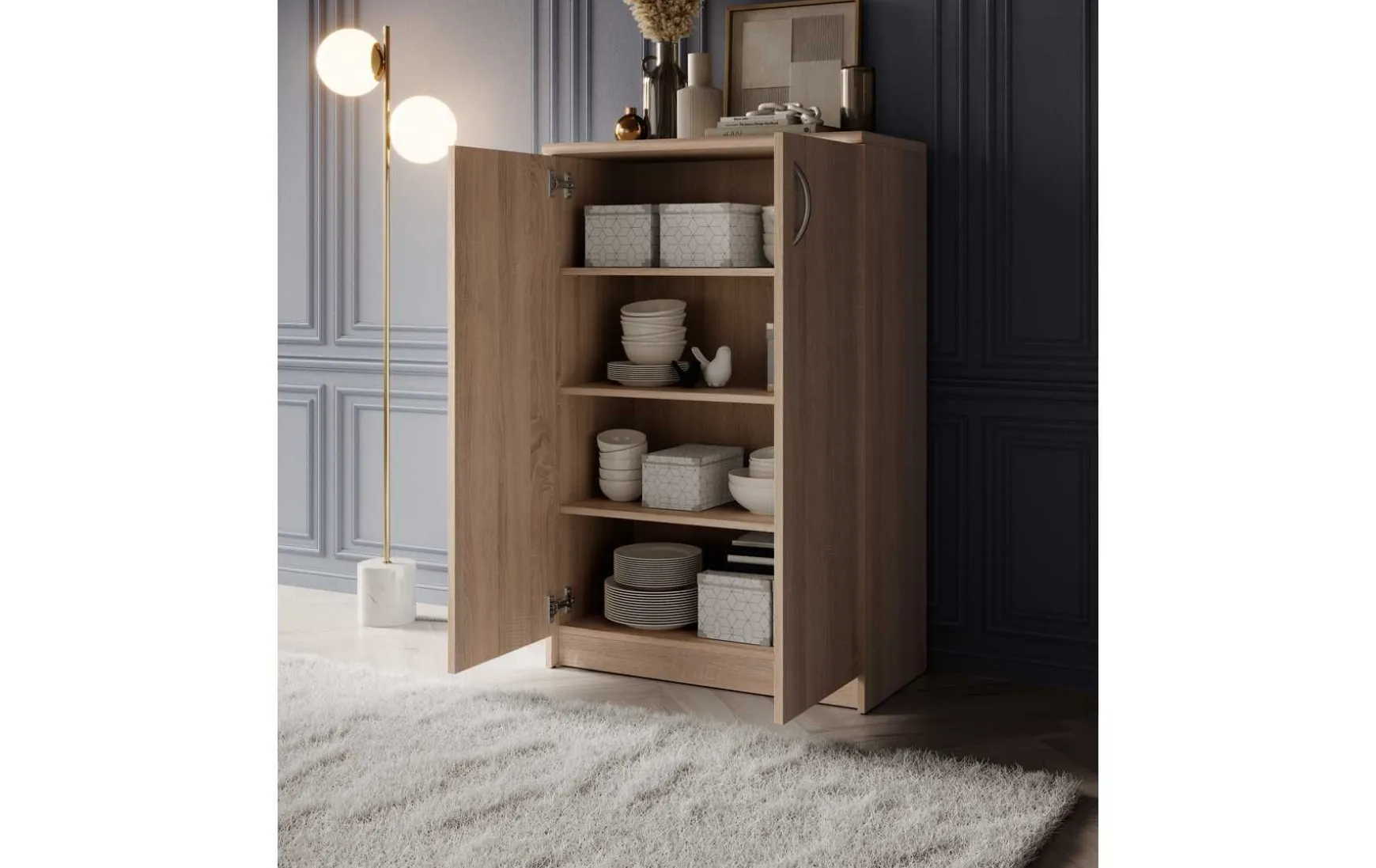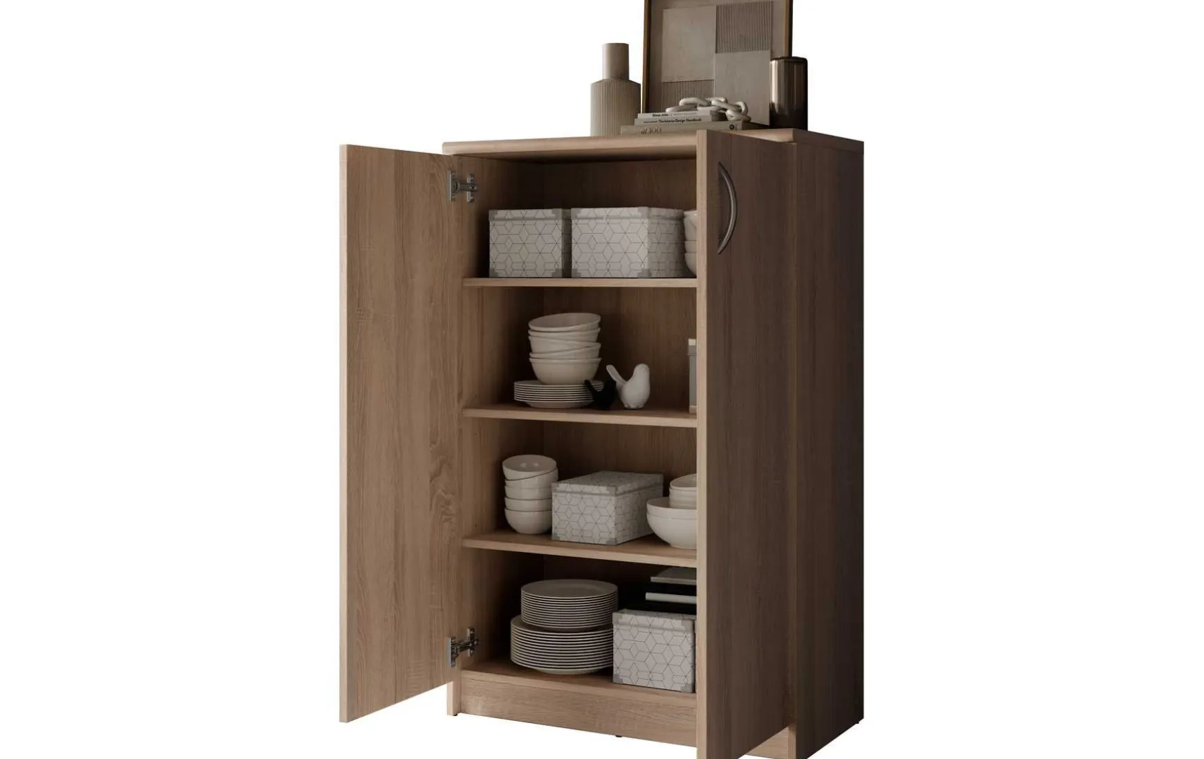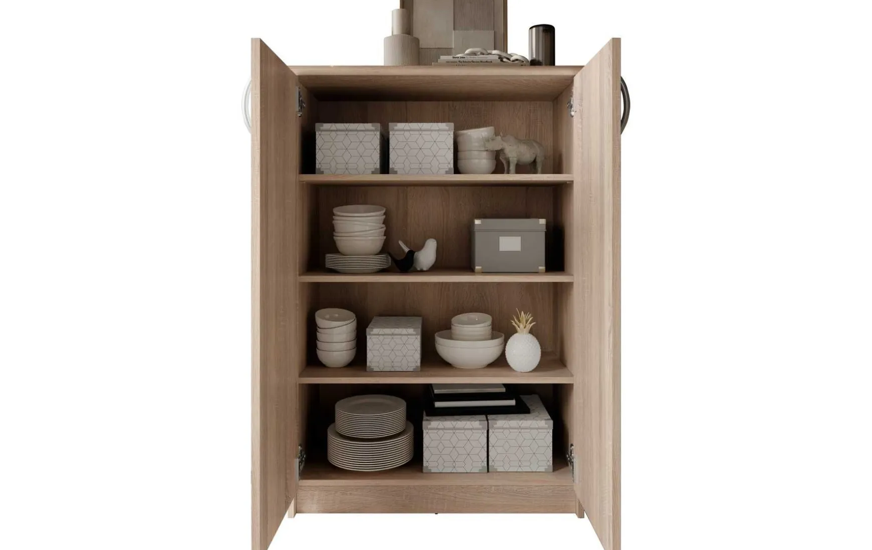 Mit ihrem schlichten aber zeitlos elegantem Design mit Dekor in Eiche Sonoma fügt sich diese Kommode in jeden Wohnraum hervorragend ein. Hinter der Doppeltür verbirgt sich ein großer Stauraum, der durch 3 höhenverstellbare Einlegeböden unterteilt wird.