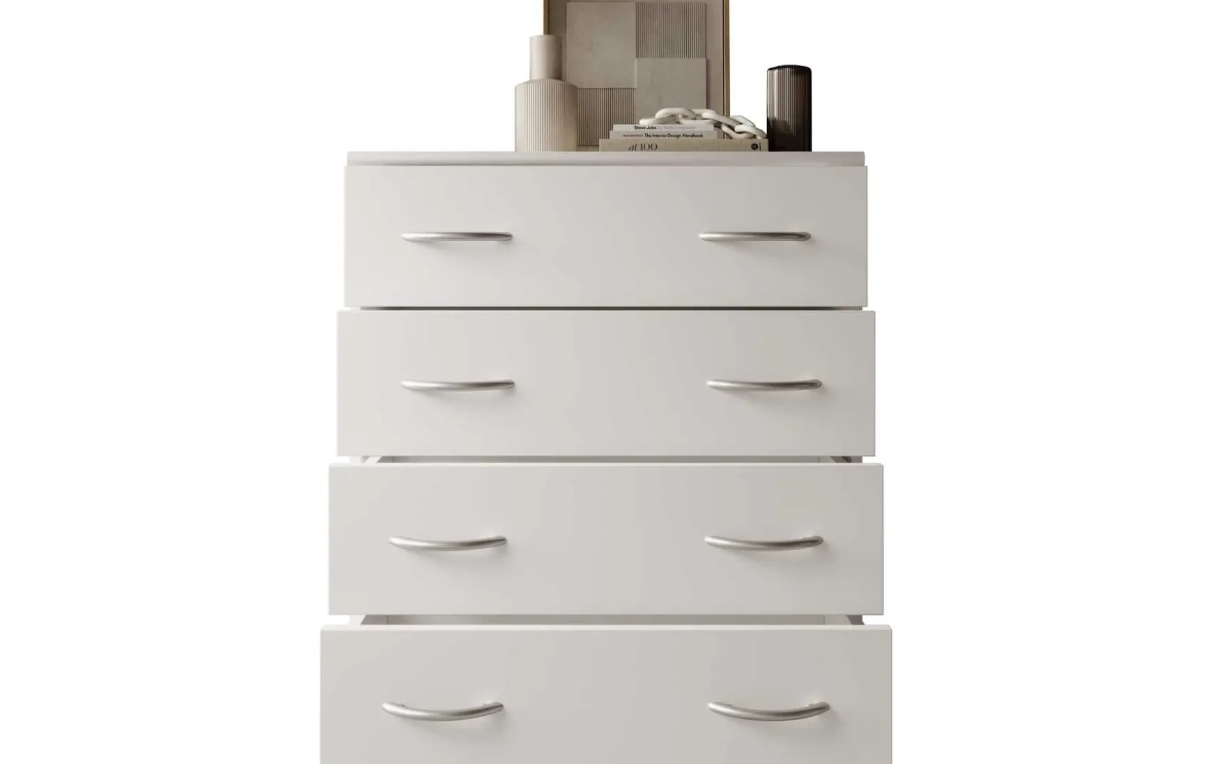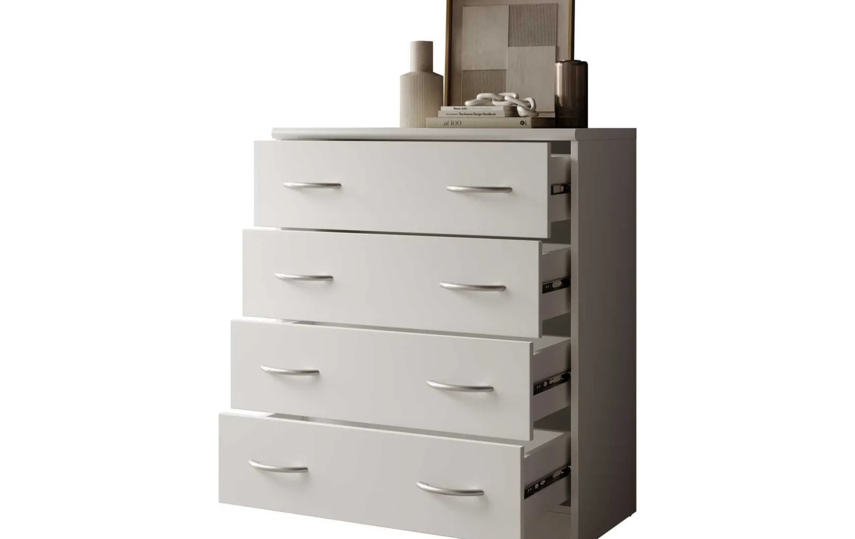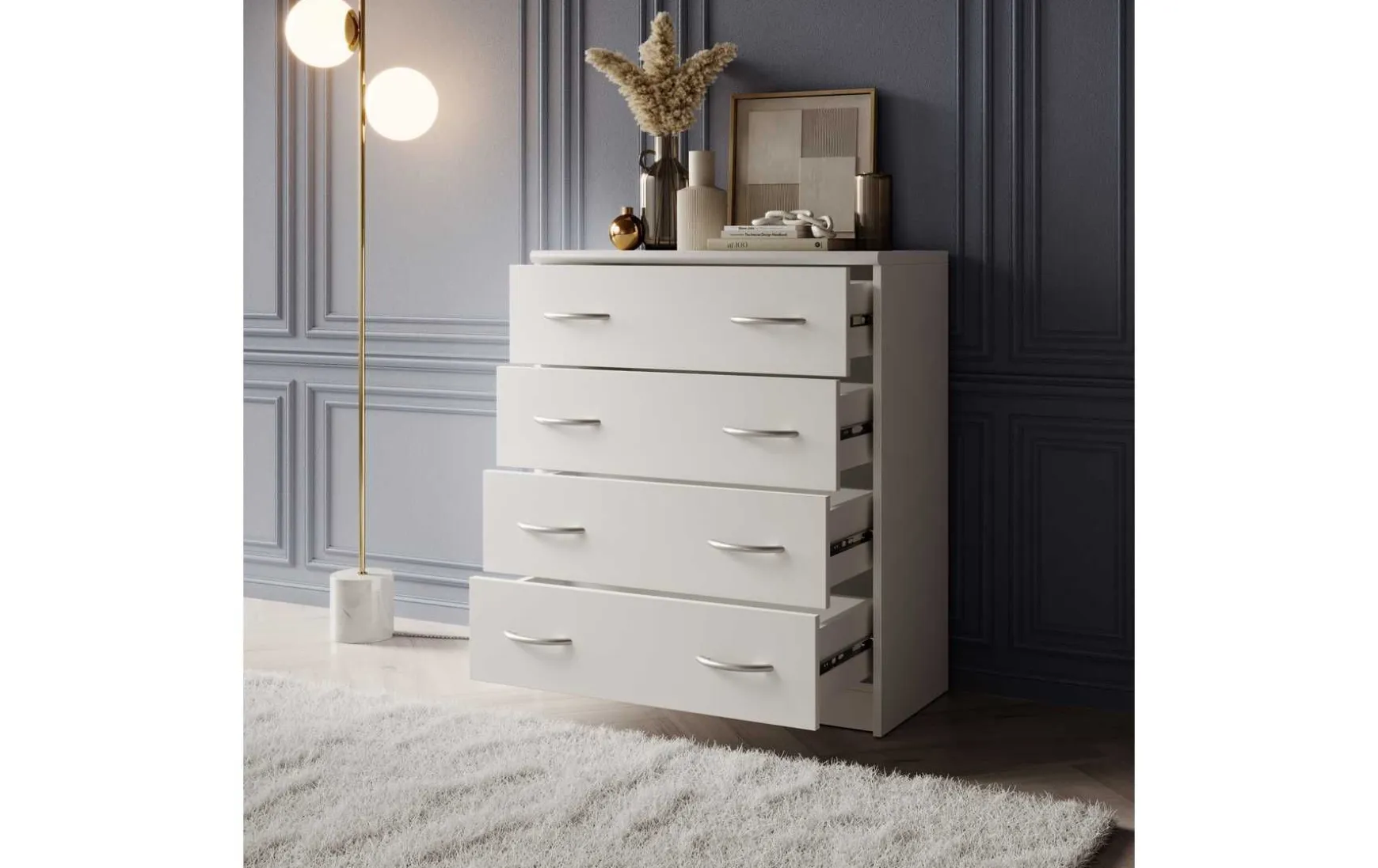 Mit ihrem schlichten aber zeitlos elegantem Design mit Dekor in Weiß fügt sich diese Kommode in jeden Wohnraum hervorragend ein. In den 4 besonders breiten Schubladen ist reichlich Stauraum für allerlei Utensilien.
