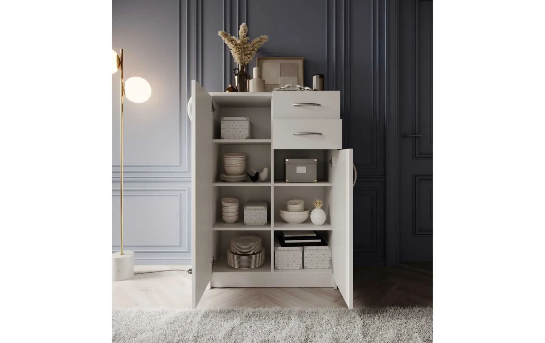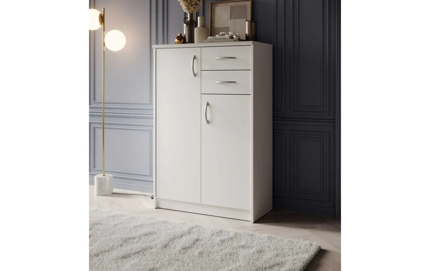 Mit ihrem schlichten aber zeitlos elegantem Design mit Dekor in Weiß fügt sich diese Kommode in jeden Wohnraum hervorragend ein. Hinter den beiden Türen verbergen sich insgesamt 4 höhenverstellbare Einlegeböden, die in Kombination mit den beiden Schubladen besonders viel Stauraum bieten.