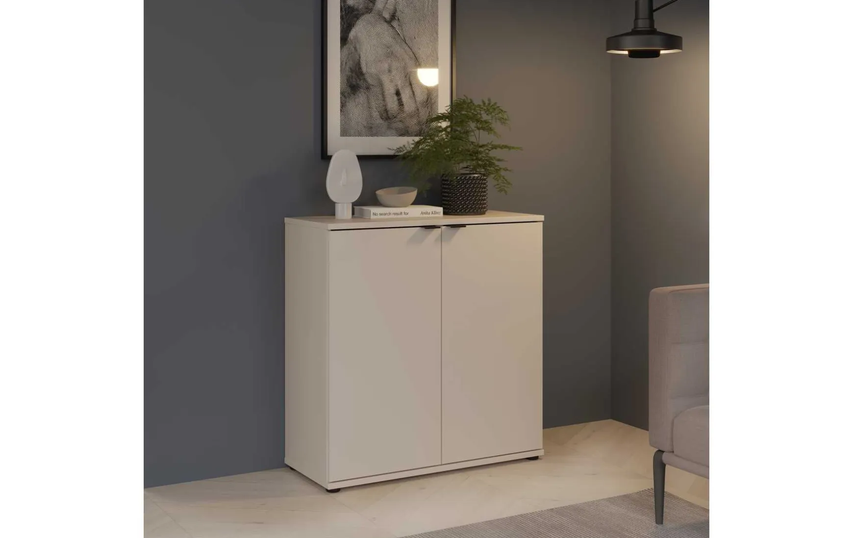 Diese kompakte Kommode in Sandfarben (Beige) überzeugt durch ihr schlichtes, modernes Design und bietet praktischen Stauraum für verschiedene Wohnbereiche. Die dezente Farbgebung sorgt für eine warme und harmonische Atmosphäre und lässt sich leicht mit unterschiedlichen Einrichtungsstilen kombinieren – ideal für Wohnzimmer, Schlafzimmer oder Flur. Hinter den zwei Drehtüren verbirgt sich großzügiger Stauraum, in dem sich Haushaltsgegenstände, Dokumente oder Accessoires ordentlich verstauen lassen. Gefertigt aus robustem Holzwerkstoff, ist die Kommode stabil und pflegeleicht und eignet sich perfekt für den täglichen Gebrauch. Mit ihren Maßen von ca. 80 × 34,1 × 82,3 cm (B/T/H) bietet sie ausreichend Platz, ohne dabei viel Raum einzunehmen – ideal auch für kleinere Wohnbereiche.