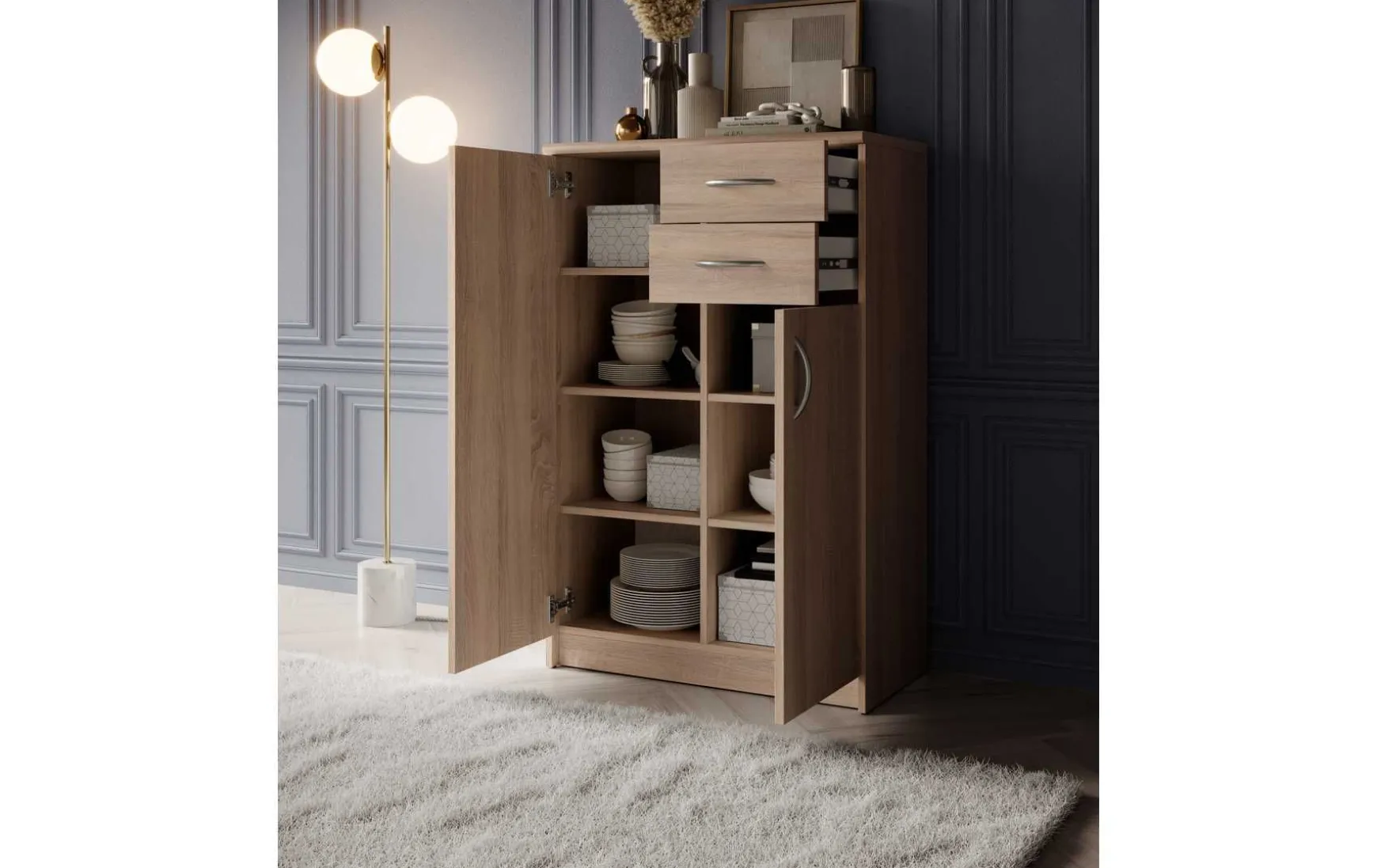 Mit ihrem schlichten aber zeitlos elegantem Design mit Dekor in Eiche Sonoma fügt sich diese Kommode in jeden Wohnraum hervorragend ein. Hinter den beiden Türen verbergen sich insgesamt 4 höhenverstellbare Einlegeböden, die in Kombination mit den beiden Schubladen sehr viel Stauraum bieten.
