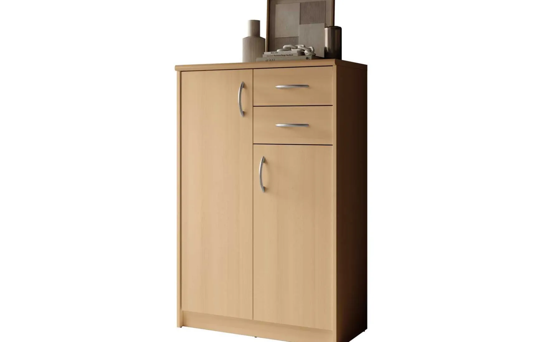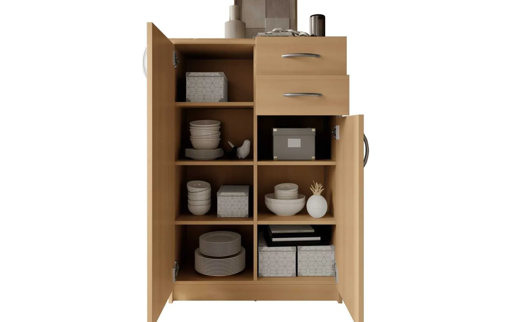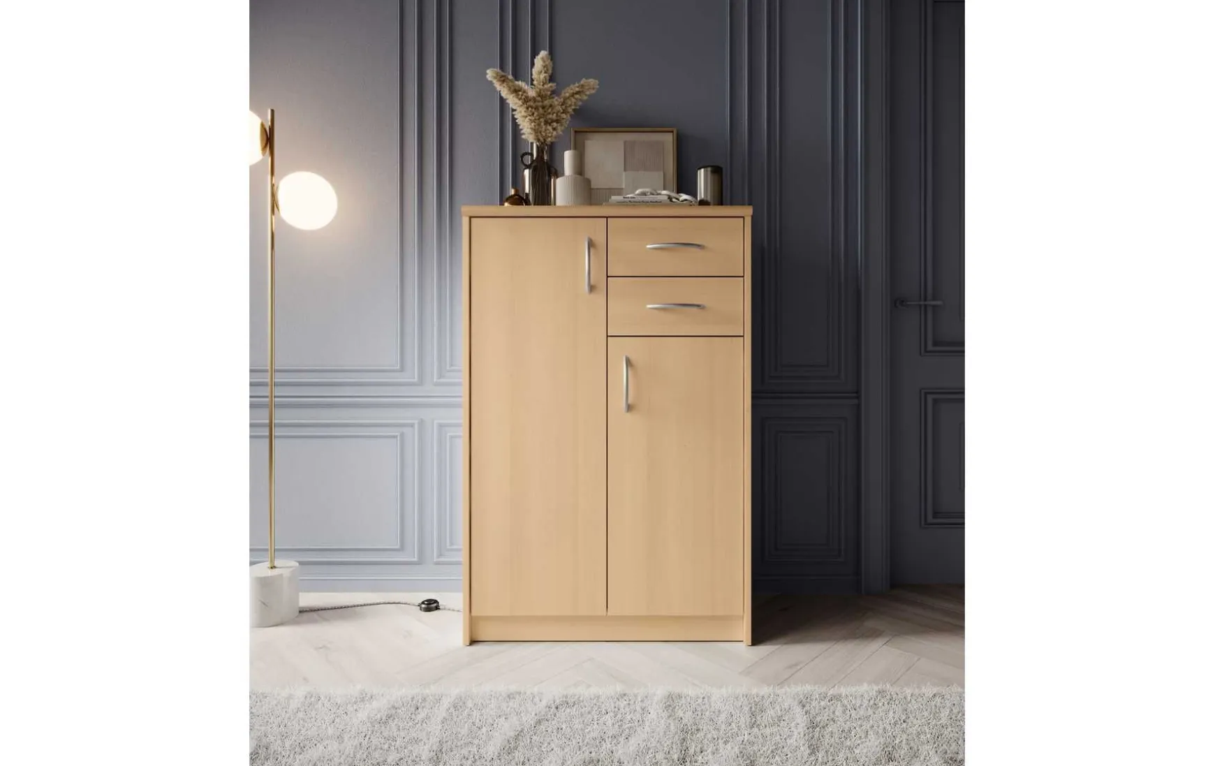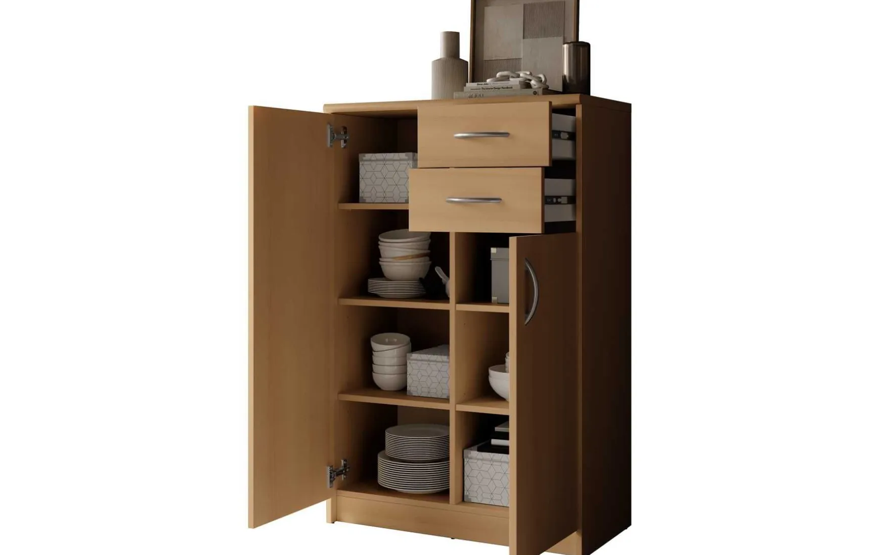 Mit ihrem schlichten aber zeitlos elegantem Design mit Dekor in Buche fügt sich diese Kommode in jeden Wohnraum hervorragend ein. Hinter den beiden Türen verbergen sich insgesamt 4 höhenverstellbare Einlegeböden, die in Kombination mit den beiden Schubladen sehr viel Stauraum bieten.
