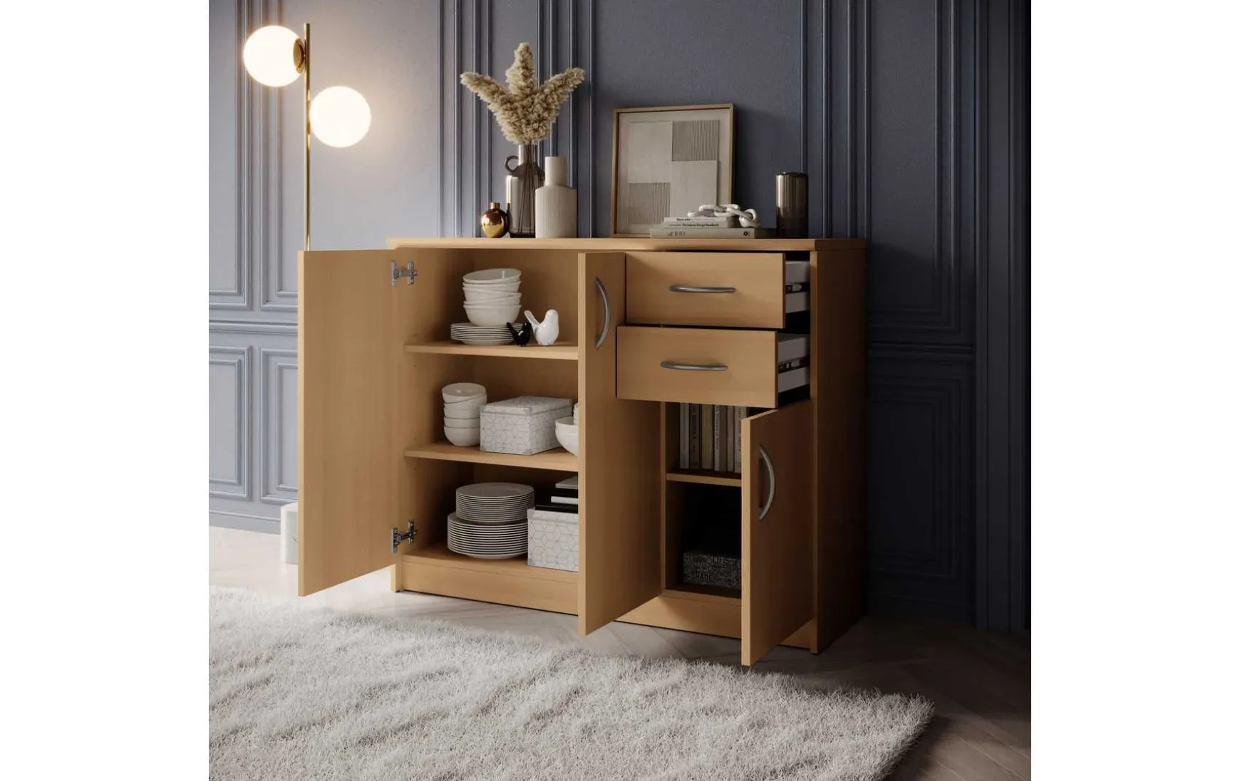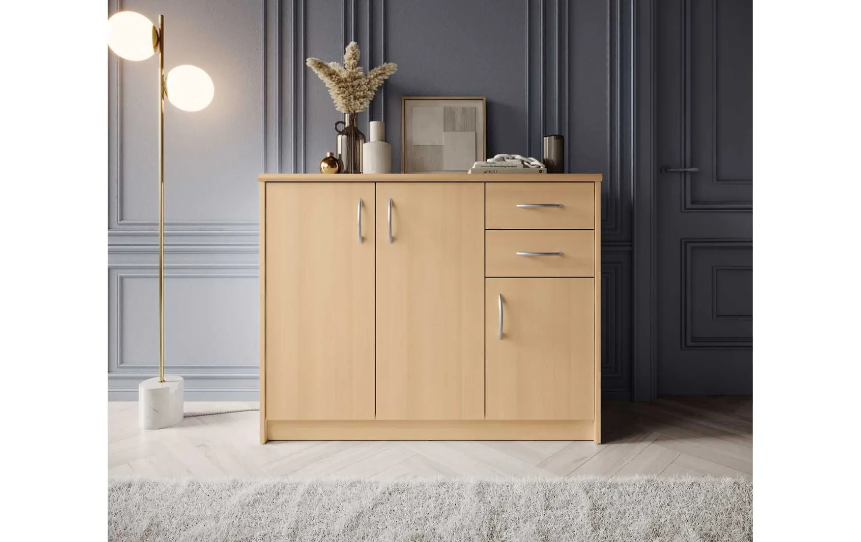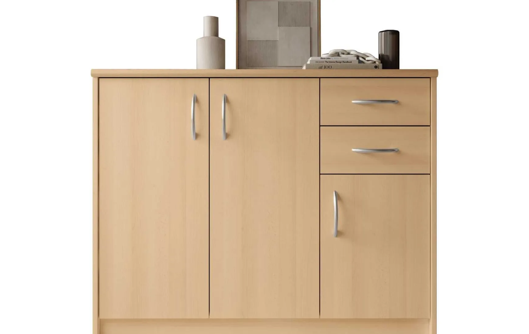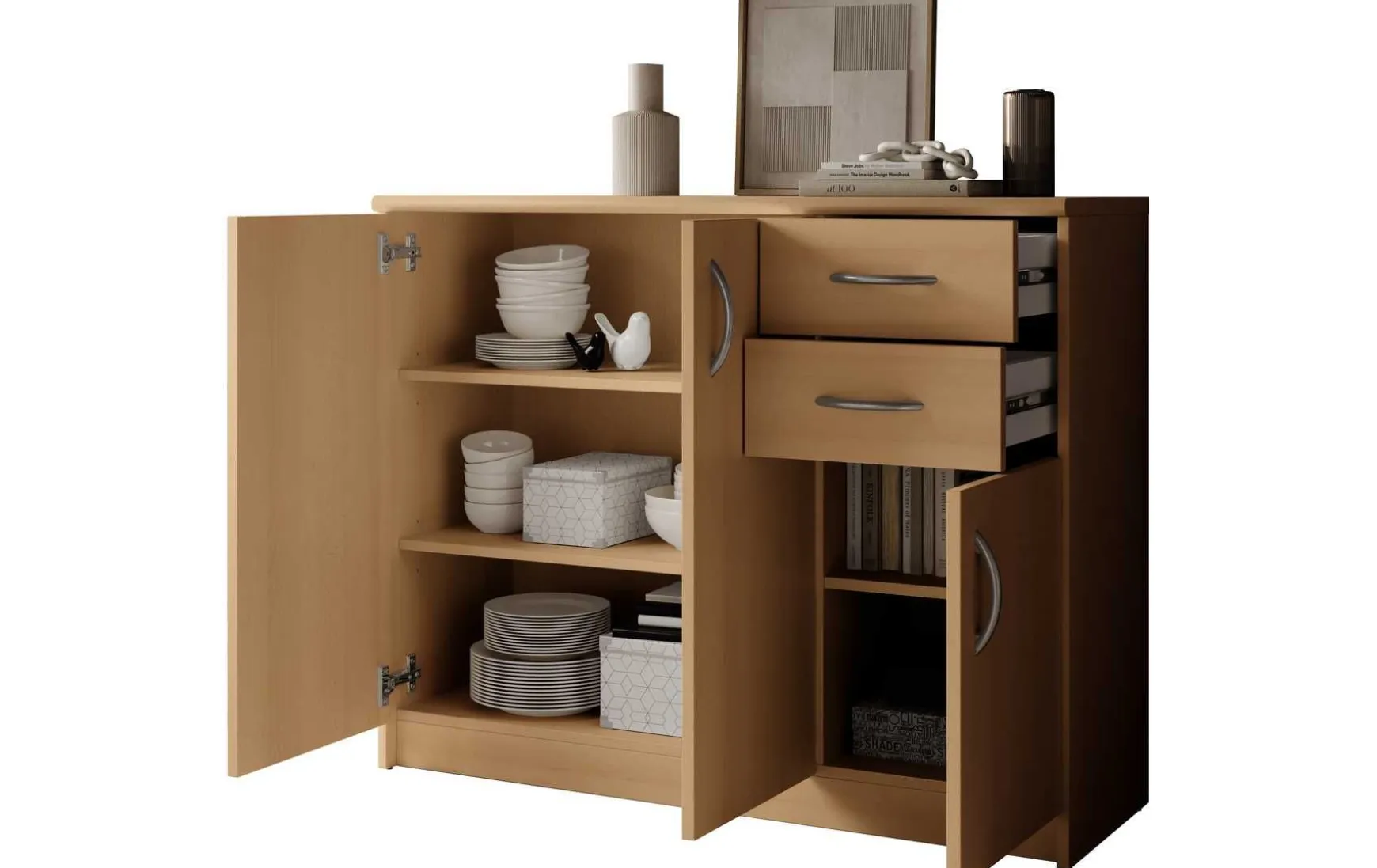 Mit ihrem schlichten aber zeitlos elegantem Design mit Dekor in Buche fügt sich diese Kommode in jeden Wohnraum hervorragend ein. Hinter der Doppeltür befindet sich ein besonders großer Stauraum, der von 2 höhenverstellbaren Einlegeböden unterteilt wird. Ein weiterer Stauraum mit einem höhenverstellbaren Einlegeboden befindet sich hinter der dritten Tür. In Kombination mit den beiden Schubladen ergibt sich somit reichlich Platz für allerlei Utensilien.