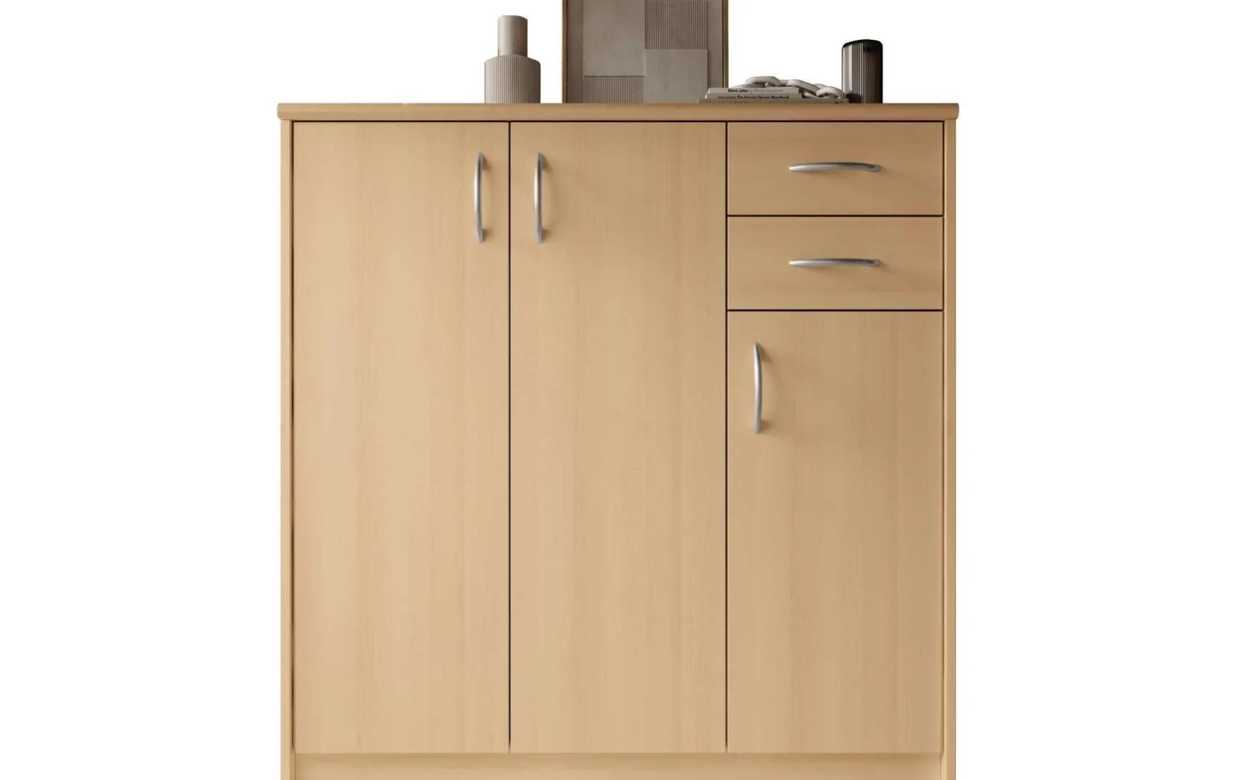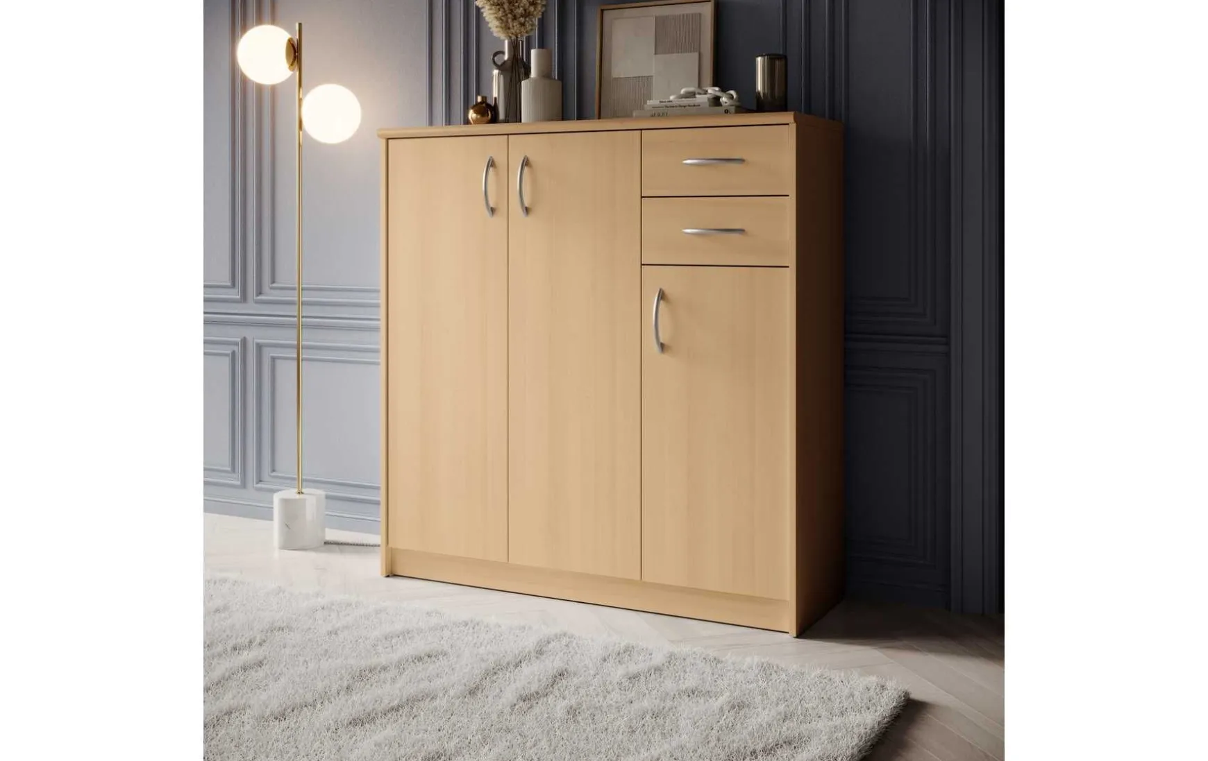 Mit ihrem schlichten aber zeitlos elegantem Design mit Dekor in Buche fügt sich diese Kommode in jeden Wohnraum hervorragend ein. Hinter der Doppeltür befindet sich ein besonders großer Stauraum, der von 3 höhenverstellbaren Einlegeböden unterteilt wird. Ein weiterer Stauraum mit 2 höhenverstellbaren Einlegeböden befindet sich hinter der dritten Tür. In Kombination mit den beiden Schubladen ergibt sich somit reichlich Platz für allerlei Utensilien.