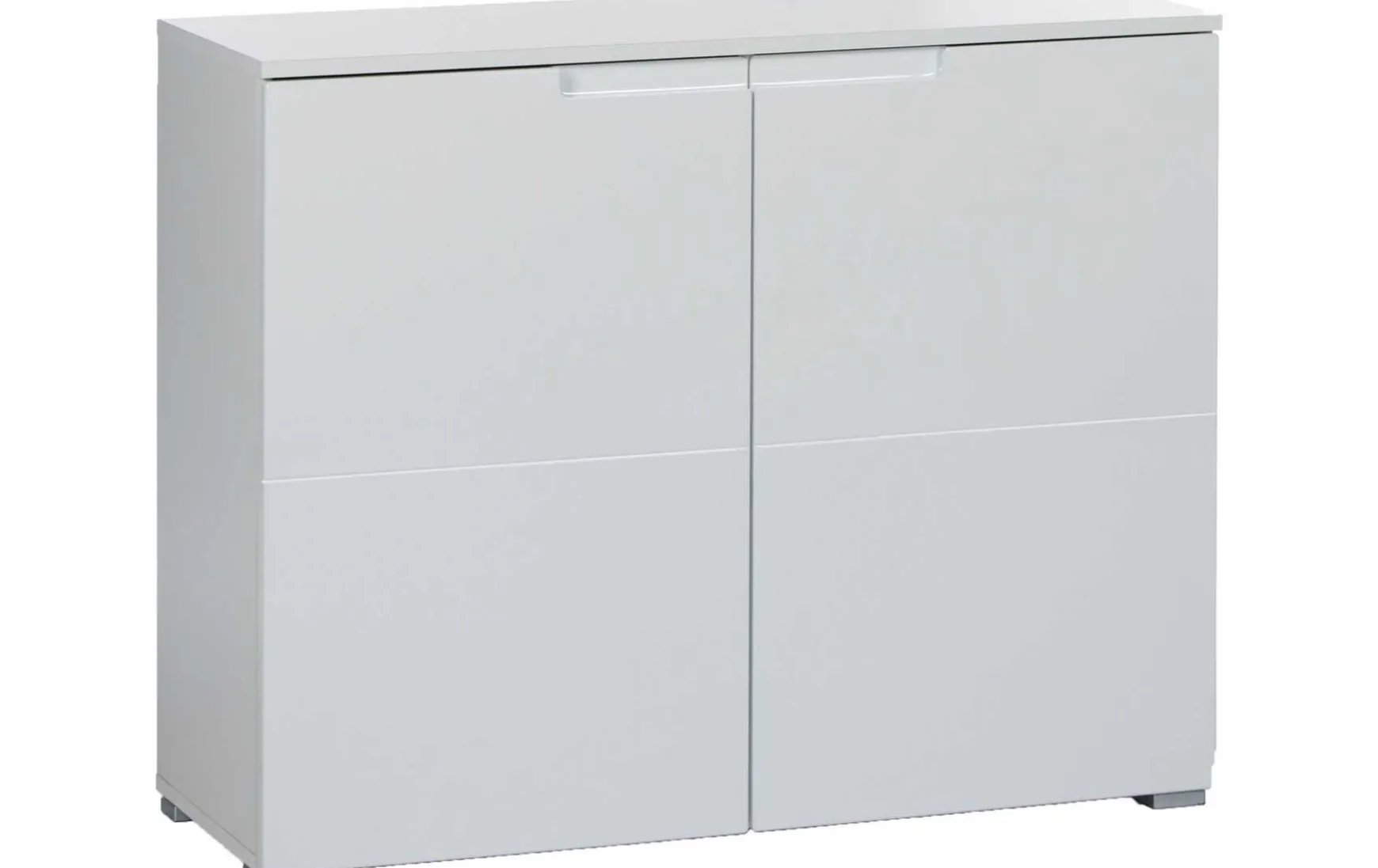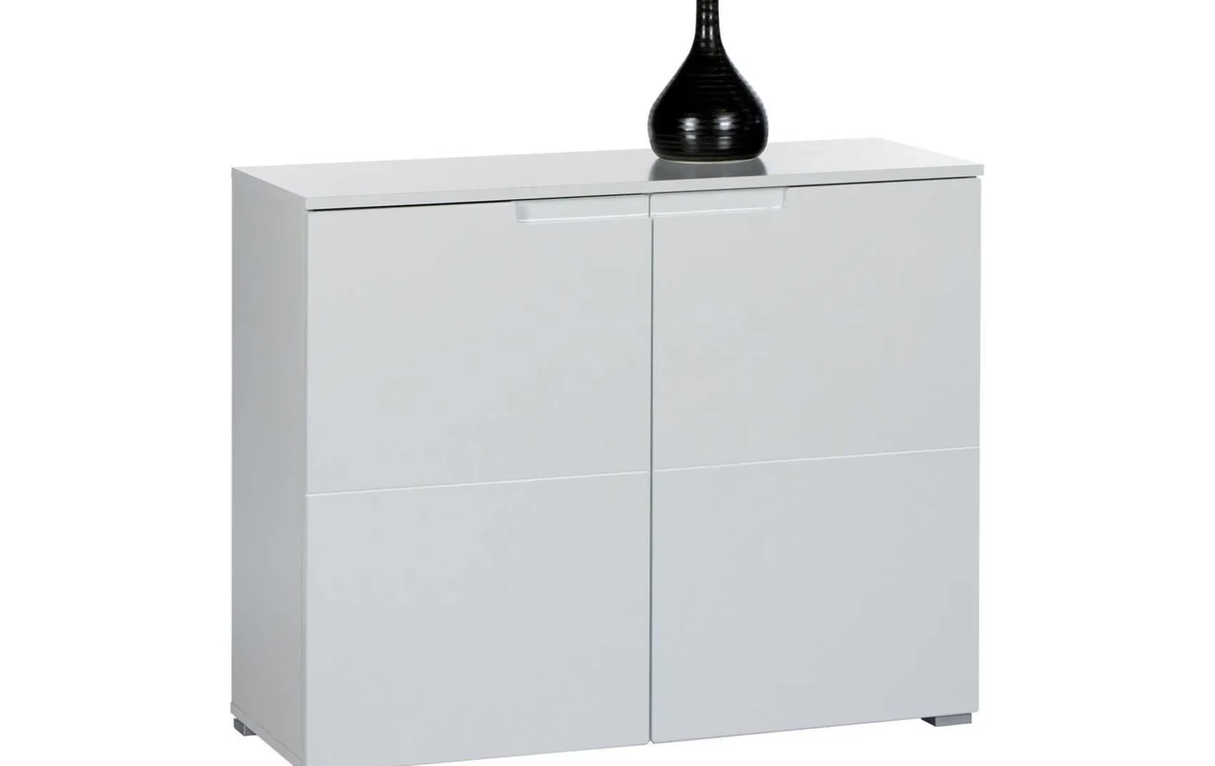 Im modernen grifflosen Design mit Weißen Hochglanz Fronten gehalten, verbirgt diese Kommode hinter ihren 2 großen Türen jeweils einen besonders großen Stauraum mit einem Einlegeboden.