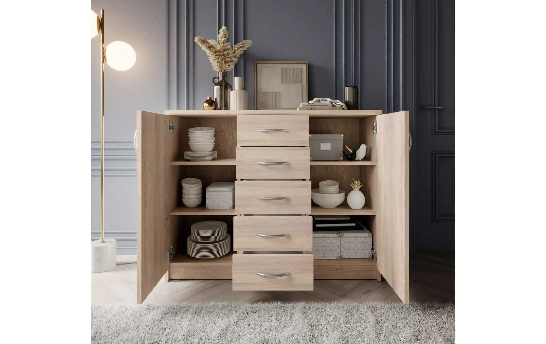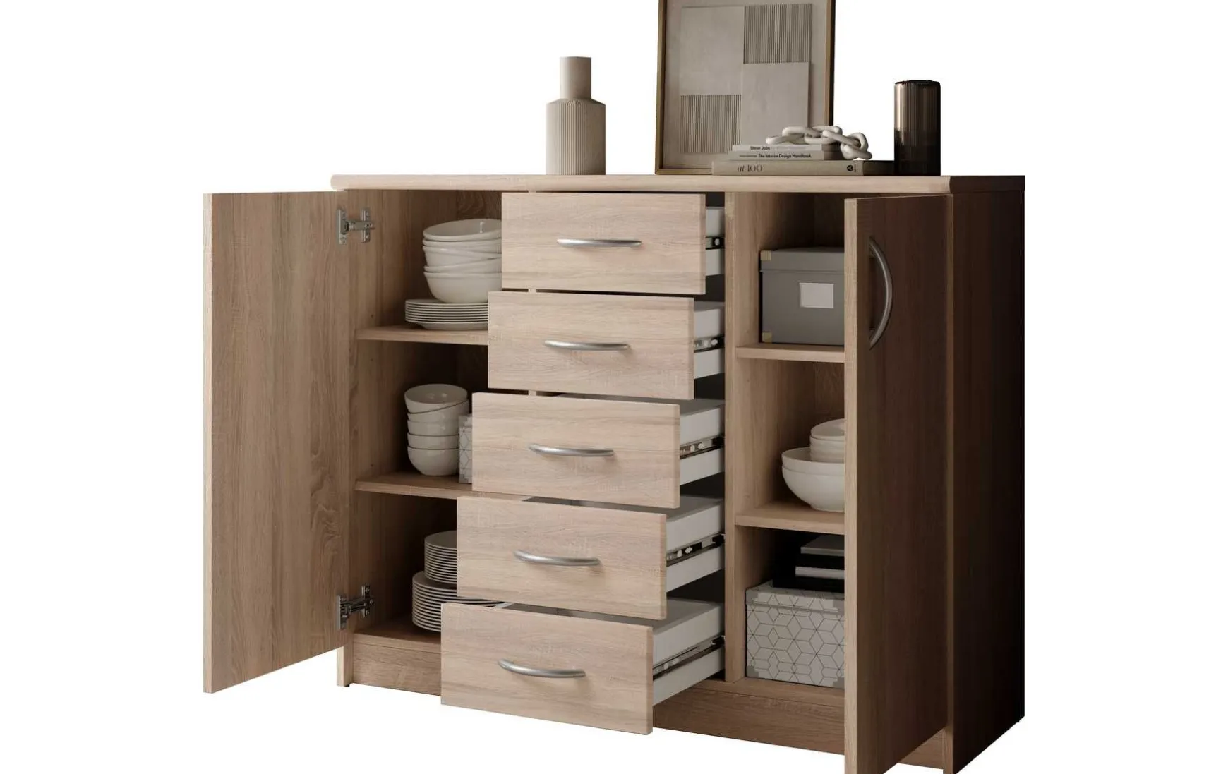 Mit ihrem schlichten aber zeitlos elegantem Design mit Dekor in Eiche Sonoma fügt sich diese Kommode in jeden Wohnraum hervorragend ein. Hinter den beiden Türen befindet sich jeweils ein großer Stauraum, der von 2 höhenverstellbaren Einlegeböden unterteilt wird. In Kombination mit den 5 Schubladen ergibt sich somit reichlich Platz für allerlei Utensilien.