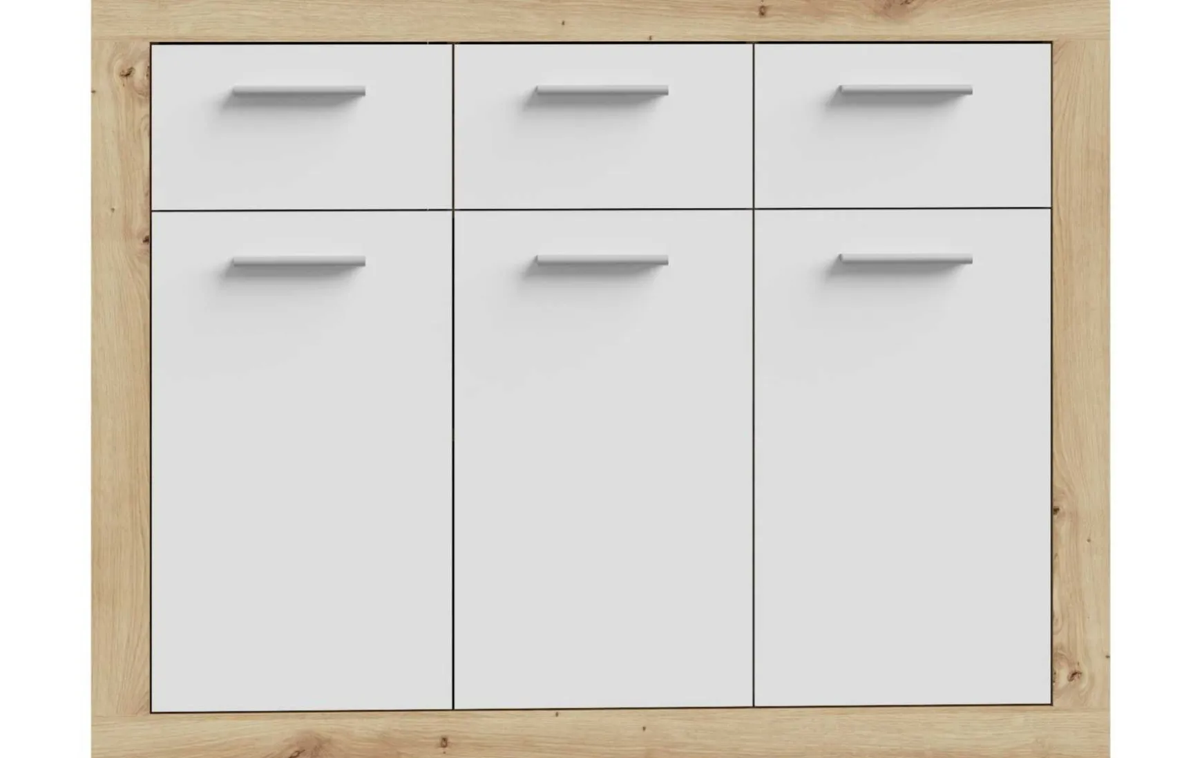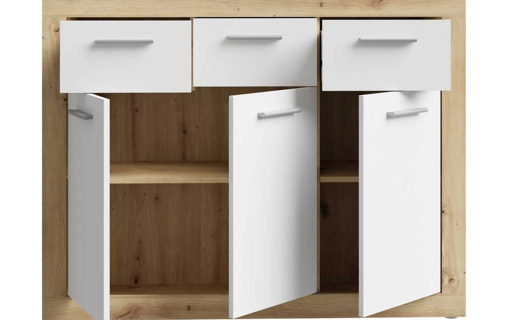 Die Kommode überzeugt durch ihr kompaktes Design und durchdachte Aufteilung. Mit zwei Türen, zwei Schubkästen und einem Einlegeboden bietet sie praktischen Stauraum für Wohn-, Ess- oder Flurbereich.