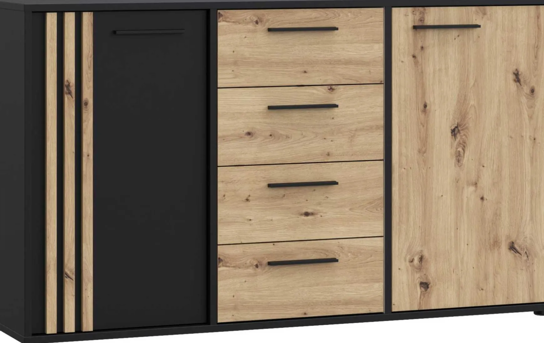 Diese moderne Kommode in Artisan Eiche NB vereint elegantes Design mit viel Stauraum und praktischer Funktionalität. Die warme Holzoptik kombiniert mit schwarzen Griffen und Füßen sorgt für ein zeitgemäßes, stilvolles Erscheinungsbild, das sich harmonisch in verschiedene Wohnbereiche einfügt. Hinter den zwei Drehtüren und in den vier Schubladen lassen sich Haushaltsgegenstände, Dokumente oder Accessoires ordentlich verstauen. Mit ihren Maßen von ca. 142,6 × 34,8 × 82,3 cm (B/T/H) bietet die Kommode viel Stauraum, ohne dabei zu viel Platz einzunehmen. Gefertigt aus robuster Artisan Eiche NB mit pflegeleichten Oberflächen, ist die Kommode langlebig und einfach zu reinigen. Der Schrank wird zerlegt geliefert und lässt sich unkompliziert montieren.