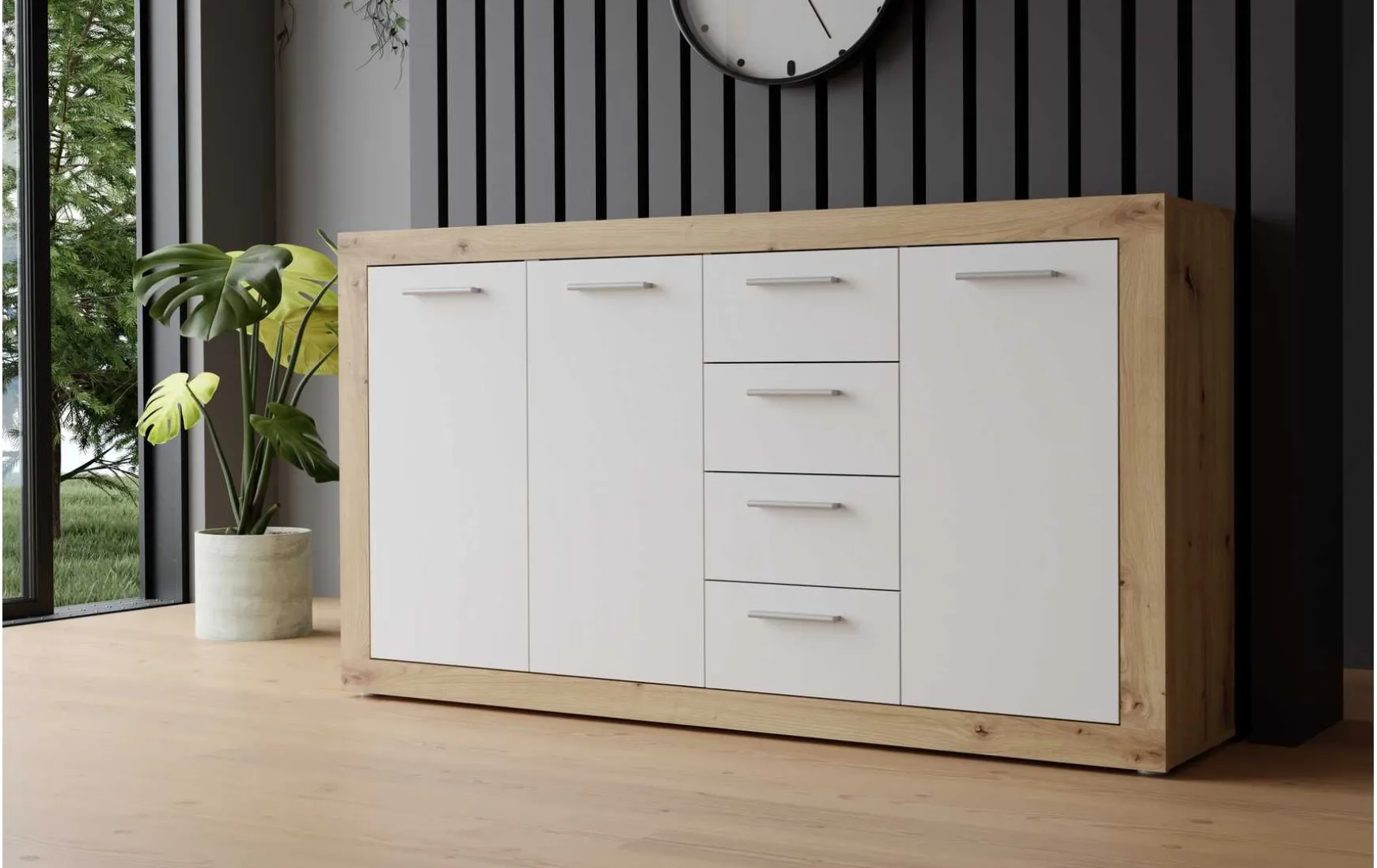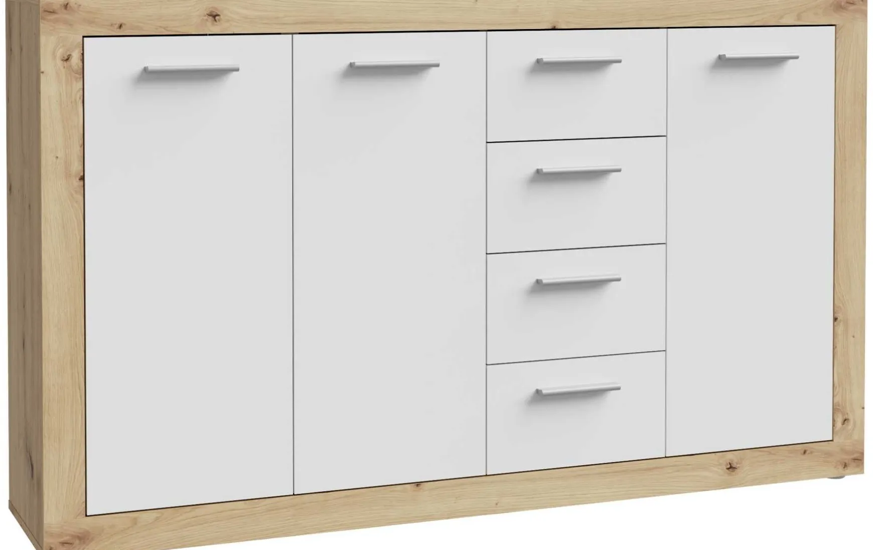 Die Kommode überzeugt durch ihr kompaktes Design und durchdachte Aufteilung. Mit zwei Türen, zwei Schubkästen und einem Einlegeboden bietet sie praktischen Stauraum für Wohn-, Ess- oder Flurbereich.