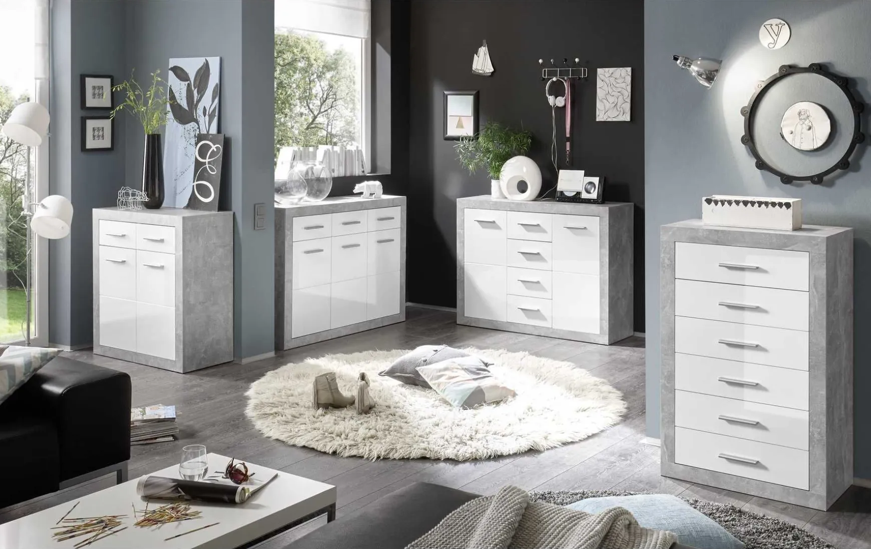 Das moderne Design besticht durch die breiten Korpuswände in Betonoptik mit Weiß glänzenden Fronten. Dadurch passt diese Kommode ideal in Vorräume, macht sich aber auch sehr gut als besonderer Blickfang in anderen Wohnräumen. Hinter der großen Doppeltür verbirgt sich ein besonders großer Stauraum mit einem höhenverstellbaren Einlegeboden. Zusammen mit den beiden Schubladen ergibt sich somit jede Menge Platz für die unterschiedlichsten Utensilien.