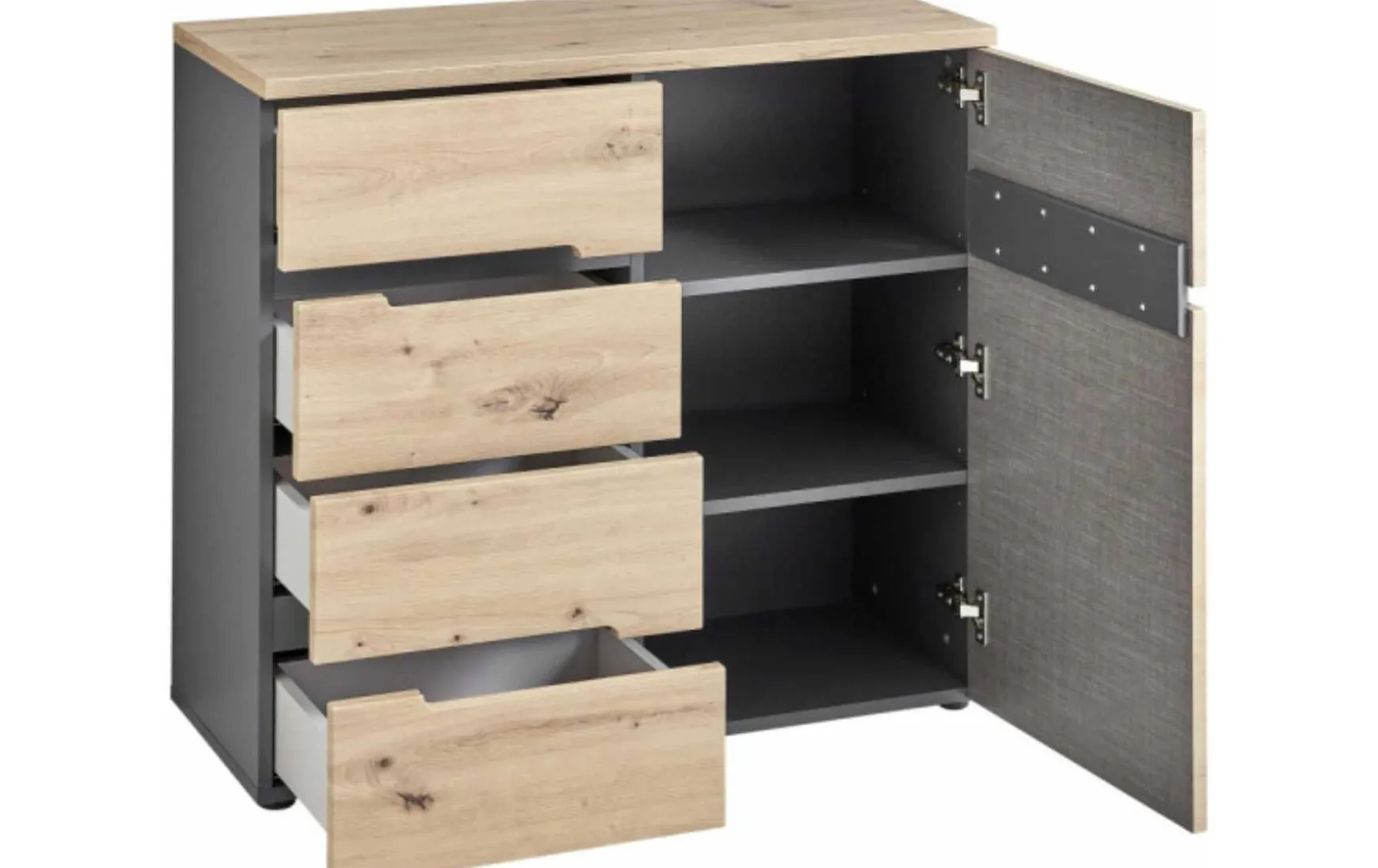 - 1 Holztür, 4 Schubkästen, 2 Fachböden