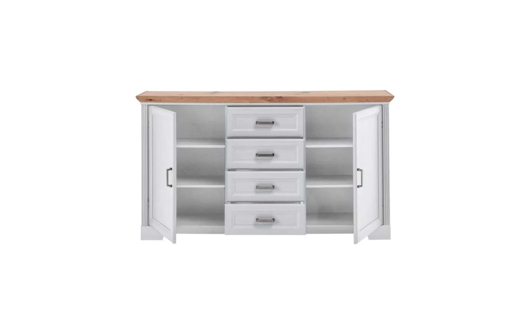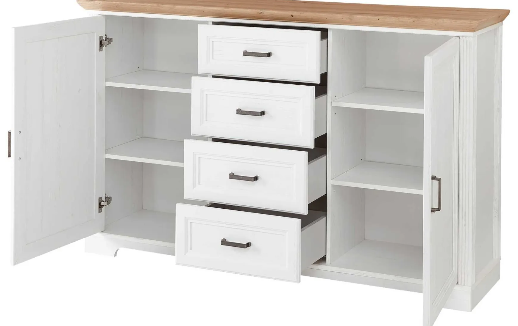Diese Kommode bietet viel Stauraum in deinem Schlafzimmer oder weiteren Wohnbereichen. In den insgesamt vier Schubkästen und hinter den beiden Drehtüren, mit insgesamt vier Einlegeböden, kannst du Bettwäsche, Handtücher oder andere Gegenstände sorgfältig verstauen. Die Kommode besticht durch die harmonische in Anderson Pine gehaltene Ausstrahlung und den geschmackvollen Farbton in Artisan Eiche Nachbildung bereichert dein Zuhause. Die Kommode Jasmin ist praktisch und zugleich ein echter Hingucker im Schlafbereich.