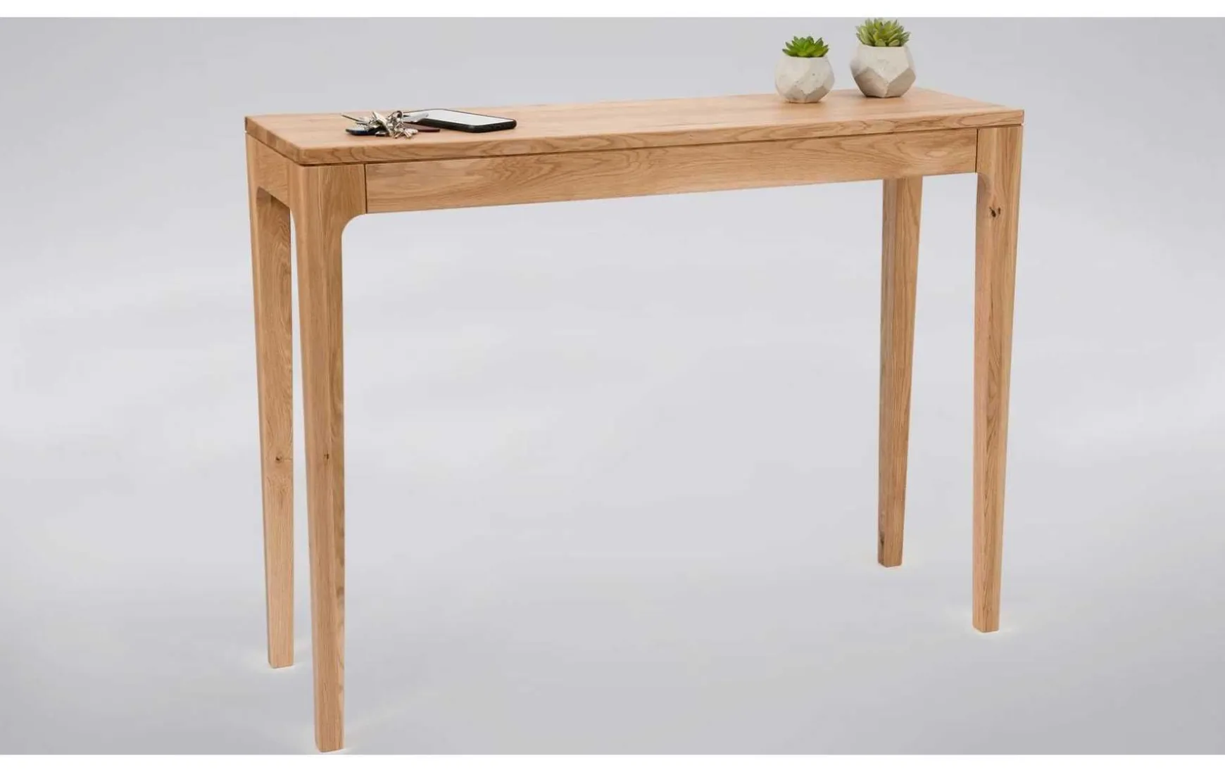 Dieser Konsolen-Beistelltisch aus massiver Wildeiche überzeugt durch seine natürliche Ausstrahlung und hochwertige Verarbeitung. Die rechteckige Form und die schlanken Maße machen ihn vielseitig einsetzbar – ob als Ablage im Flur, als Beistelltisch im Wohnbereich oder als dekoratives Möbelstück. Die sichtbare Holzmaserung verleiht jedem Tisch einen individuellen Charakter.