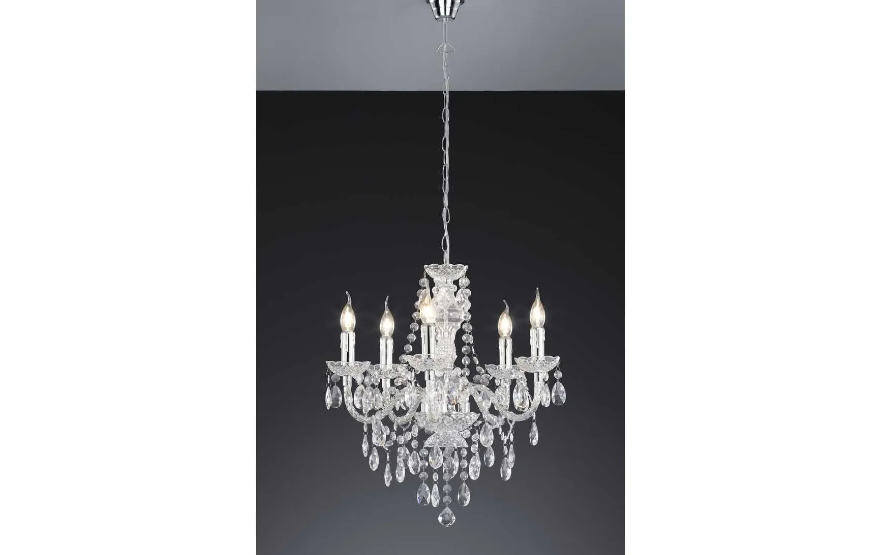 Dieser funkelnde Kronleuchter zieht alle Blicke auf sich. Der glamouröse Hingucker passt ideal in moderne und klassische Einrichtungsstile und überzeugt durch geschmackvolles Design und erstklassige Lichtverhältnisse. Die 5-flammige Leuchte hat eine Abhängung von 150 cm und einen Durchmesser von 52 cm. Die Farbgestaltung in Metall Chrom und dem klaren Kristallbehang aus Acryl ergänzt sich perfekt und lässt ein harmonisches Gesamtbild entstehen. Für eine energiesparende Beleuchtung empfiehlt sich die Verwendung eines LED Leuchtmittels. Diese sind eine optimale Alternative zu herkömmlichen Halogen Leuchtmitteln und stehen für eine hohe Lichtqualität und eine Energieeinsparung von bis zu 80%. Zusätzlich profitieren Sie bei LED Leuchtmitteln von einer langen Lebensdauer, einer geringen Wärmeentwicklung und schonen gleichzeitig die Umwelt.