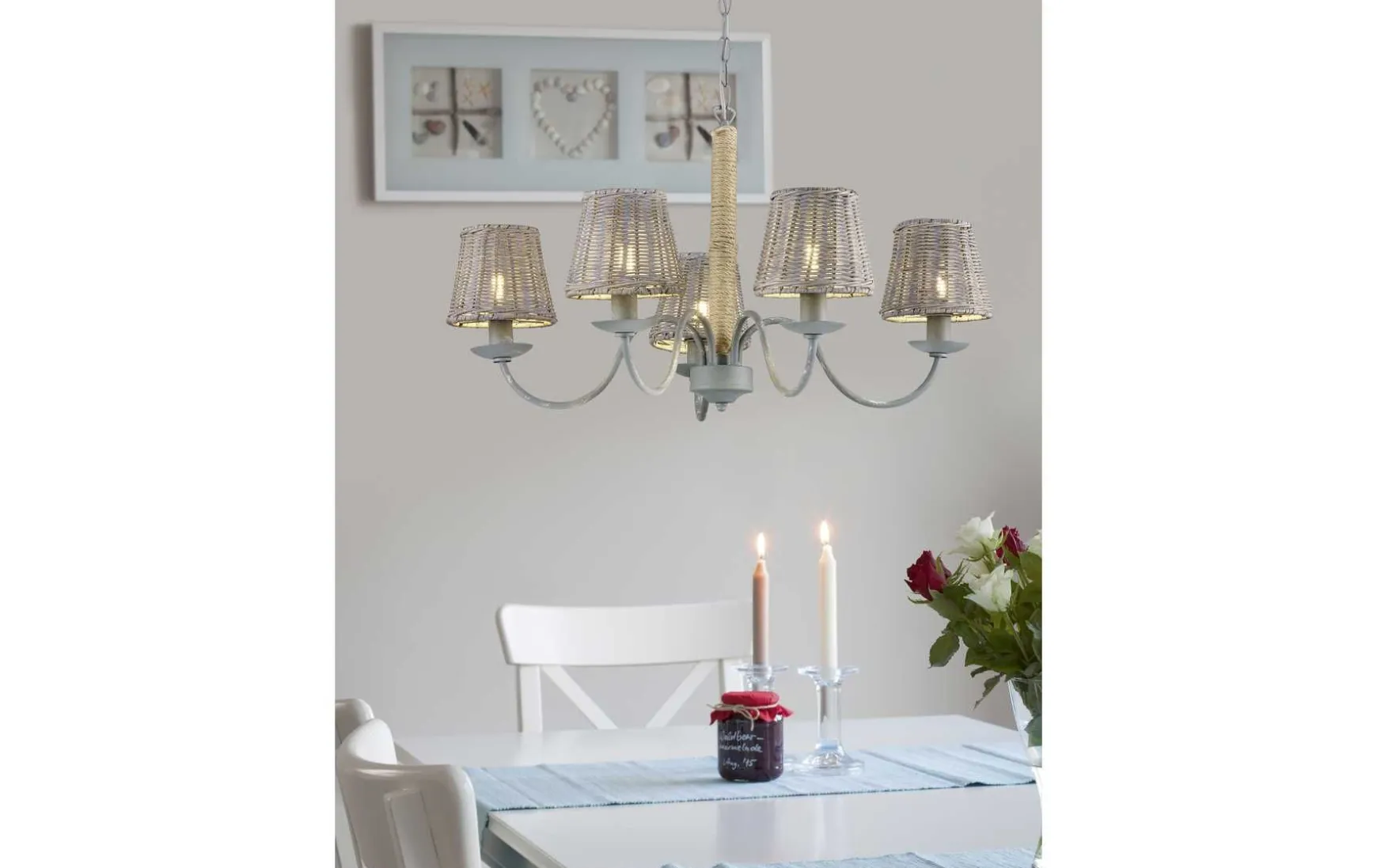 Diese Leuchte im Vintage Stil verkörpern eine perfekte Symbiose aus modernem und klassischem Design. Sie verleihet Ihren Räumlichkeiten Gemütlichkeit und wird gleichzeitig zu einem Dekorationselement. Der Vintage Kronleuchter verleiht jedem Raum das gewisse Etwas. Der fünfflammige Kronleuchter aus Metall verfügt über ebenfalls graue Lampenschirme in Rattan Optik. Durch die geschwungene und gleichzeitig rustikale Form überzeugt die Leuchte vor allem in klassisch angehauchten Wohnstilen oder Einrichtungen im Landhaus Stil. Das ausgestrahlte Licht wird angenehm im Raum verteilt und lässt ein gemütliches Ambiente entstehen. Die Leuchte ist ideal um bestimmte Bereiche optimal auszuleuchten. Vor allem aber im Essbereich, mittig über einem Esstisch ausgerichtet kommt sie wunderbar zur Geltung.