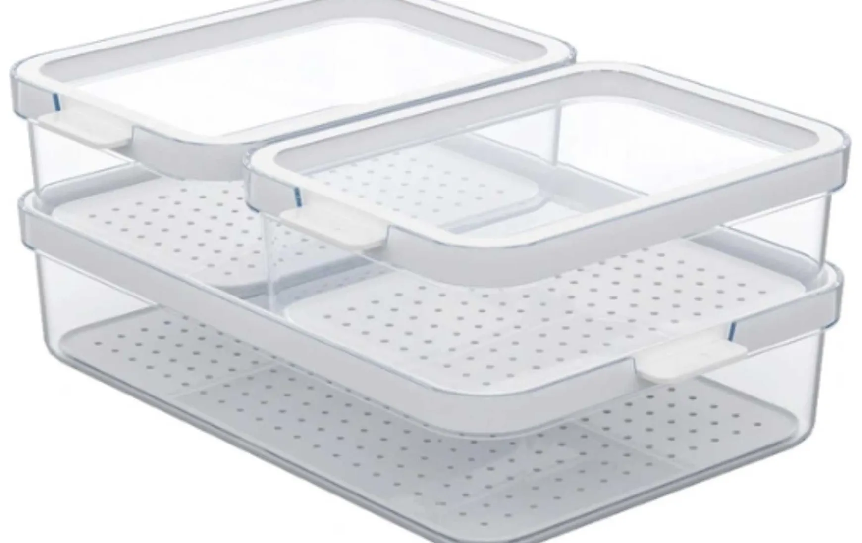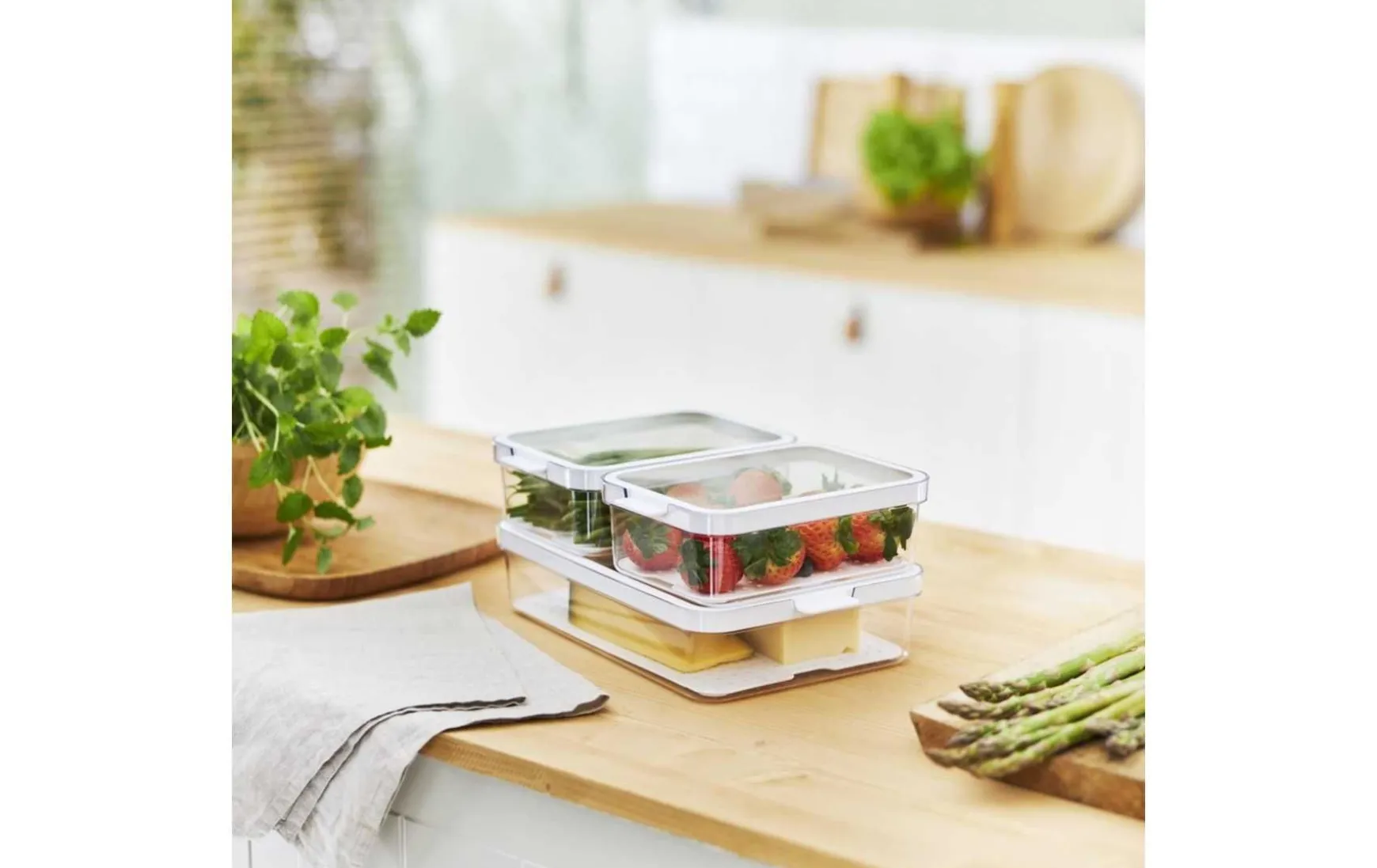 Frische Lebensmittel werden in diesem stapelbaren Kühlschrank-Organizer 3-tlg. optimal aufbewahrt. Das Set (L/B/H ca. 28,4 x 20 x 12 cm, 0,71 kg) umfasst drei transparente Kunststoffboxen (einmal 2,6 l und zwei 1,2 l). Inklusive Deckel und Unterbodeneinsatz in Weiß.