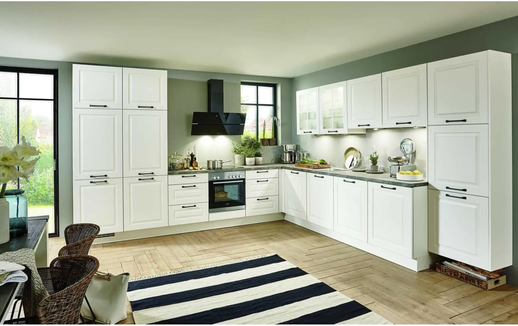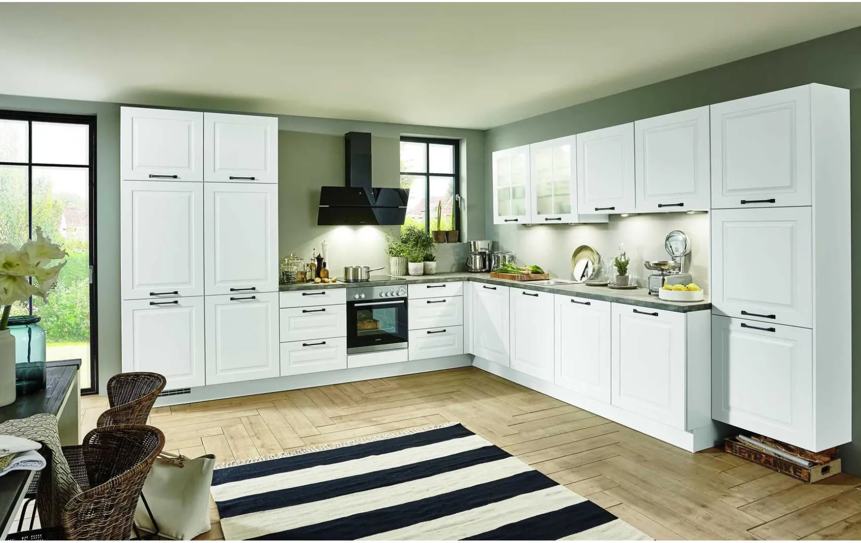In dieser Landhausküche vereinen sich Eleganz und Funktionalität auf eindrucksvolle weiße. Stauraum ist im Hochschrank als auch in den Hochschränken reichlich vorhanden. Ergänzt wird dies durch zwei Auszugschränke, die praktisch links und rechts vom Herd angeordnet sind. Ein Schmuckstück sind auch der kopffreie Dunstabzug und die beiden Glashängeschränke mit Sprossen.