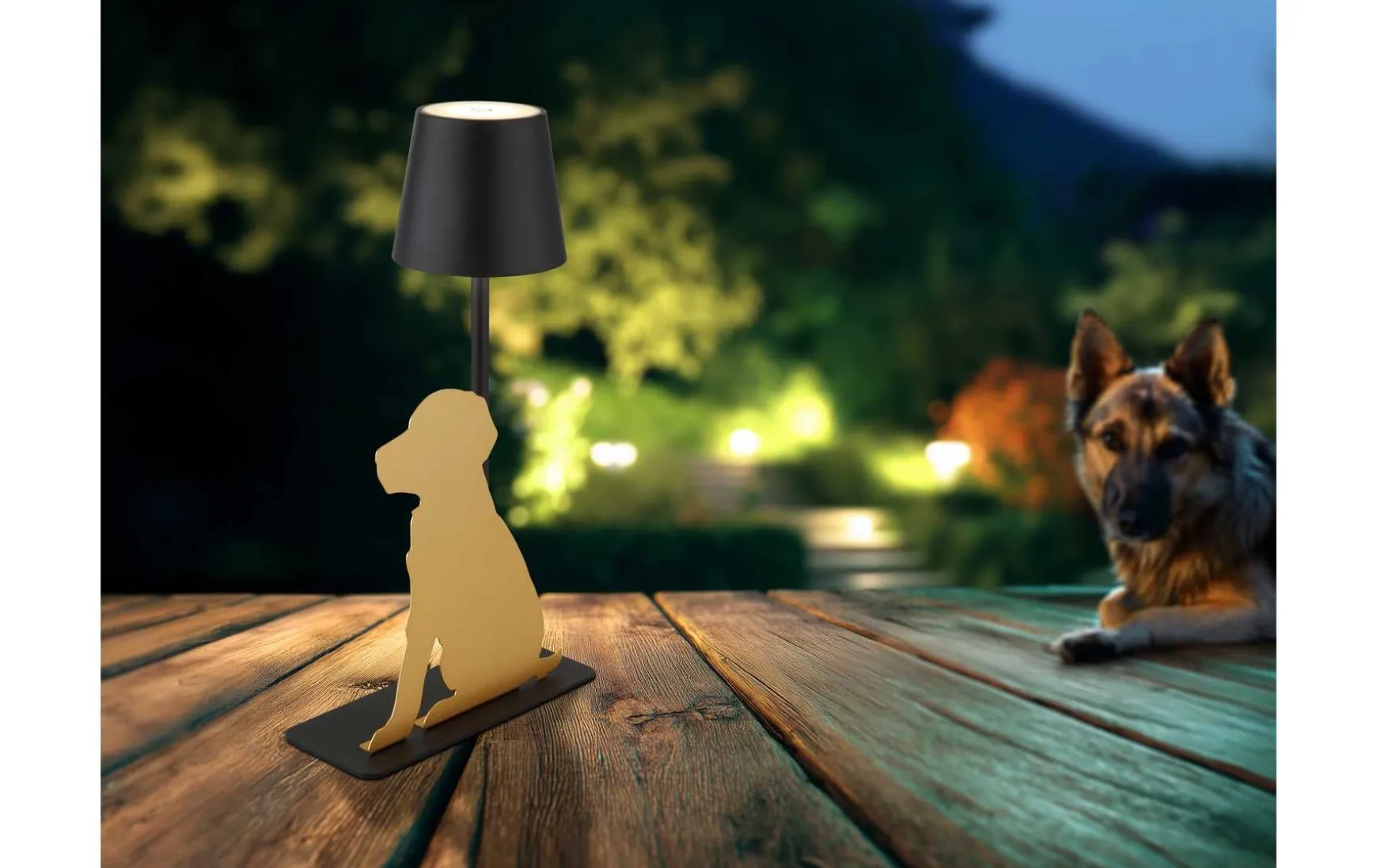 Der Korpus in schwarz matt und goldfarben matt stellt einen dekorativen Hund dar, der der Leuchte einen charmanten Charakter verleiht.