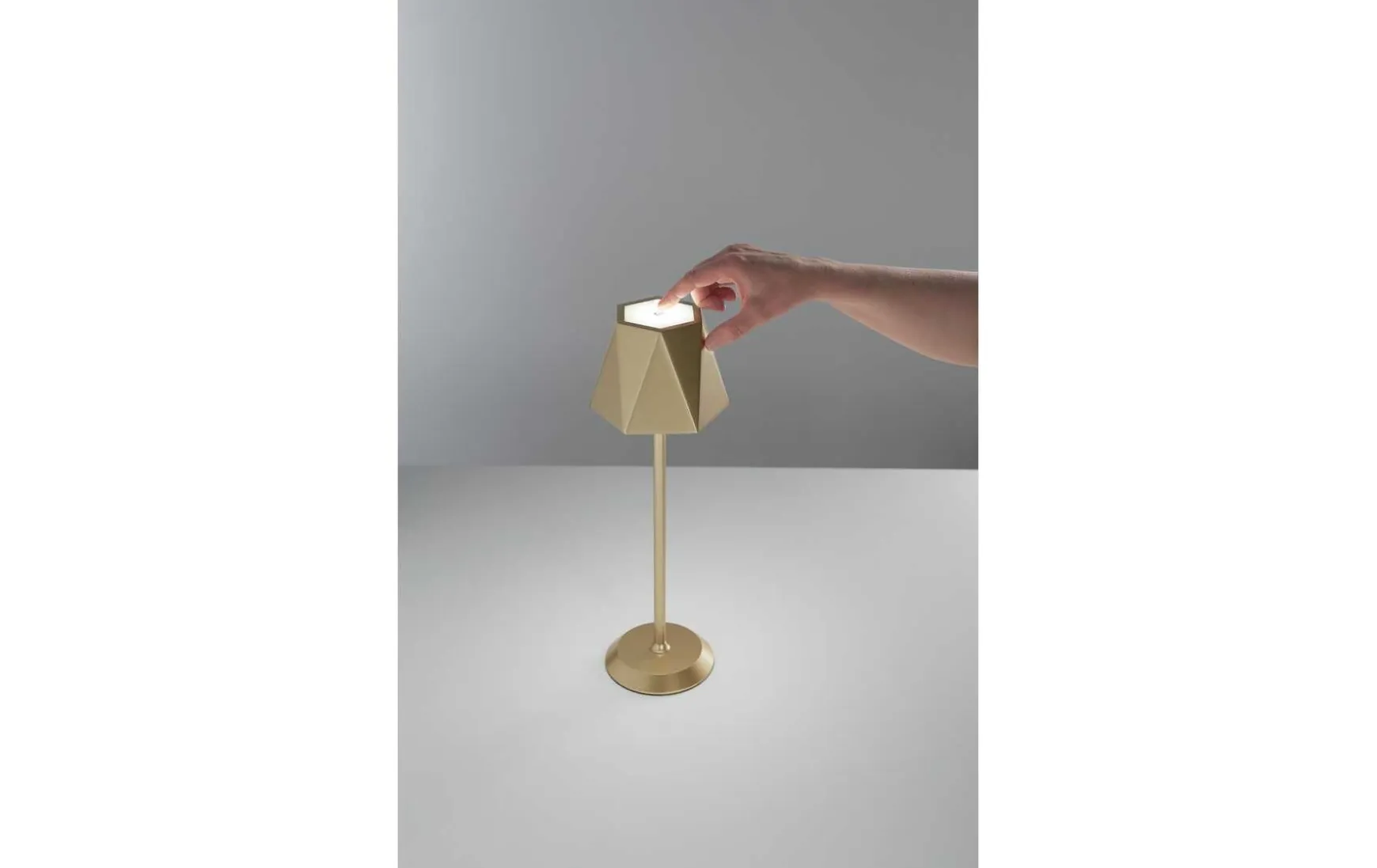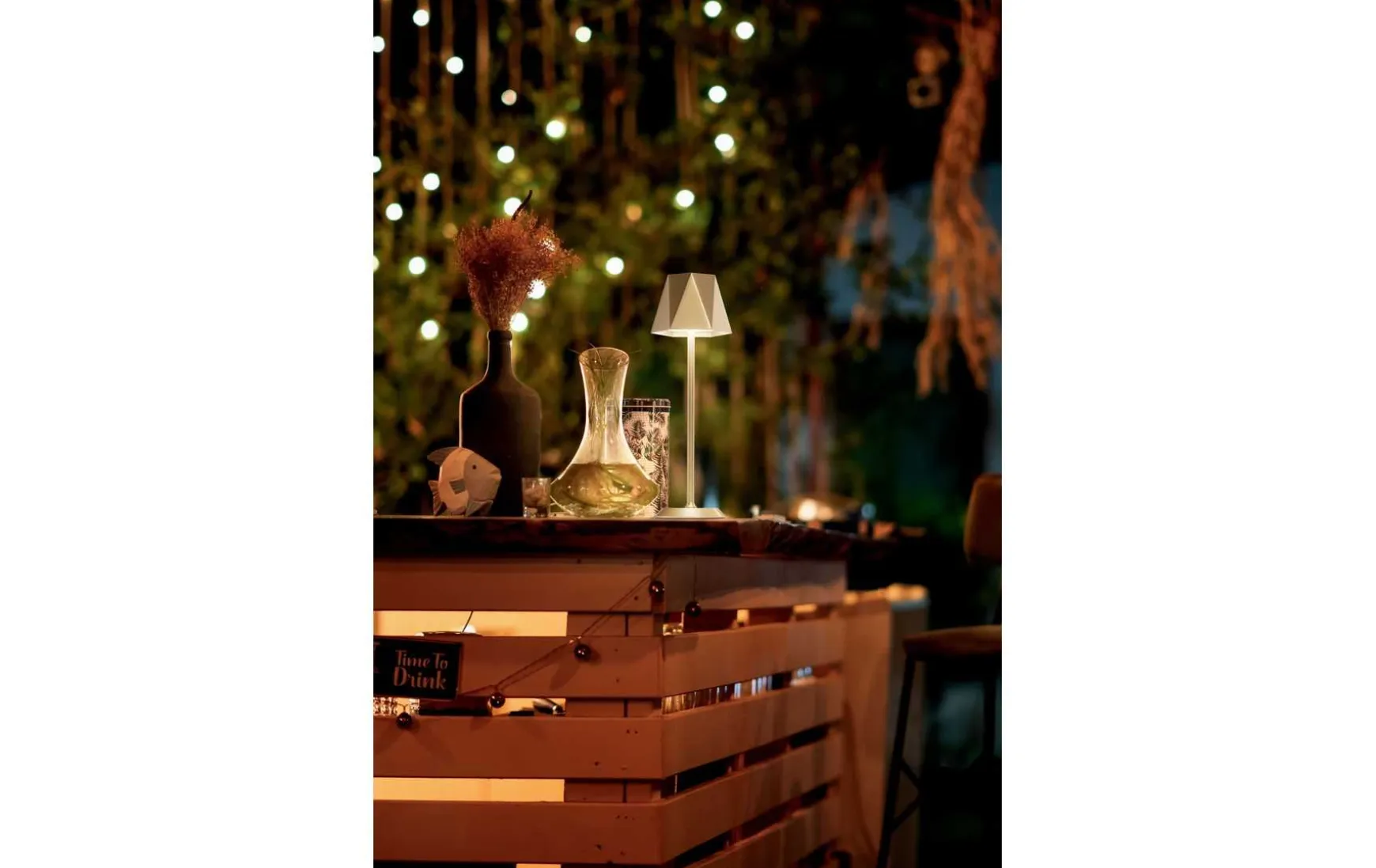 Solide AKKU-Tischleuchte in Schutzklasse IP54, stufenlos dimmbar, kippsicher durch niedrigen Schwerpunkt; Lichtabstahlung nach oben und unten, 320 Lumen