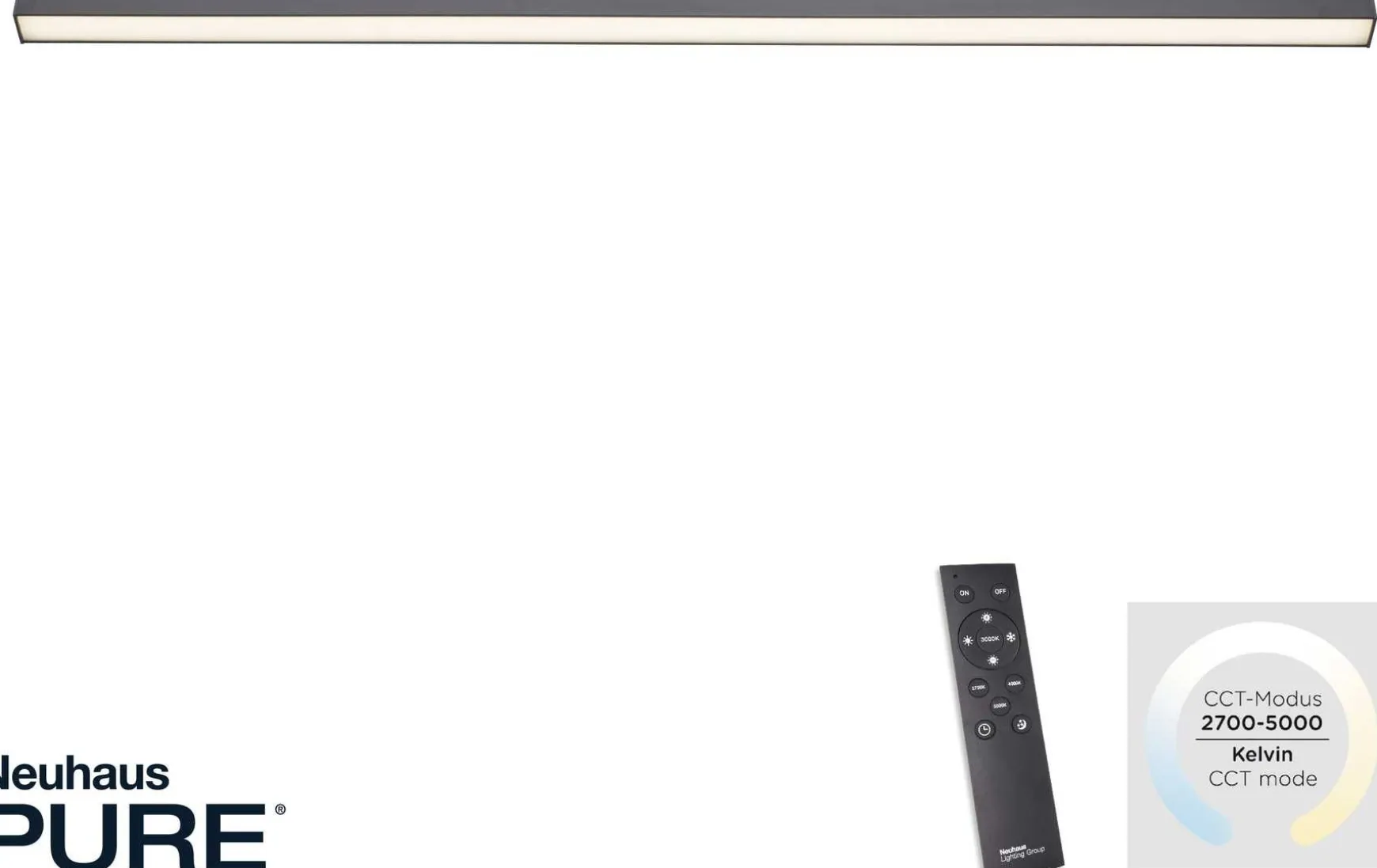 Die anthrazite LED-Deckenleuchte begeistert mit ihrem modernen linearen Design als ein Hingucker an Ihrer Zimmerdecke. Egal ob im Wohnzimmer, Flur, Esszimmer oder Schlafzimmer: das Licht der Deckenlampe können Sie ganz nach Ihren Bedürfnissen anpassen. So können Sie durch die CCT- Funktion entscheiden, ob die Leuchte in Warmweiß, Tageslichtweiß oder Kaltweiß erstrahlen soll. Weiter können Sie die Lampe an einem gemütlichen Abend auch nach Belieben dank der Dimmfunktion über die mitgelieferte Fernbedienung dimmen. Über die integrierte Memory Funktion können Sie Ihre angepassten Einstellungen speichern. Die schlichte LED Deckenleuchte im puristischen Design ist Teil der NeuhausPURE Leuchten, die durch ihre ästhetische und zugleich raffinierte Optik überzeugen.