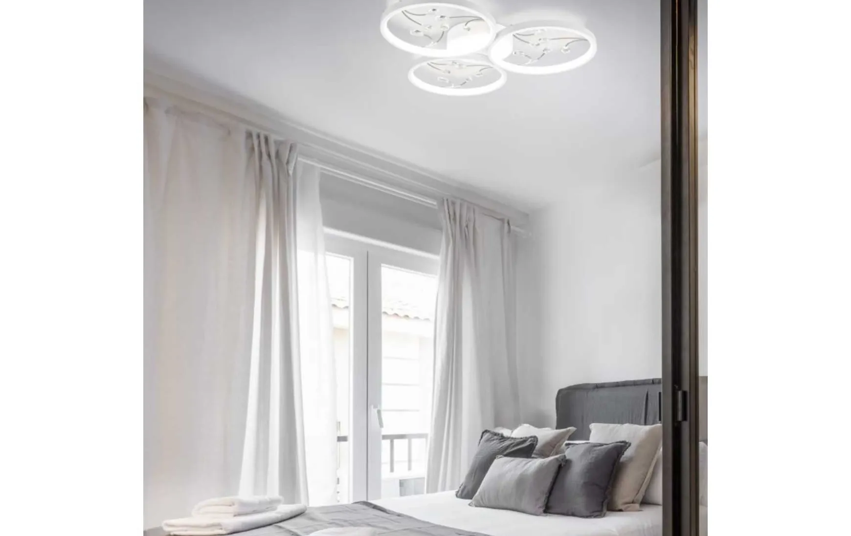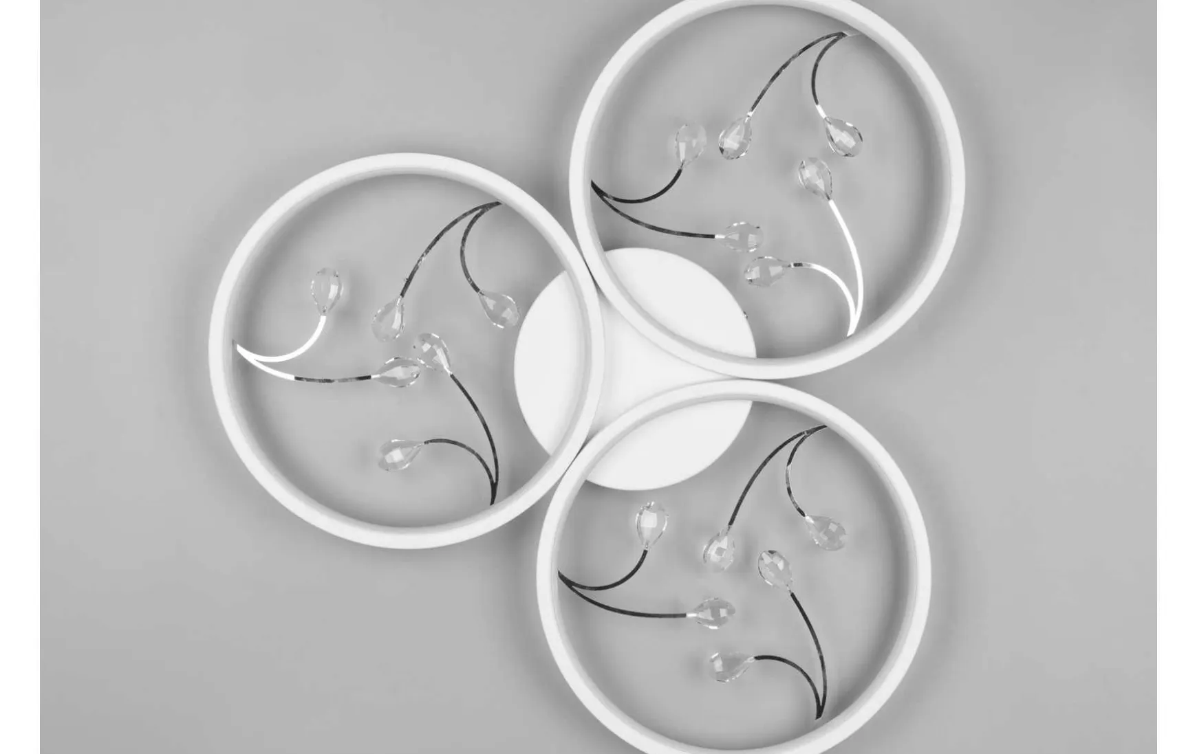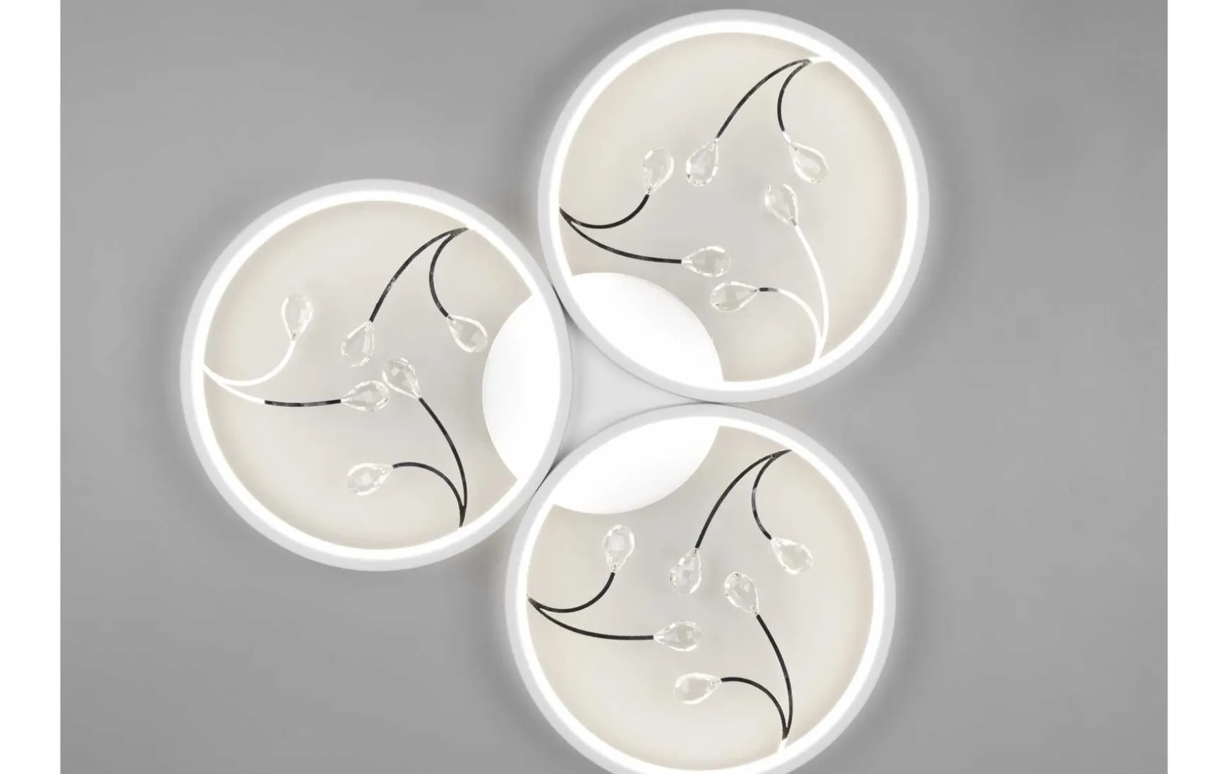Die drei aneinander gereihten Lichtkreise dieser Deckenleuchte zaubern das gewisse Etwas in Ihren Wohnbereich. Die feinen gläsernen Elemente innerhalb der Kreise sorgen für einen eleganten Touch und werden zum wahren Dekoelement an Ihrer Decke. Über einen integrierten SWITCH-Dimmer lässt sich die Helligkeit, der verbauten LEDs, über einen Lichtschalter in drei Stufen regulieren. Die formvollendete Optik in Weiß matt fügt sich durch ihre Schlichtheit in viele Einrichtungsstile ein.