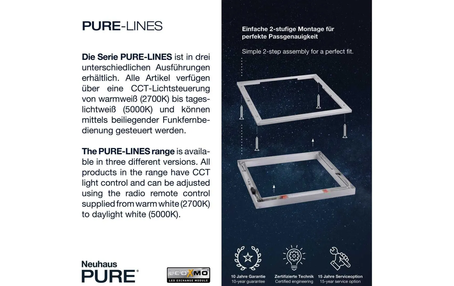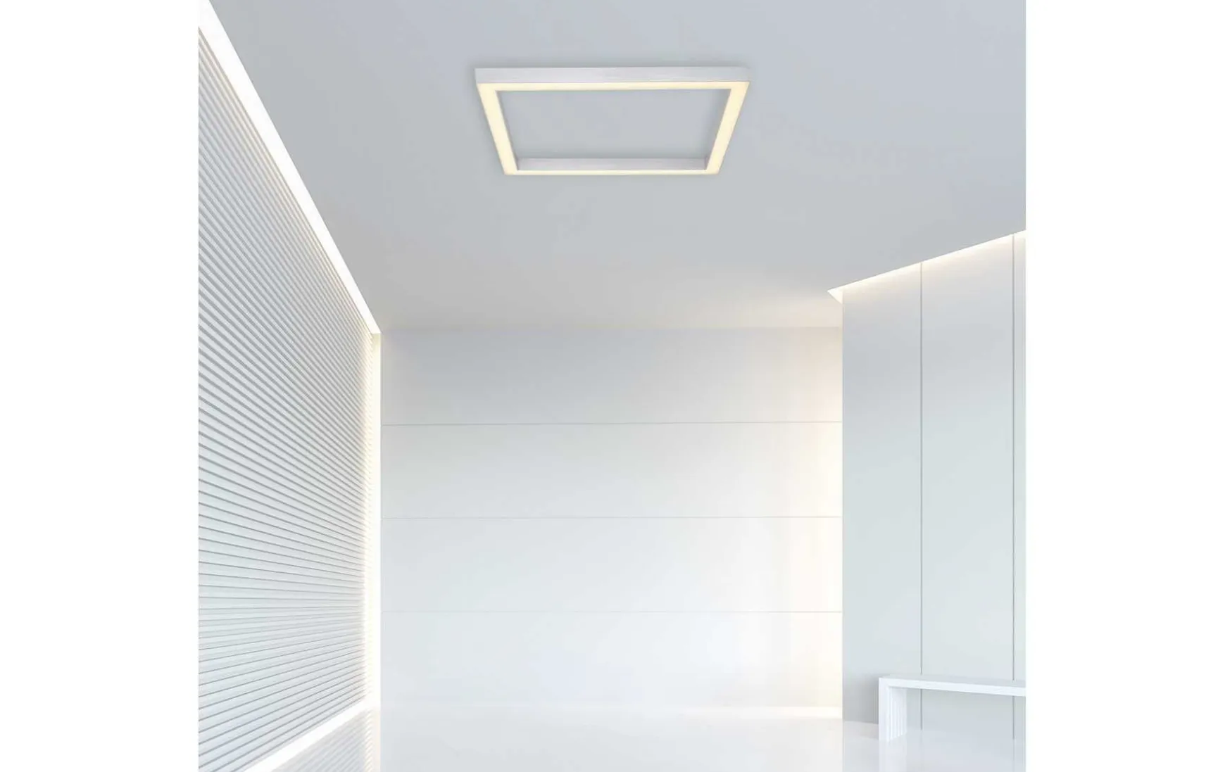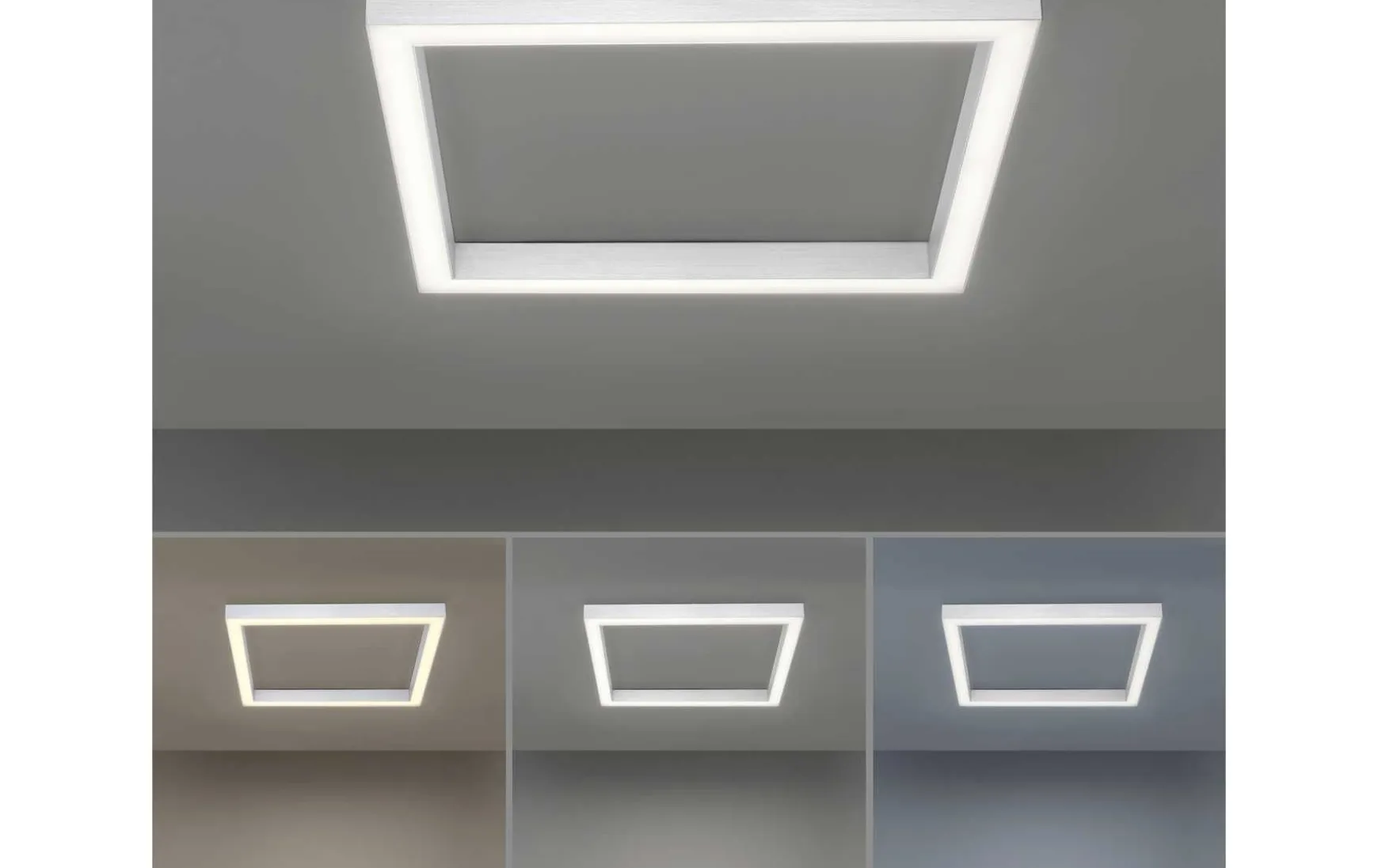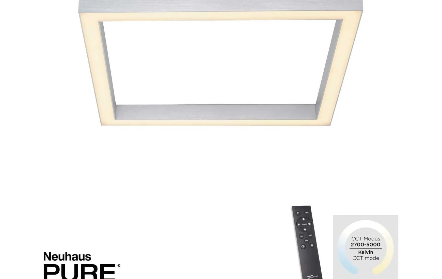 Die stringente Geradlinigkeit der quadratischen LED Deckenleuchte gepaart mit minimalem Materialeinsatz überzeugt auf ganzer Linie! Vermissen Sie hier etwa den Deckenkasten? Nein? Wir auch nicht! Die ästhetisch ausgewogene Leuchtenkreation in der Ausführung aluminium-silber ist ausgestattet mit einem CCT-Farbmanagement (von warmweiß über tageslichtweiß bis hin zu kaltweiß), welches sich über die mitgelieferte Funk-Fernbedienung steuern lässt. Die Lichtintensität lässt sich durch die Fernbedienung verstellen. Ebenso ist eine Memory-Funktion installiert, so dass sich die Leuchte beim erneuten Einschalten automatisch in die zuletzt gewählte Einstellung schaltet.
