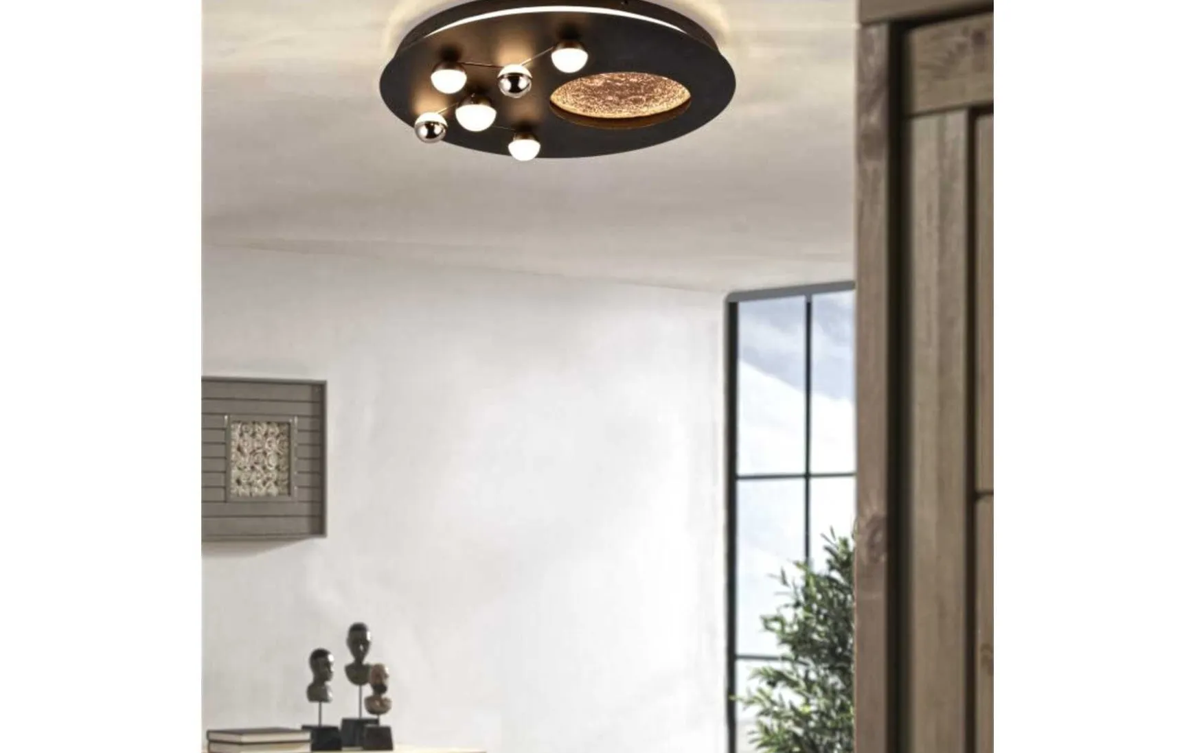 Entdecken Sie diese Deckenleuchte die den Mond in greifbare Nähe bringt! Mit einem außergewöhnlichen Design, das ein Sternenbild sowie den Mond in einem beeindruckenden 3D-Effekt zeigt, wird diese Leuchte zu einem wahren Blickfang und einem eigenständigen Dekoelement in Ihrem Schlafzimmer. Die sanfte indirekte Beleuchtung erzeugt ein blendfreies, behagliches Licht, das zum Träumen und Entspannen einlädt. Mittels DIP SWITCH können Sie zudem drei verschiedene Lichtfarben über einen Schalter direkt an der Leuchte einstellen. Der integrierten SWITCH Dimmer ermöglicht es Ihnen, die Helligkeit mit einem herkömmlichen Lichtschalter in drei Stufen (100%, 50% und 25%) einzustellen. Die ZODIAC beeindruckt mit ihrem besonderen Metall-Design in Schwarz matt und fügt sich nahtlos in jedes vorhandene Interieur ein.