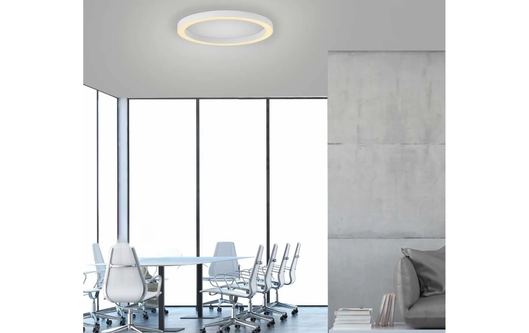 Die weiße Deckenleuchte mit einem Durchmesser von 50 cm wird mit einer Funk-Fernbedienung geliefert.