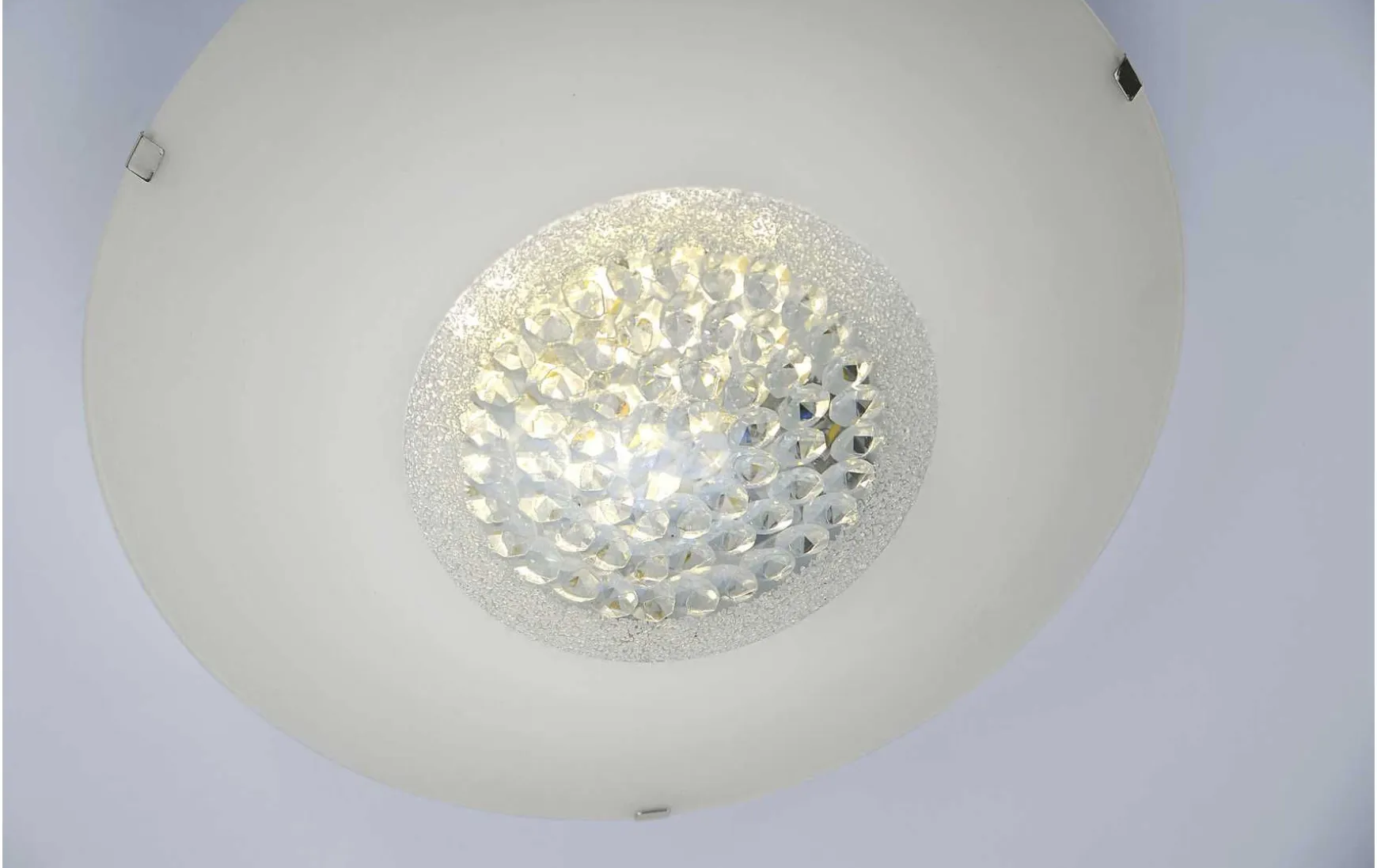 Die runde Deckenleuchte hat ein klassisches Design. Satiniertes Glas mit Kristalleinsatz sorgt für ein angenehmes Licht ohne Blendung. Sie verfügt über ein integriertes LED-Leuchtmittel und sorgt mit einer warmweißen Farbe für eine angenehme Atmosphäre in Ihrem Wohnzimmer. Darüber hinaus ist es mit der intelligenten Switchmo-Technologie ausgestattet. Durch das Vier-Stufen-Dimmen kann die Helligkeit des Lichts durch wiederholtes Drücken des Lichtschalters von 100 % auf 60 %, dann auf 40 % und dann auf 10 % gedimmt werden. Dank der verwendeten LED-Technologie ist die Lampe äußerst energieeffizient und überzeugt durch ihre niedrige Temperatur und lange Lebensdauer.