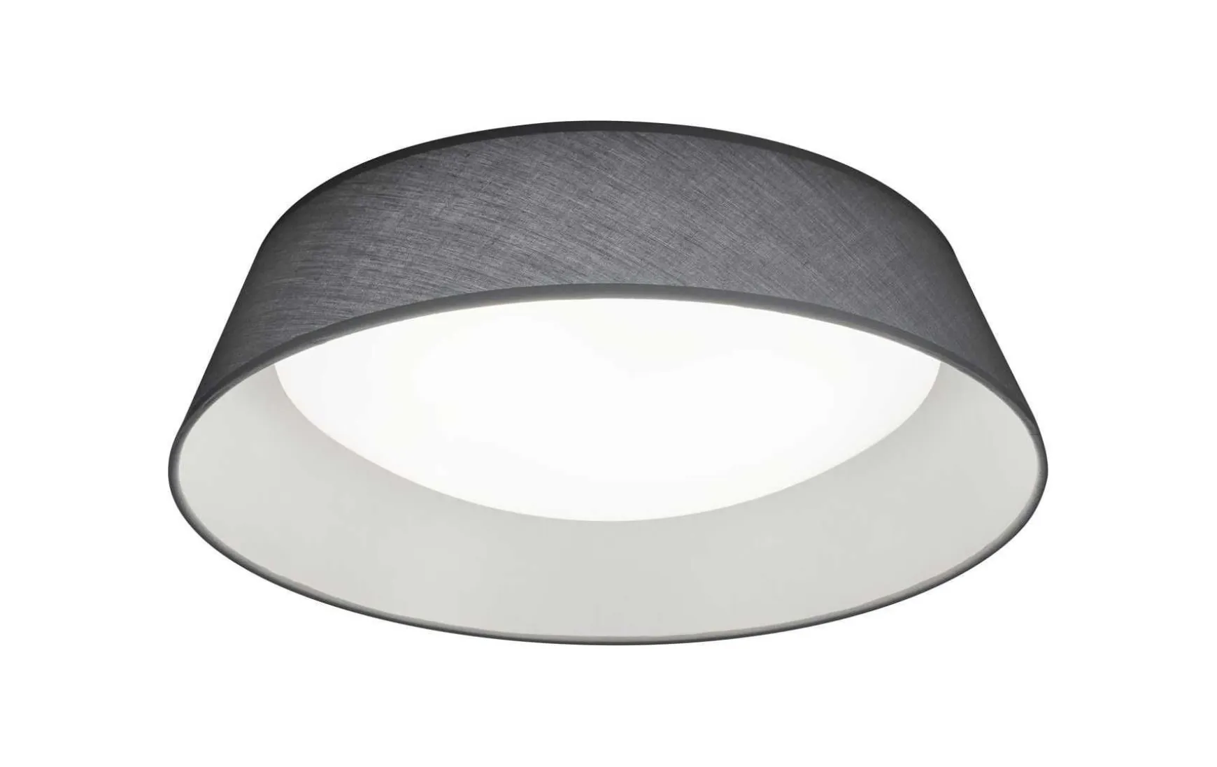 Die Basis und gleichzeitig Lichtaustrittsfläche der Deckenleuchte ist aus Kunststoff gefertigt und wird von einem schlichten Textilschirm umgeben.