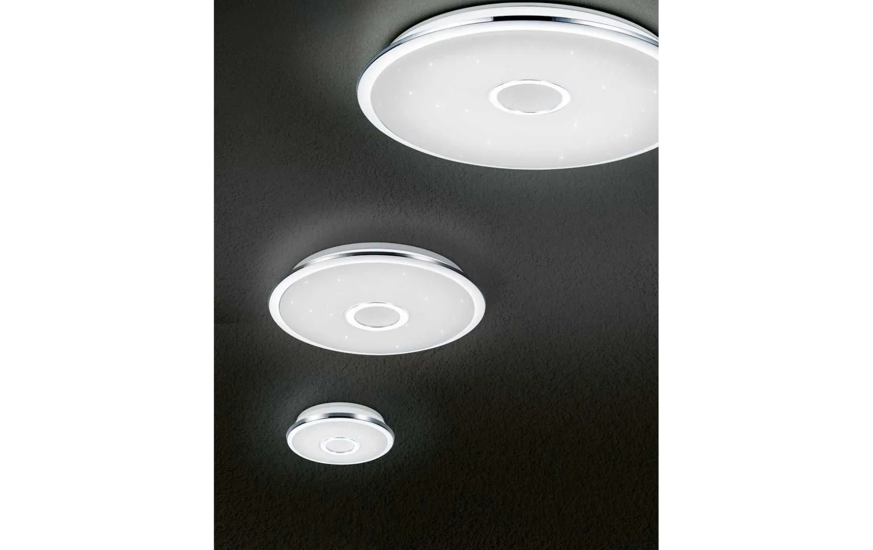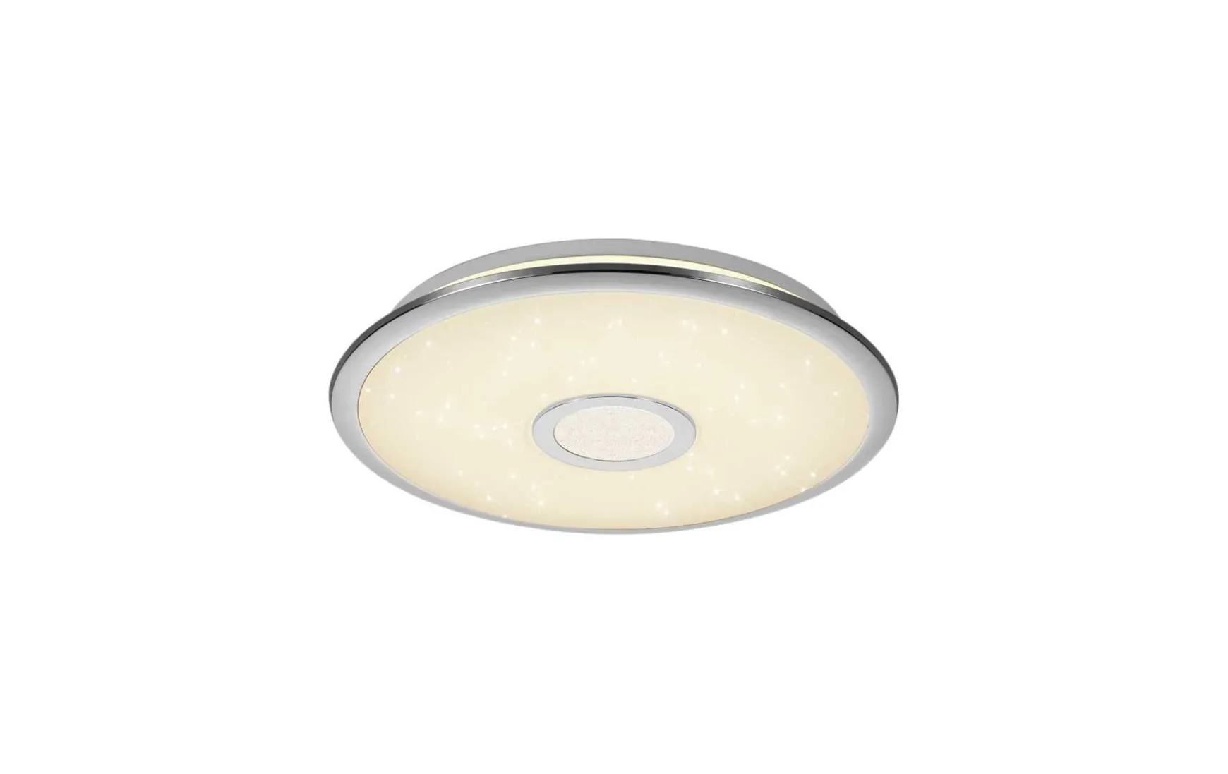 Diese einzigartige Deckenleuchte verspricht Lichtdesign in vollendeter Form. Die runde LED Leuchte ist ein wahrer Verwandlungskünstler und erfüllt Ihnen jeden Lichtwunsch. Mit ihrem ansprechenden Design und dem 42 cm großen Durchmesser wird die Leuchte schnell zum neuen Blickfang in Ihrem Wohnraum. Die Deckenleuchte hat eine Höhe von 7,5 cm.. Die runde Form komplettiert dabei das harmonische Erscheinungsbild. Einem funkelnden Sternenhimmel gleich, verfügt diese Deckenleuchte über eine Vielzahl an Funktionen. So ist sie dimmbar und wurde mit einem Farbtemperaturwechsler (3000K bis 5500K) und einem Nachtlicht ausgestattet. Beim Aktivieren des Nachtlichts kommt der Sternhimmel Effekt besonders gut zur Geltung. Diese Funktionen sind alle bequem über die im Lieferumfang enthaltene Fernbedienung steuerbar und erhöhen so den Wohlfühlfaktor in Ihren Räumen. Die Einsatzmöglichkeiten dieser Deckenleuchte sind unglaublich vielfältig: Ob als stylische Deckenbeleuchtung in Fluren und Dielen, als zeitgemäße Deckenlampe im Wohnzimmer oder als tolle Designerlampe in Ihrem Schlafzimmer. Durch die Kombination aus chromfarbigem Gehäuse und dem weißen Schirm lässt sich die Leuchte mit weiteren verschiedenen Farbkonzepten kombinieren und macht somit ein Integrieren in Ihr Zuhause wunderbar einfach. Darüber hinaus verfügt die Leuchte über eine moderne LED Technologie, die sich durch eine hohe Lichtqualität und Energieeffizienz auszeichnet. Im Vergleich zu herkömmlichen Halogen Leuchtmitteln lassen sich bis zu 80% der Energiekosten sparen. Zusätzlich haben LED Lichtquellen eine lange Lebensdauer, produzieren weniger Wärme und schonen die Umwelt.