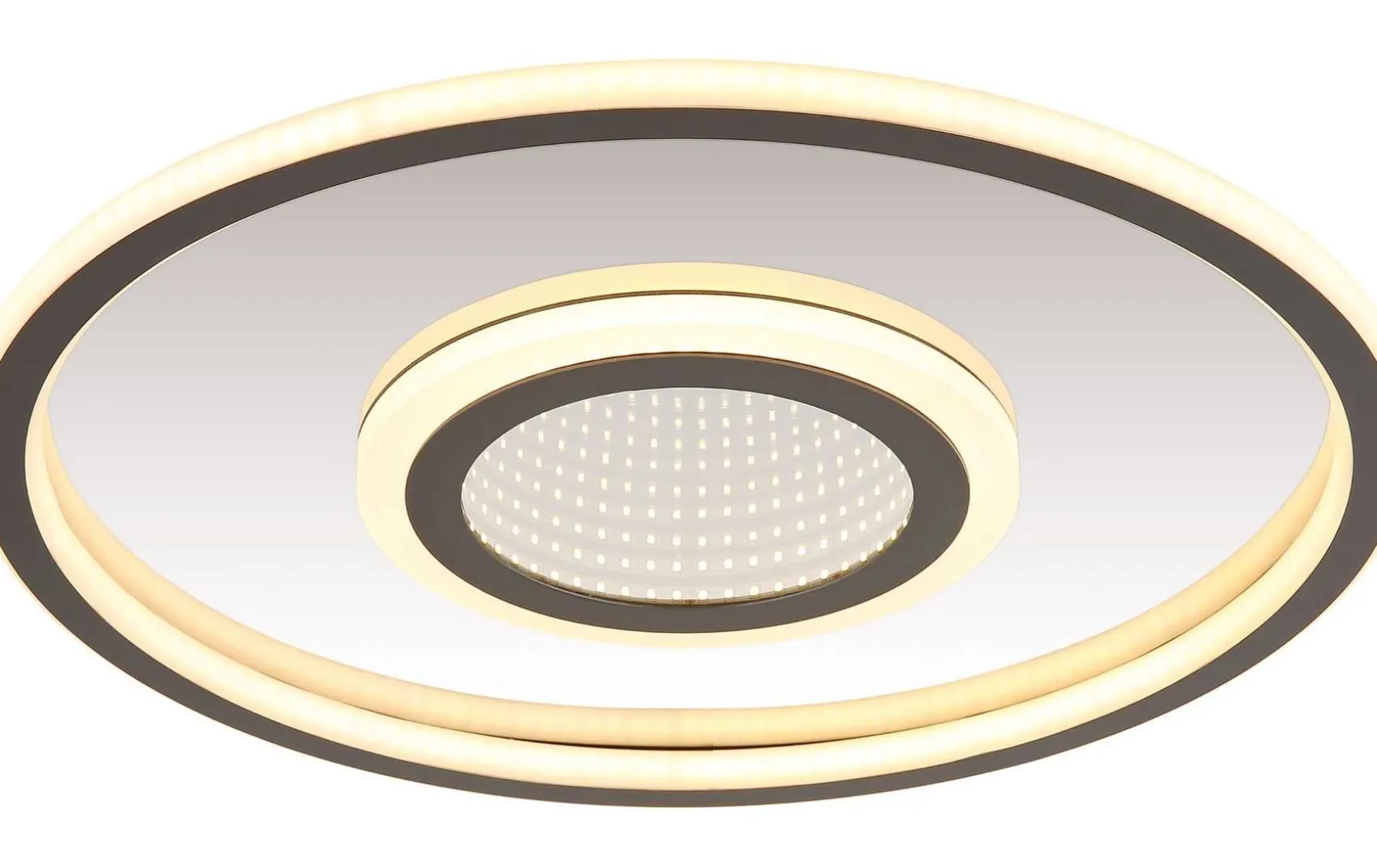 Diese Deckenleuchte beeindruckt durch ihr modernes Design und den faszinierenden 3D-Effekt. Diese runde Deckenleuchte verfügt über einen Spiegel im Inneren, der in Kombination mit den LEDs einen einzigartigen 3D-Effekt erzeugt. Der Korpus aus grauem, mattem Metall und Edelstahl mit verspiegelter Oberfläche verleiht der Leuchte eine elegante und zeitlose Optik. Der Schirm aus grauem, mattem Aluminium, opalem Kunststoff und verspiegeltem Acryl rundet das stilvolle Design ab. Mit einem Durchmesser von 432 mm und einem warmweißen Licht mit 3000 K schafft die Leuchte eine angenehme Atmosphäre in jedem Raum. Die Deckenleuchte bietet eine praktische Memoryfunktion und drei Beleuchtungsstufen: alle LEDs zusammen, nur der äußere Ring oder nur der innere Ring. Diese vielseitigen Einstellungen ermöglichen es Ihnen, die Beleuchtung perfekt an Ihre Bedürfnisse anzupassen. Die Deckenleuchte ist die ideale Wahl für moderne Wohnräume, die sowohl Funktionalität als auch ein beeindruckendes Design erfordern.