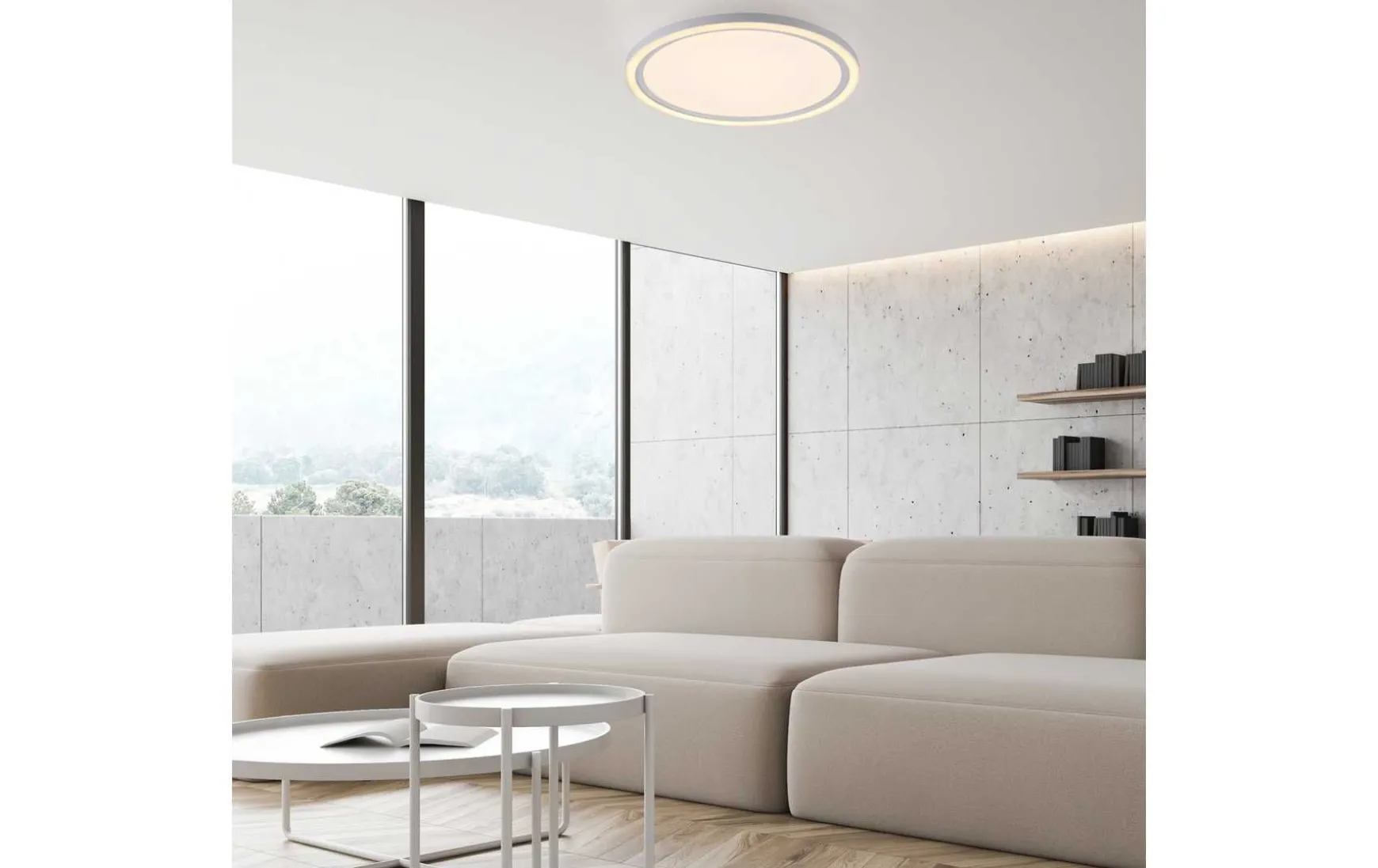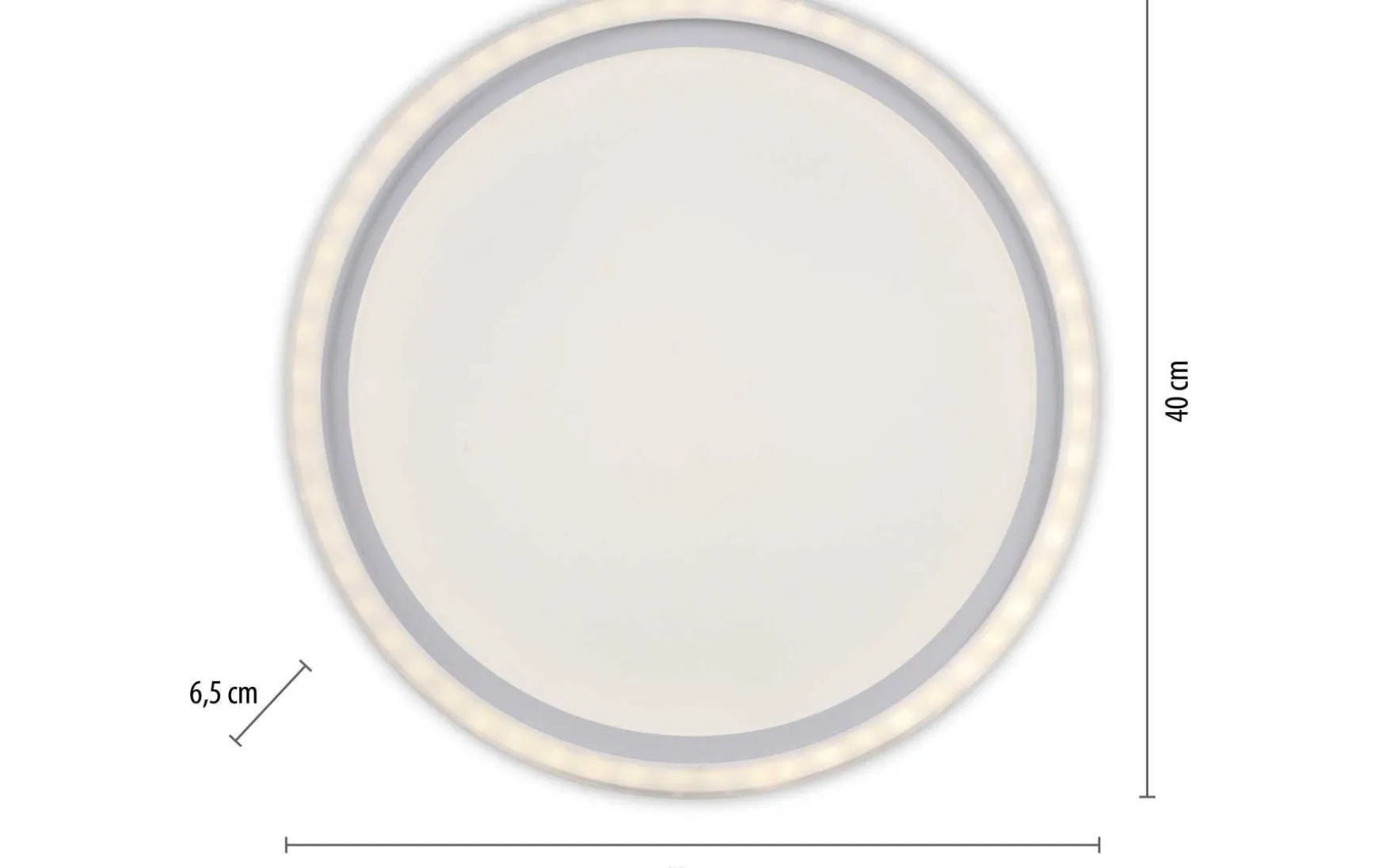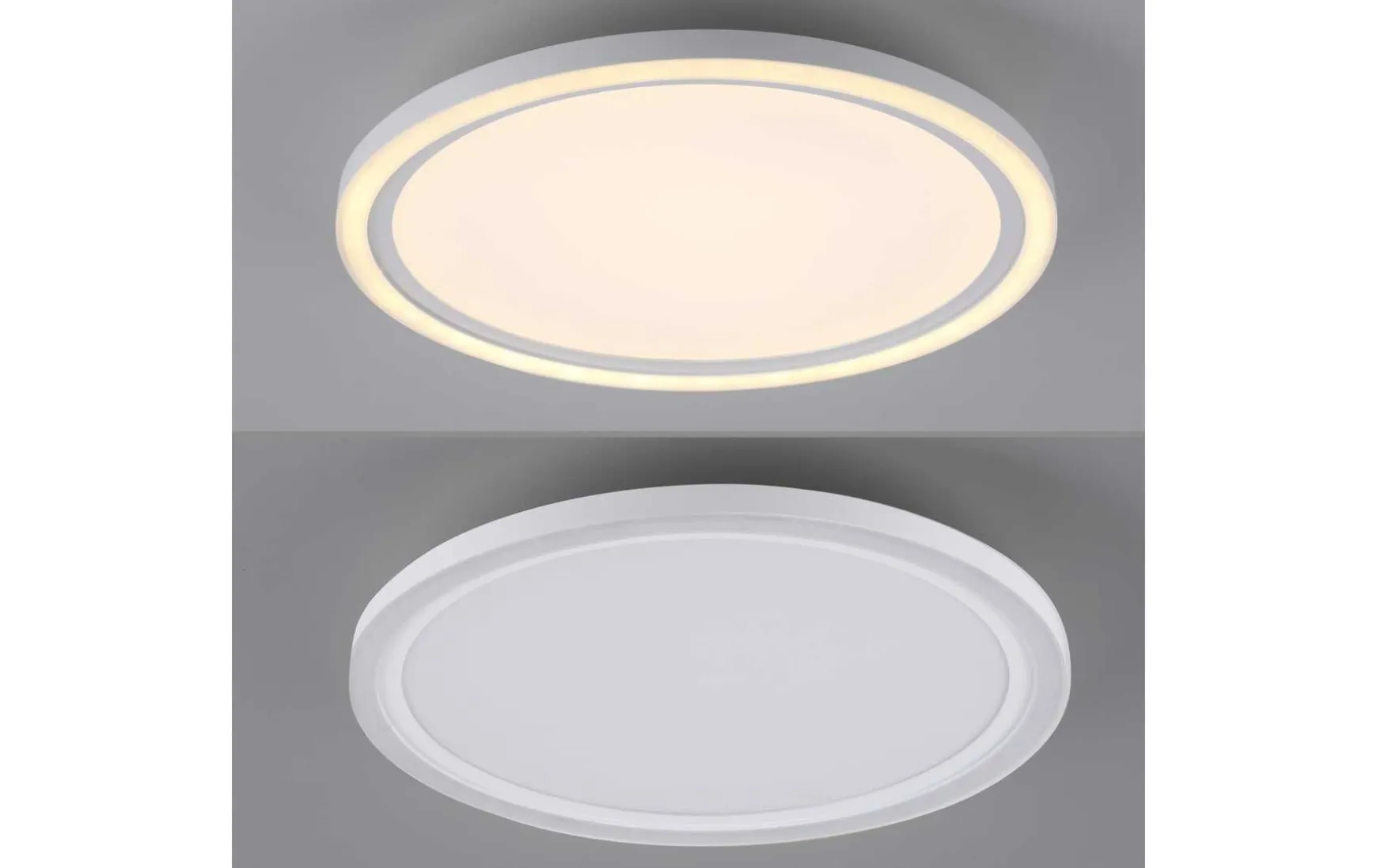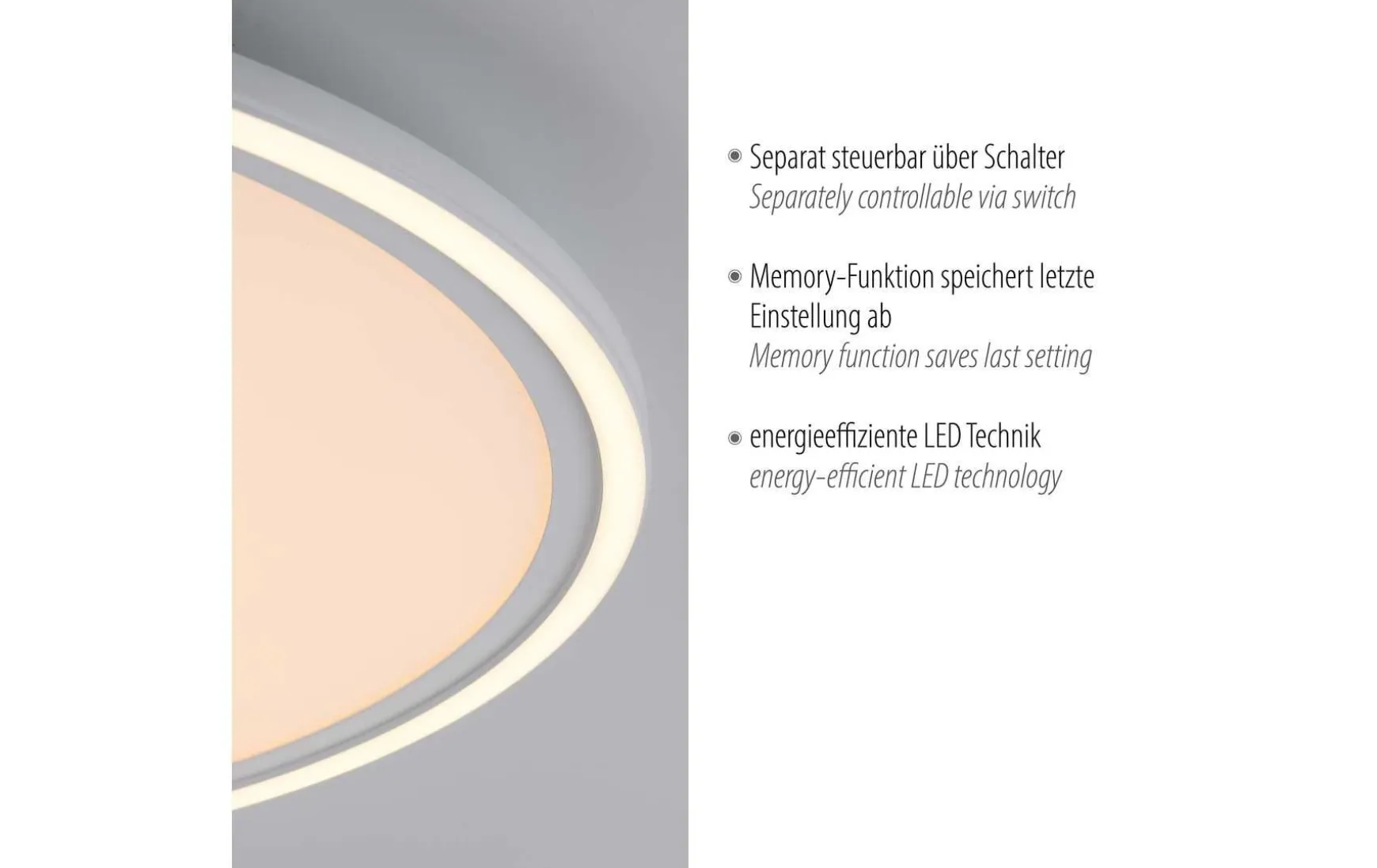 Das runde LED Panel überzeugt durch ein schlichtes, zeitloses Design. Die energiesparende LED Deckenleuchte wird mit zwei warmweißen LED Leuchtmitteln geliefert. Die weiße Leuchte ist mit einem Serienschalter ausgestattet, der es ermöglicht per Lichtschalter die Lichtquellen separat schalten. Schalten Sie das Paneel zum ersten Mal ein und aus, dann erstrahlt die komplette Deckenbeleuchtung. Beim zweiten Mal ein- und ausschalten des Deckenpaneels, leuchtet nur der äußere Rand der Leuchte und beim dritten Mal ein- und ausschalten, erstrahlt lediglich der innere Bereich der Deckenlampe. Durch die Memoryfunktion bleiben die zuletzt gewählten Einstellungen solange erhalten bis man eine Veränderung vornimmt. Dank der weißen Kunststoffoberfläche gibt das LED Paneel ein softes und angenehmes Licht wieder. Durch die verwendete LED Technik ist die Deckenleuchte nicht nur energiesparend – sie überzeugt auch durch die hohe Lebensdauer als auch die geringe Wärmeentwicklung.