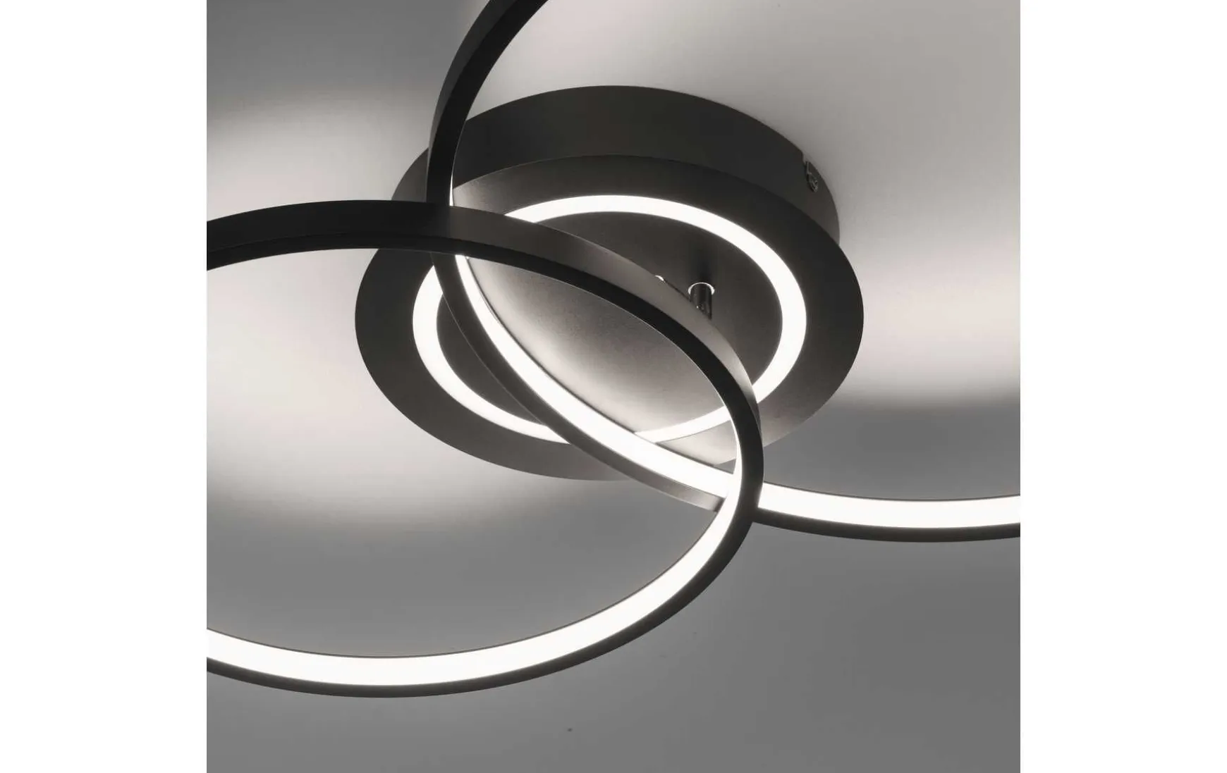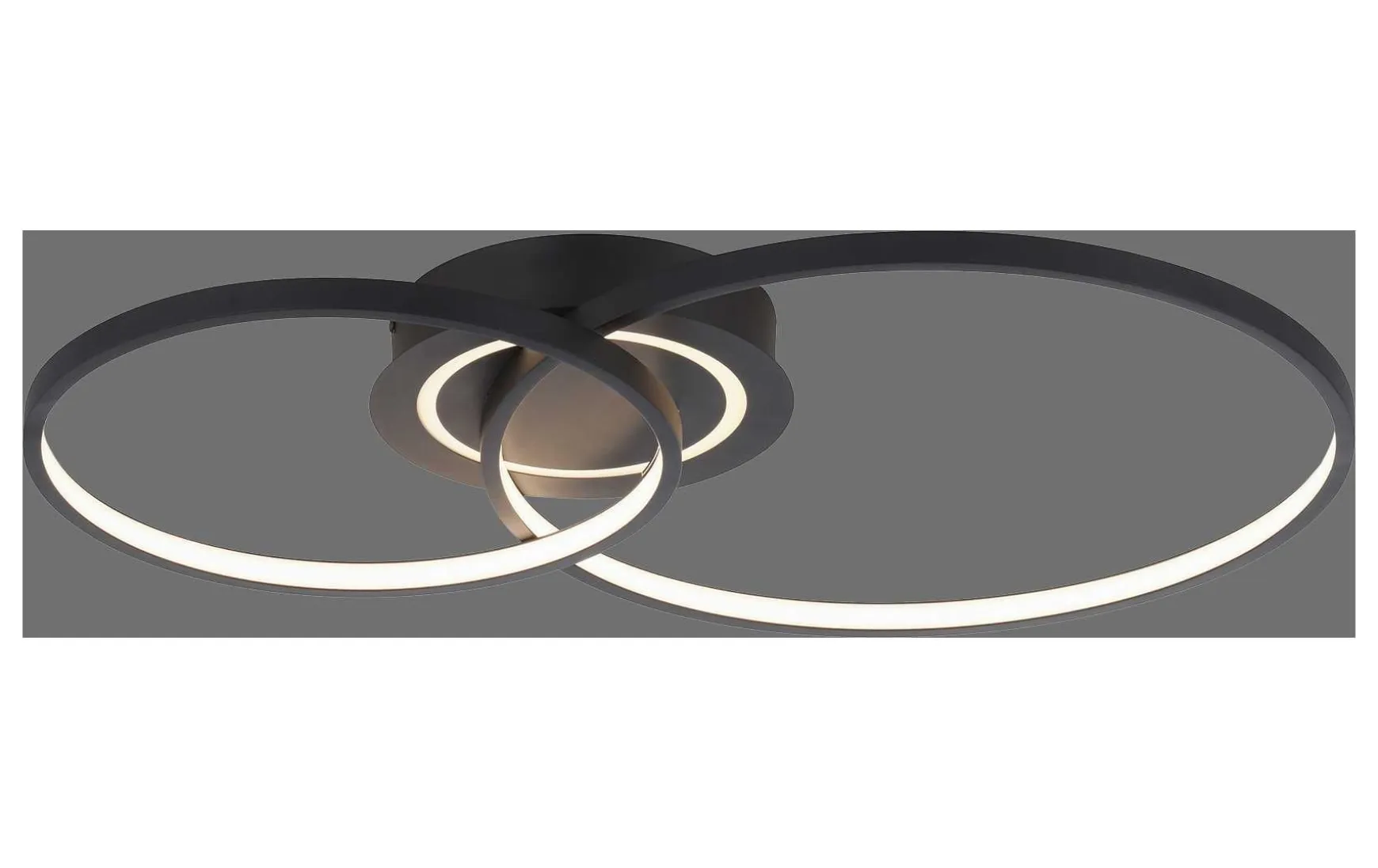 Die schwarze LED Deckenleuchte überzeugt durch ein modernes Ring-Design. Die energiesparende LED Deckenleuchte wird mit zwei warmweißen LED Leuchtmitteln geliefert. Per Lichtschalter kann man die Lichtquellen der Leuchte getrennt voneinander schalten. Schaltet man die Leuchte zum ersten Mal an dann erstrahlt die Deckenleuchte in vollständigen Licht. Beim zweiten Mal schalten, leuchten nur die beiden Lichtringe und beim dritten Mal nur der Deckenkasten. Durch die Memoryfunktion bleibt die zuletzt gewählten Einstellung solange erhalten bis man eine Veränderung vornimmt. Der kleinere Lichtring der Leuchte ist drehbar und so kann man die Form individuell verändern und so ein komplett anderes Gesamtbild der Deckenleuchte erstellen.