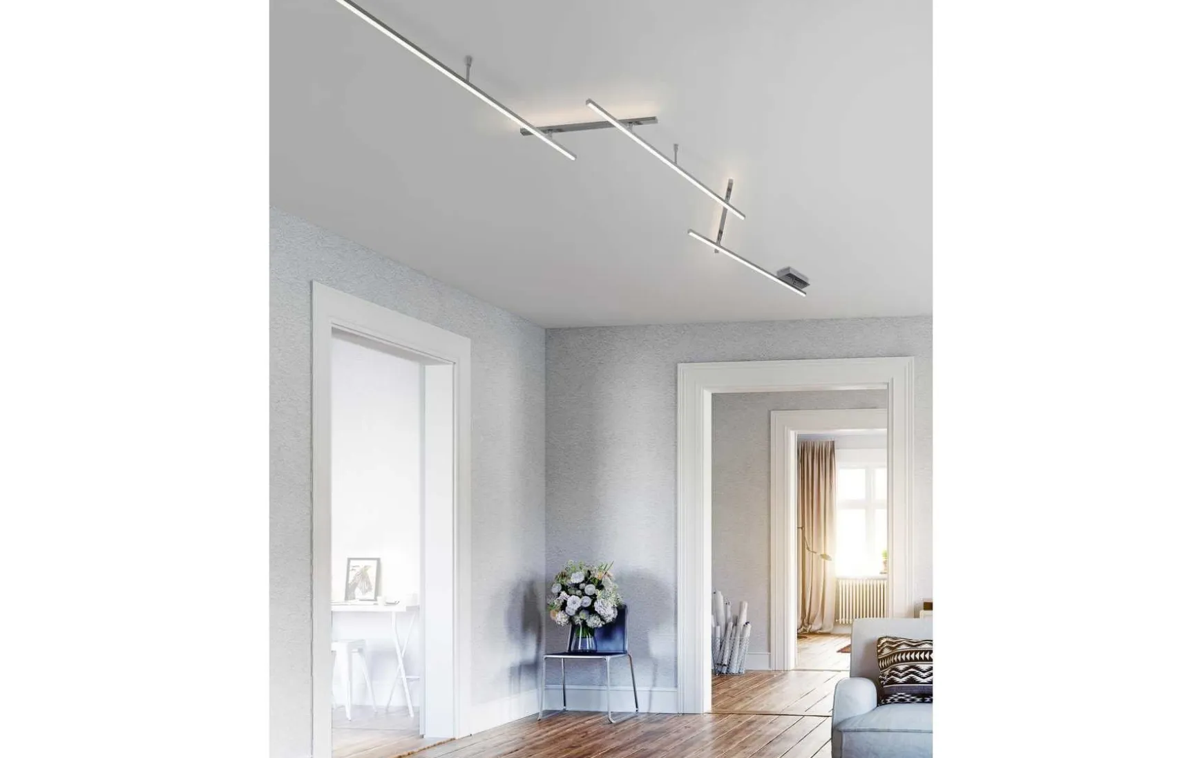 Die außergewöhnliche Leuchte verfügt über drei längerer Elemente bei denen sich die Lichtaustrittsfläche nach unten gerichtet befindet und zwei kürzere Elemente bei denen die Lichtaustrittsfläche nach oben gerichtet ist.