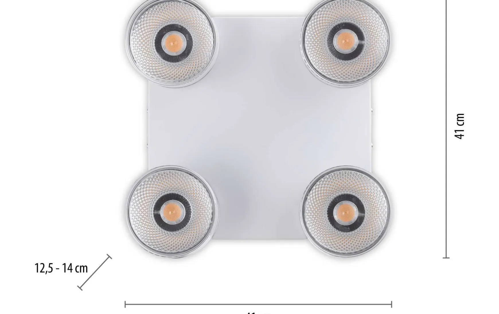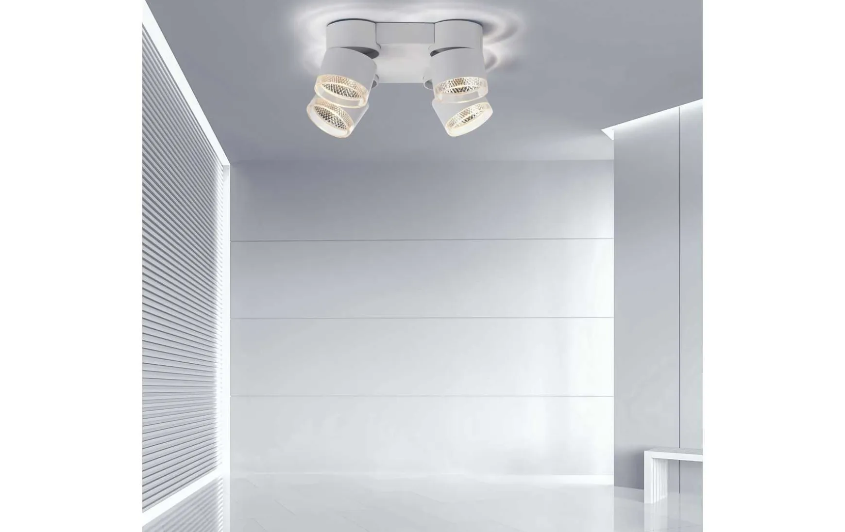 Die Deckenleuchte wird mit vier warmweißen LED Leuchtmitteln geliefert. Jeder Spot ist bis zu 350° drehbar und um 90° schwenkbar.