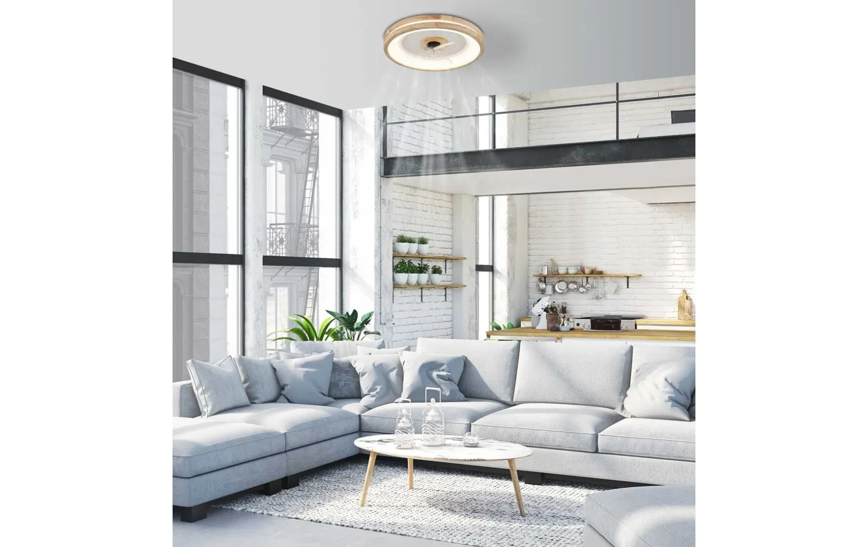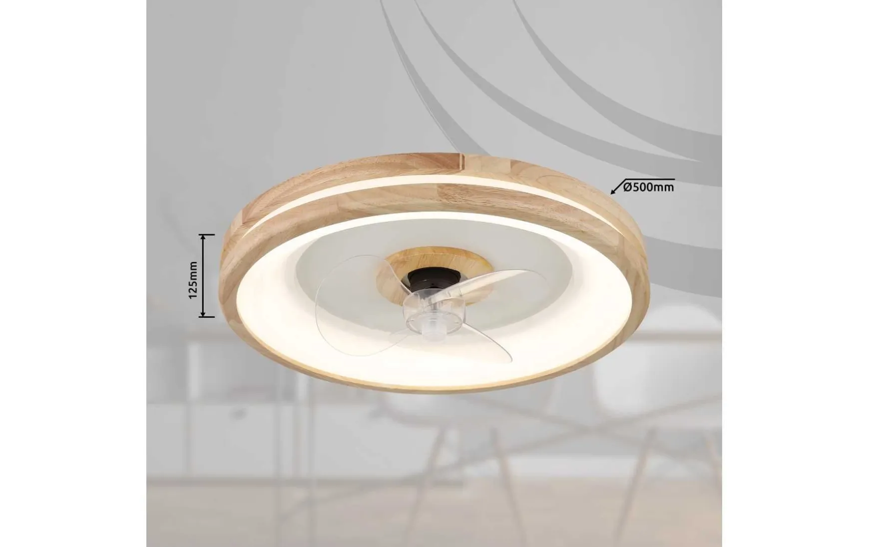 Dieser Deckenventilator ist die perfekte Lösung für warme Sommertage und kalte Wintertage. Sein rundes Design und der Holzrahmen verleihen ihm einen natürlichen und modernen Look, der zu jedem Einrichtungsstil passt. Der Ventilator befindet sich in der Mitte des Deckenventilators und sorgt für angenehme Luftzirkulation.