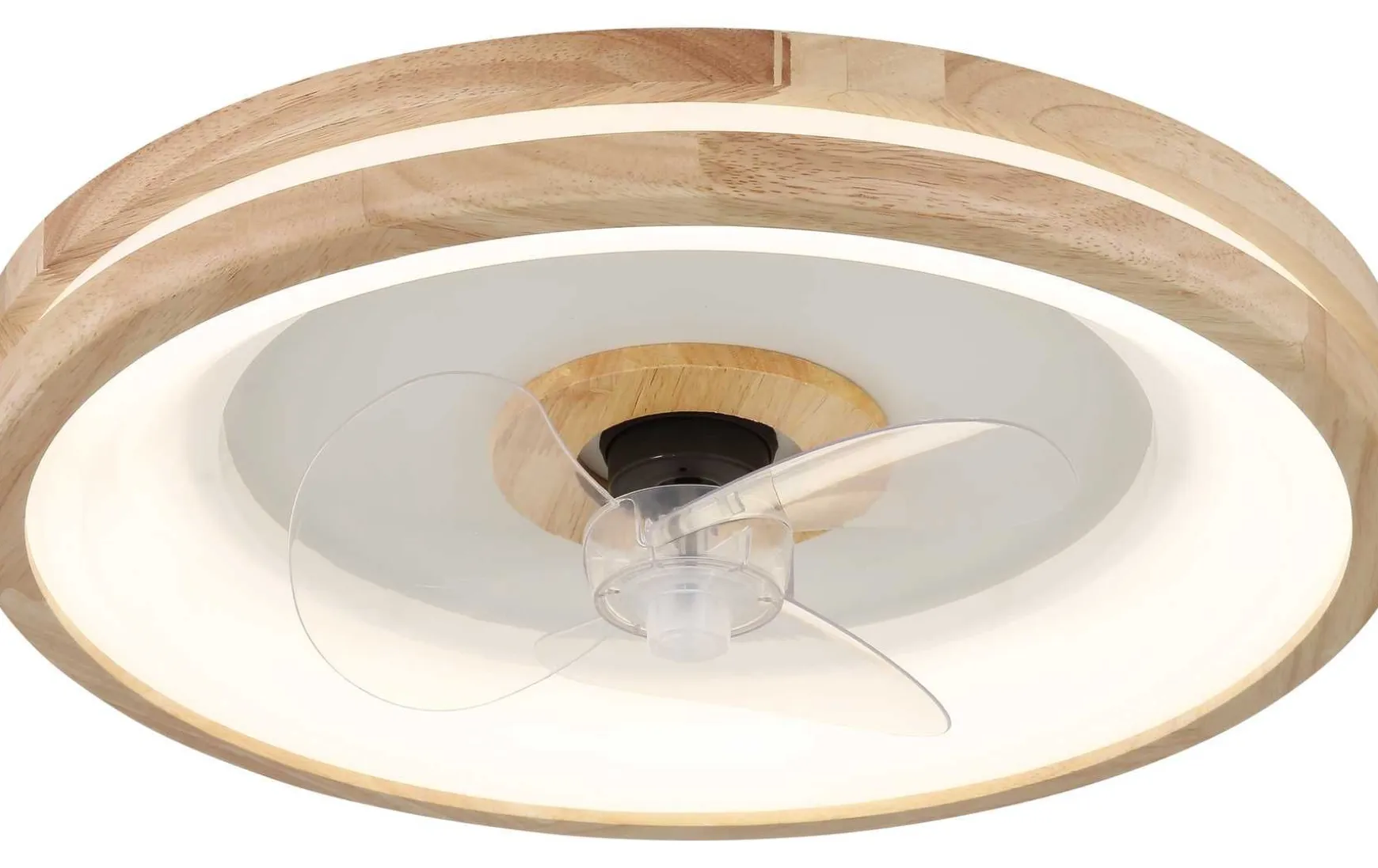 Der Schirm des Deckenventilators besteht aus opalem und transparentem Kunststoff und sorgt für eine gleichmäßige und blendfreie Beleuchtung.