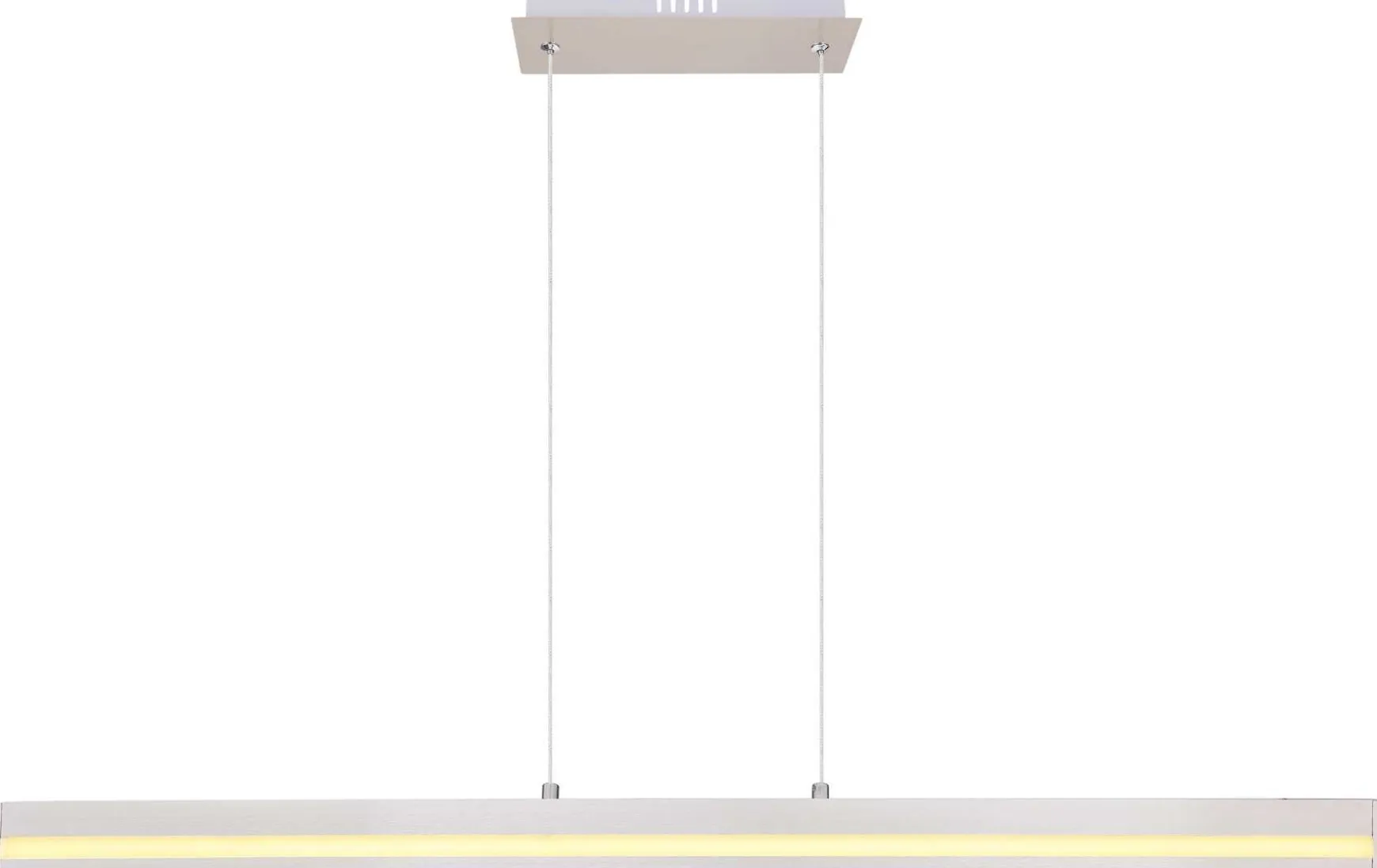 Diese Leuchte ist eine moderne und stilvolle Pendelleuchte aus Metall mit Details aus opalweißem Kunststoff. Die längliche Stange ist 8 cm breit und 101 cm lang.