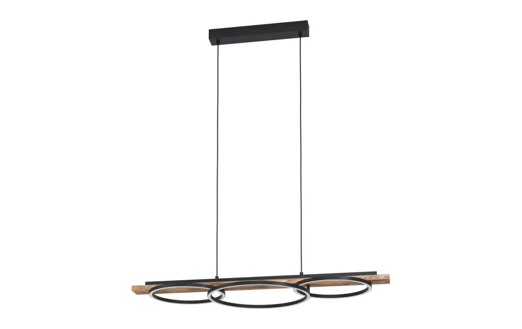 Die LED Pendelleuchte ist aus geflammtem Holz gefertigt und mit drei schwarzen, runden Metall-Profilen kombiniert.