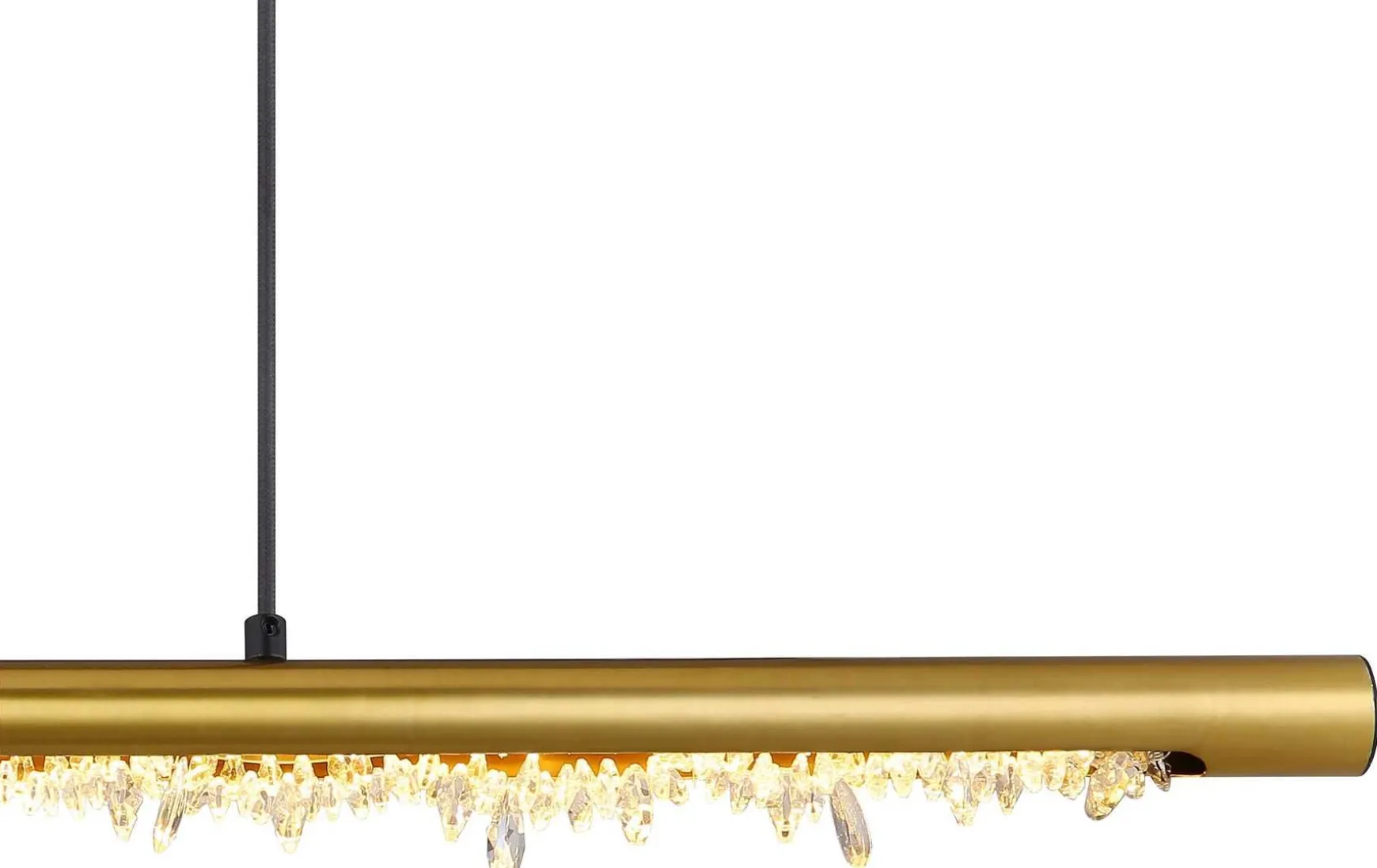 Sie besteht aus einem Metallstab, der an der Unterseite mit wunderschönen Acrylkristallen versehen ist und an zwei Kabeln bis zu 150 cm von der Decke hängt.