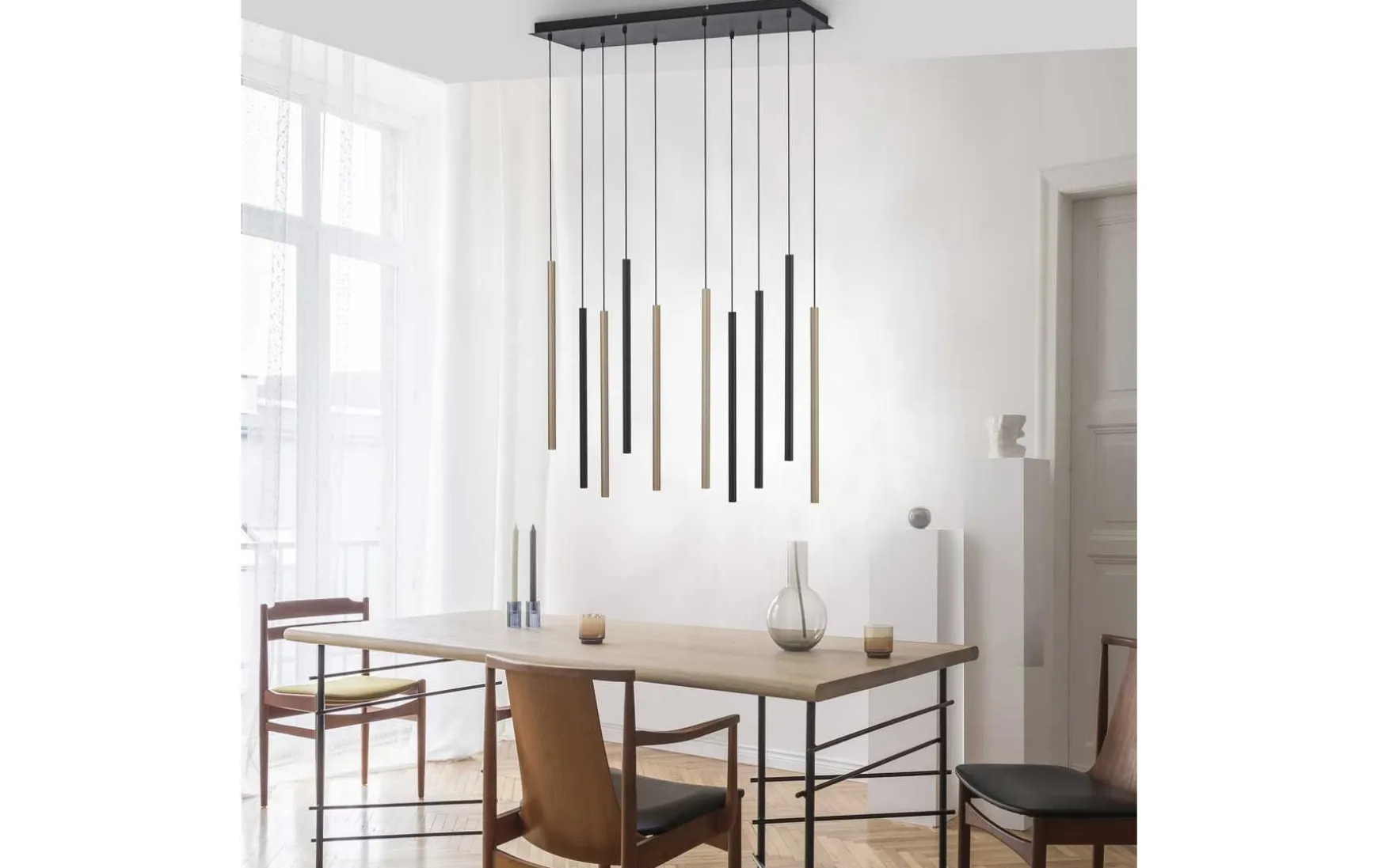 Diese Pendelleuchte fügt sich mit einem minimalistischen Erscheinungsbild gekonnt in Ihrem Wohnumfeld ein. Von der schwarzen Deckenbefestigung hängt ein einzelnes, filigranes Leuchtrohr in gebürsteten Schwarz herunter, das mit einem warmweißen LED Leuchtmittel bestückt ist. Die Pendelleuchte wirkt unscheinbar aber wird sicherlich zum Highlight über Ihren Esstisch.
