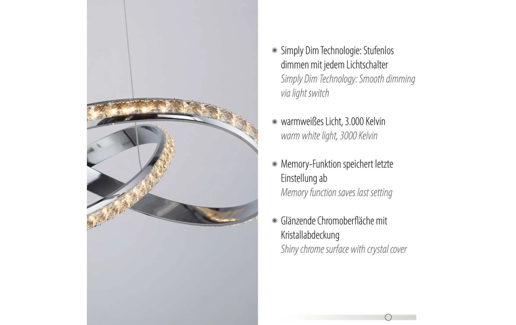 Diese LED Pendelleuchte überzeugt mit einer besonderen Form. Die geschwungene aus Eisen gefertigte Pendelleuchte in der Farbe Chrom wirkt mit einer Farbtemperatur von 3000 Kelvin angenehm warmweiß. Die Leuchte ist mit der neuen stufenlosen Dimmer-Technologie „simply dim“ ausgestattet. Simply dim macht es möglich, dass man die Leuchte über einen vorhandenen Lichtschalter, ganz egal ob Kipp-, Zug-, Schnur- oder Wandschalter, dimmen kann. Die Dimmer-Technologie steuert die Helligkeit über den Schaltimpuls und so kann die Leuchte von 100% bis runter auf 10% der Lichtintensität stufenlos gedimmt werden. Wird die Leuchte weniger als 3sec nach dem Ausschalten wieder angeschaltet, startet der Dimmvorgang. Hat sie den hellsten (100%) bzw. dunkelsten Wert (10%) erreicht, verweilt sie ca. 2sec auf dieser Einstellung, um den Vorgang abermals zu starten. Erstrahlt die Leuchte während eines Vorgangs in der gewünschten Helligkeit, kann man durch Ausschalten der Leuchte die Lichtintensität abspeichern. Schaltet man die Leuchte nun wieder an, scheint die Leuchte in der gespeicherten Helligkeit und diese Einstellung bleibt erhalten. Die Pendelleuchte ist mit einer Memoryfunktion ausgestattet so dass die letzte Einstellung der Leuchte gespeichert bleibt bis man die Einstellung wieder verändert. Durch die Kristallabdeckung gibt die Leuchte ein schönes Lichtspiel wieder.