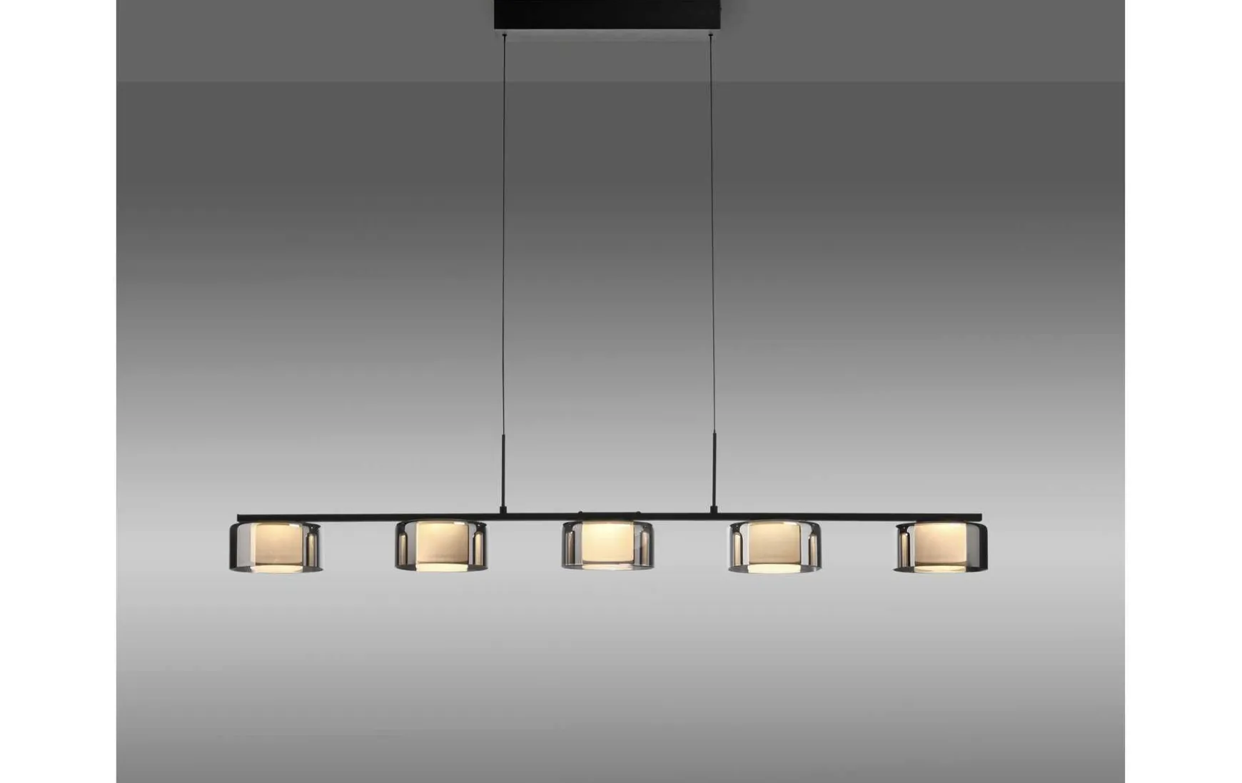 Durch die fünf Rauchgläser und die warmweißen LED-Leuchtmittel (3000K) gibt die Leuchte ein sanftes Licht wieder und schafft so eine einladende Atmosphäre über Ihren Esstisch. Die Comfort-Lift Funktion ermöglicht eine einfache Höhenverstellung. Dank des verbauten Mechanismus im Baldachin sind lästige Gegengewichte kein Thema mehr. Das Höhenverstell-System macht es Ihnen einfach und schnell möglich die Höhe der Leuchte flexibel Ihren Wohnräumen anzupassen. Die Pendelleuchte ist mit der SimplyDim-Technologie ausgestattet. Diese Funktion ermöglicht es Ihnen die Leuchte ganz einfach über den vorhandenen Lichtschalter in der Lichtintensität zu dimmen. Die Dimmer-Technologie steuert die Helligkeit über den Schaltimpuls und so kann die Leuchte von 100% bis runter auf 10% der Lichtintensität stufenlos gedimmt werden. Wird die Leuchte weniger als 3sec nach dem Ausschalten wieder angeschaltet, startet der Dimmvorgang. Hat sie den hellsten (100%) bzw. dunkelsten Wert (10%) erreicht, verweilt sie ca. 2sec auf dieser Einstellung, um den Vorgang abermals zu starten. Erstrahlt die Leuchte während eines Vorgangs in der gewünschten Helligkeit, kann man durch Ausschalten der Leuchte die Lichtintensität abspeichern. Schaltet man die Leuchte nun wieder an, scheint die Leuchte in der gespeicherten Helligkeit und diese Einstellung bleibt erhalten. So besteht die Möglichkeit sich sein gewünschtes Licht nach den Bedürfnissen anzupassen und schnell wieder abzurufen.