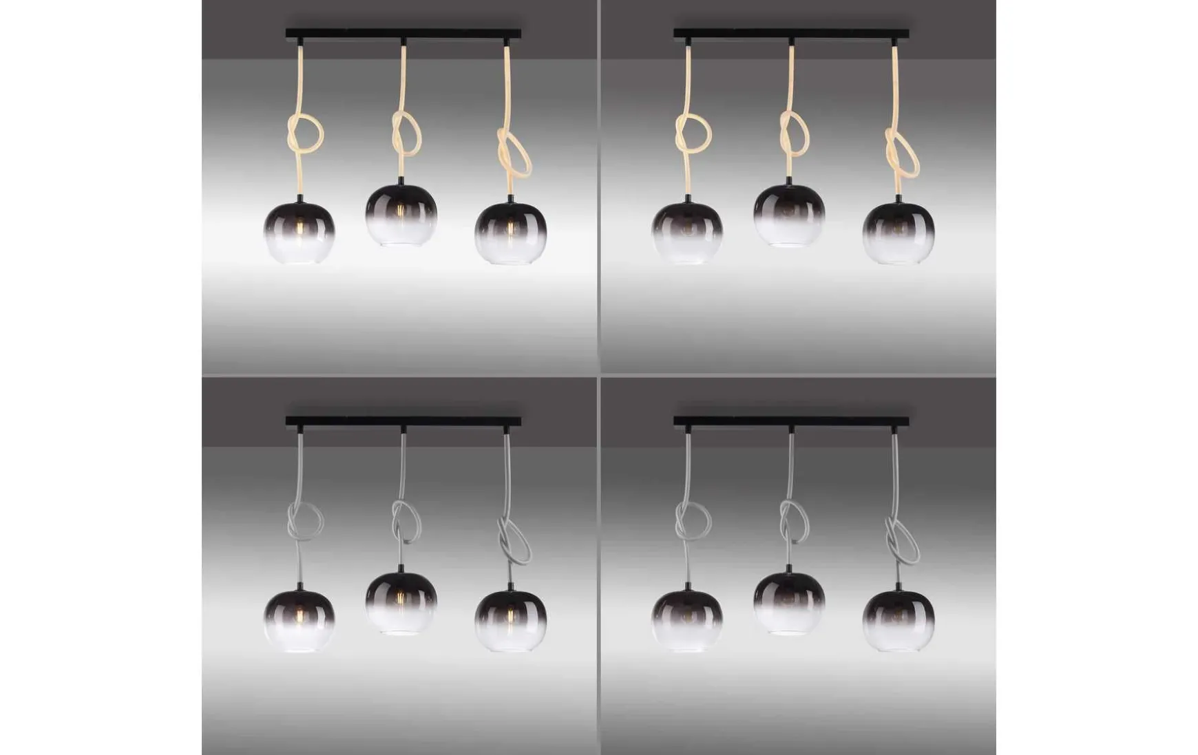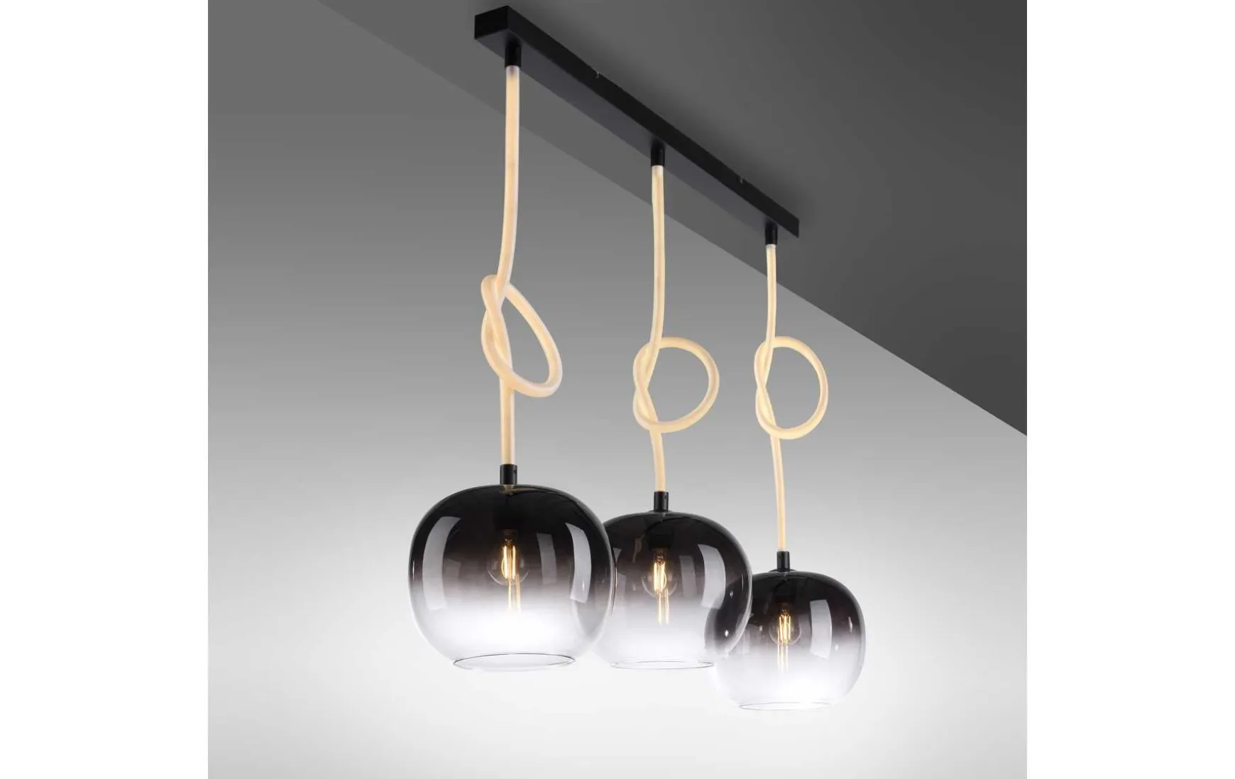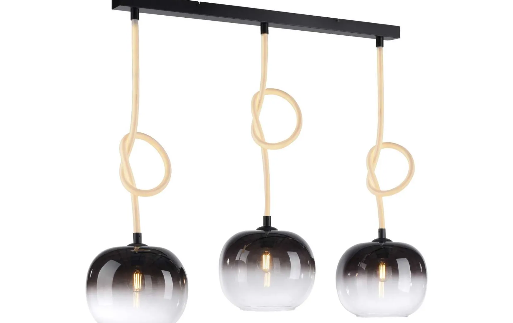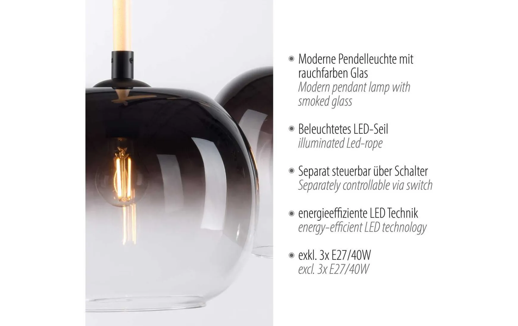 Entdecken Sie die faszinierende Welt des Lichts mit der 3-flammigen LED Pendelleuchte. Mit ihrem modernen Design setzt diese Leuchte neue Maßstäbe in puncto Stil. Die Pendelleuchte besticht durch ihr elegantes schwarzes Finish, das jedem Raum eine edle Note verleiht. Das Besondere an dieser Leuchte sind die beleuchteten Seile, das sie umgibt. Die sanft schimmernde Seile erzeugt eine einzigartige Atmosphäre und setzen einen modernen Akzent in Ihrem Wohnbereich. Die drei Rauchgläser der Leuchte sorgen für eine blendfreie und angenehme Lichtverteilung. Das Licht wird sanft gestreut, wodurch ein harmonisches und stimmungsvolles Ambiente entsteht. Die Leuchte verfügt über zwei verschiedene Lichtquellen, die unabhängig voneinander geschaltet werden können. So haben Sie die Möglichkeit, die Beleuchtung individuell an Ihre Bedürfnisse anzupassen. Ein weiteres Highlight der Pendelleuchte ist die flexible Abhängung. Durch das Verknoten der Seile kann die Abhängung variiert werden. Sie bietet Platz für eine drei herkömliche E27-Glühbirne mit jeweils eine maximalen Leistung von 40 Watt sowie drei integrierte LED Boards. Dadurch erhalten Sie eine helle und effiziente. Beleuchtung, die gleichzeitig Energie spart. Tauchen Sie Ihre Räume in ein faszinierendes Lichtspiel und schaffen Sie eine einladende Atmosphäre.