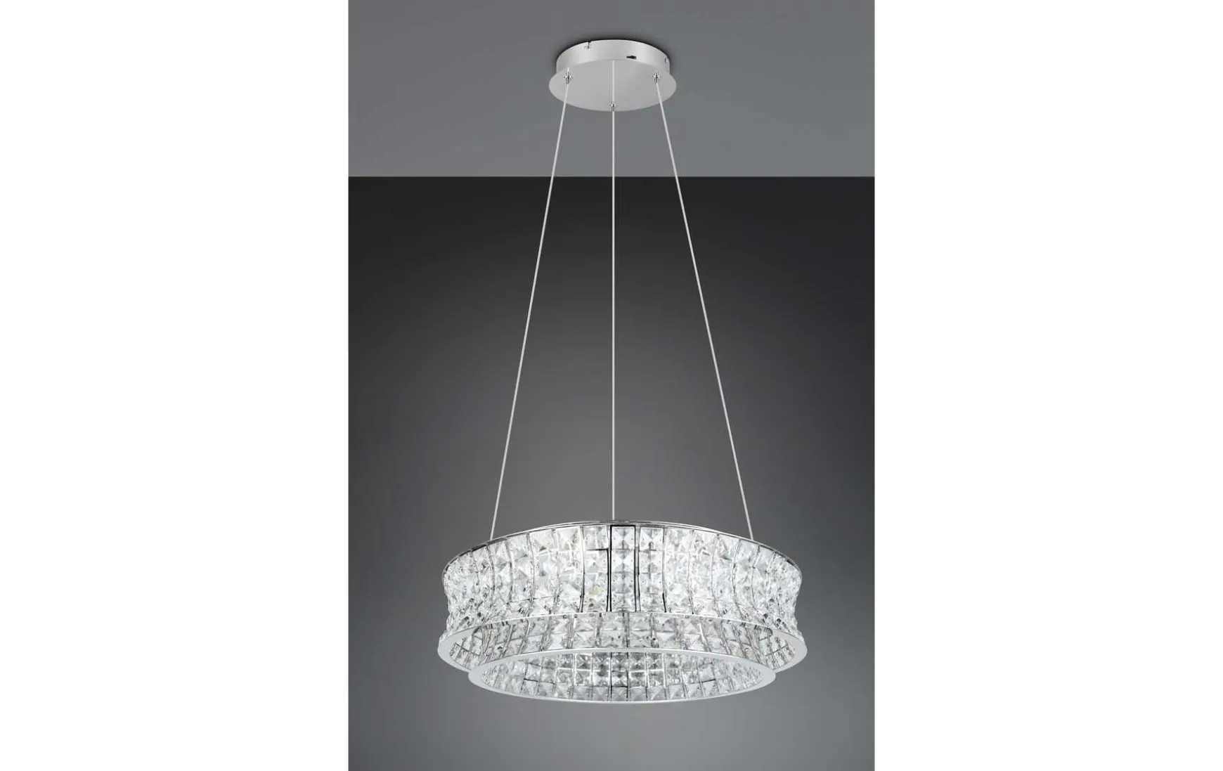 Die Leuchte kombiniert feine, lichtbrechende Kristalle mit glänzendem Metall in Chromoptik.