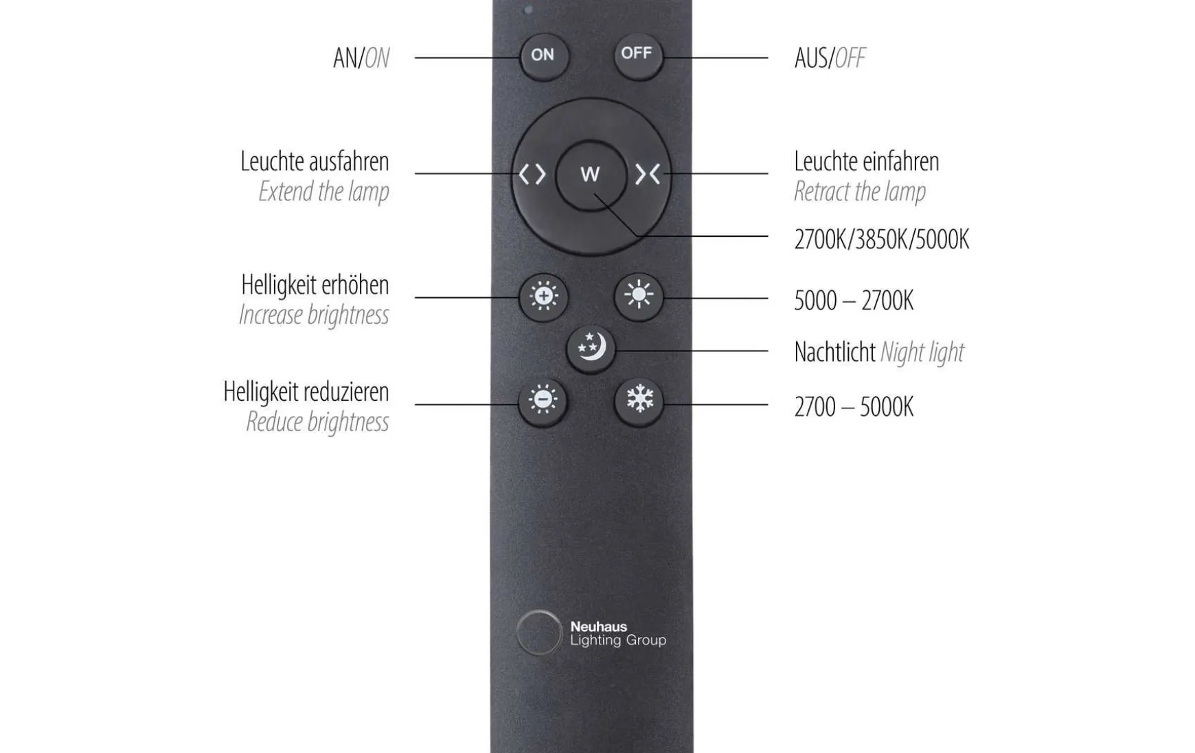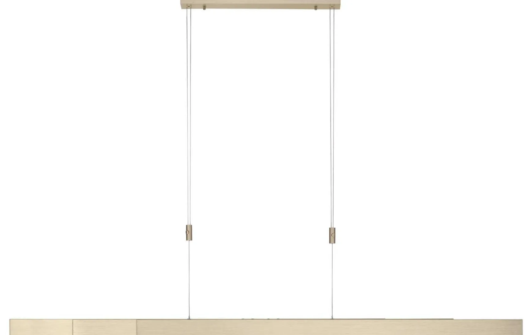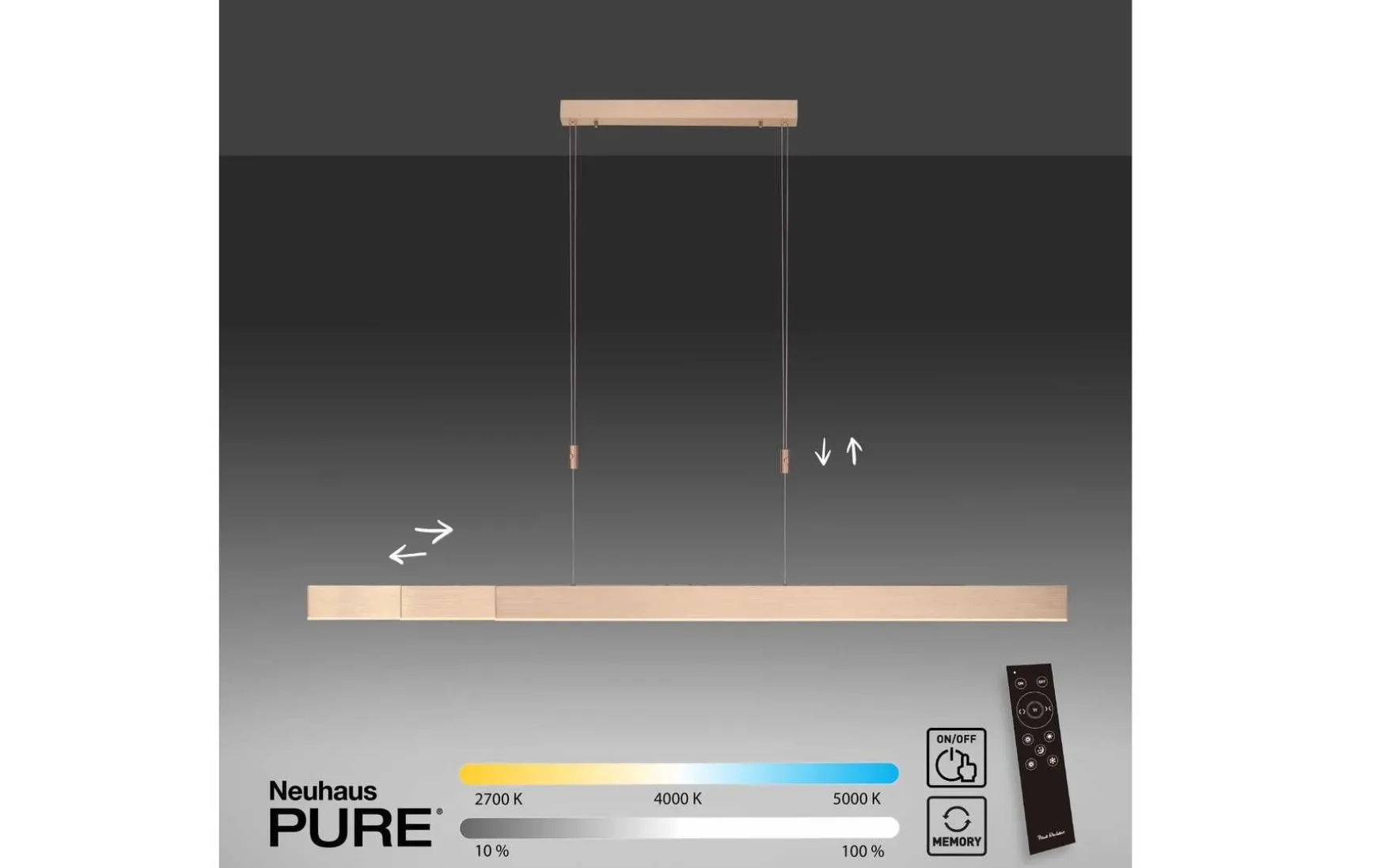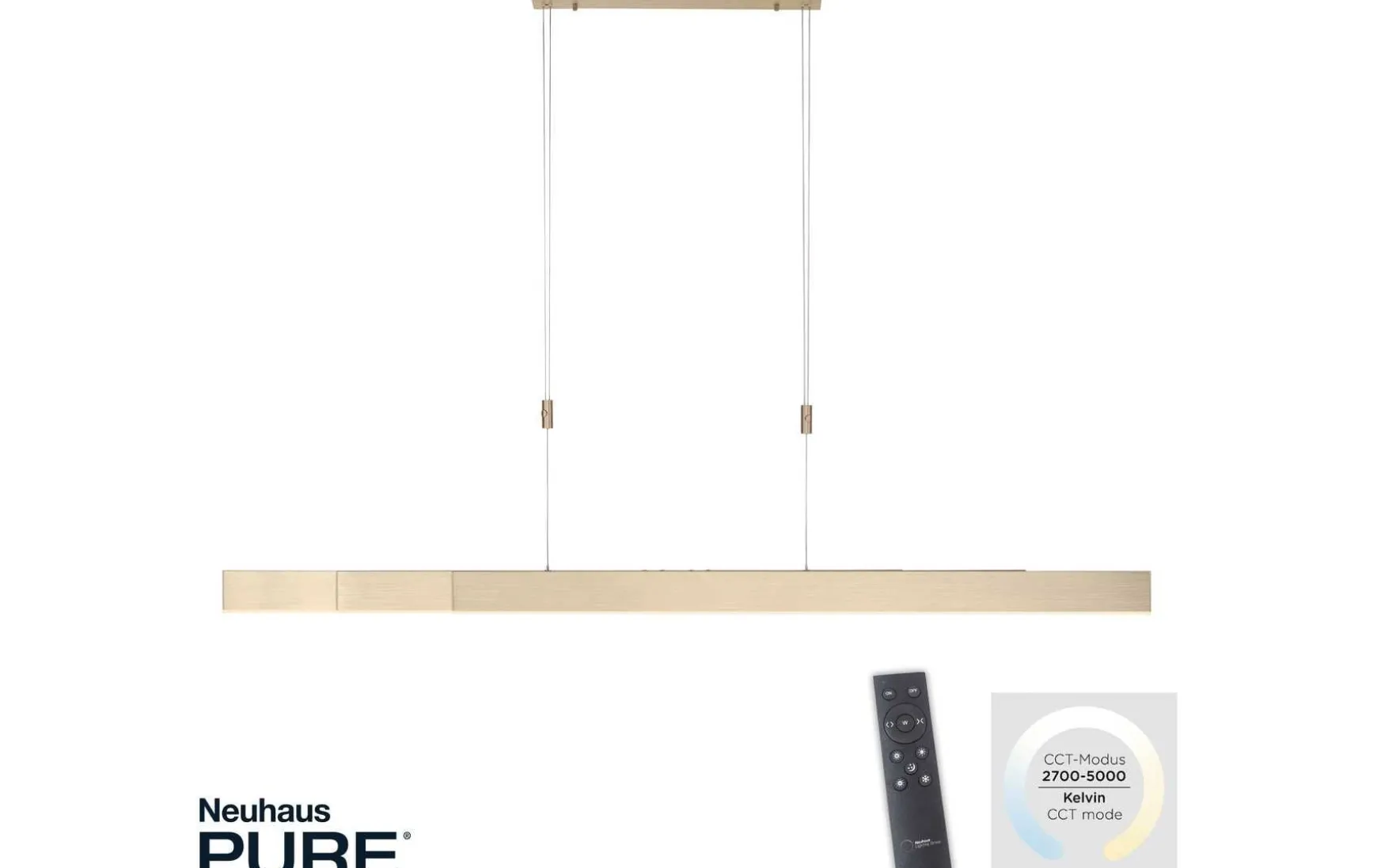 Die Messing mattfarbene LED Pendelleuchte überzeugt mit einer besonderen Funktionalität. Die nach unten strahlende Pendelleuchte verfügt durch ihren neuartigen e-SLIDE® -Antrieb über ein Höchstmaß an Flexibilität. Mittels Funk-Fernbedienung oder über die Sensortasten an der Oberseite des Leuchtbalkens lässt sich die Leuchte elektrisch betrieben in Ihrer Ausdehnung von 120,0 – 200,0 cm strecken bzw. zusammenschieben. Die PURE-MOTO verfügt über eine stufenlose CCT-Lichtsteuerung von warmweiß (2700K) bis neutralweiß (5000K). Diese Steuerung erfolgt ebenfalls über die Fernbedienung oder über die Sensortasten der Touchfläche. Dank der Memoryfunktion bleiben die zuletzt gewählten Einstellungen immer so lange erhalten bis man eine neue Einstellung vornimmt. Das alles macht die Leuchte zu einer besonderen Attraktion über ausziehbaren Esstischsituationen. Die Höhe der Pendelleuchte kann nach Wünschen auch eingestellt werden.